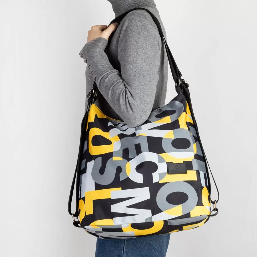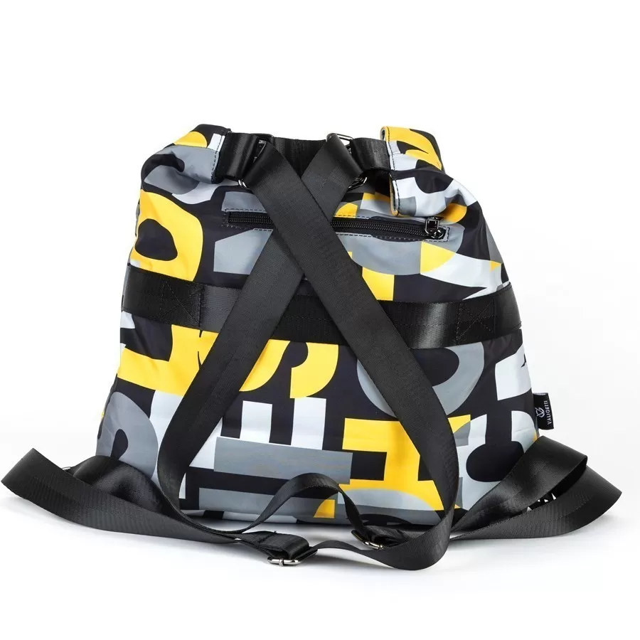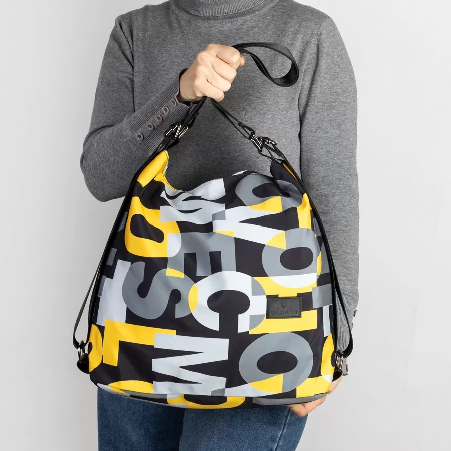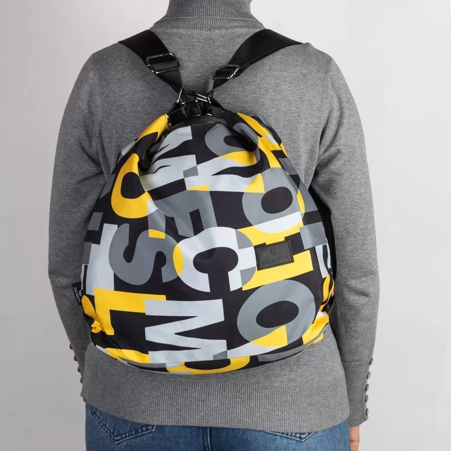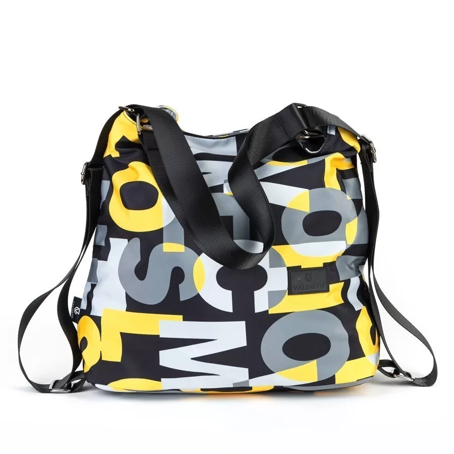 Стильная женская сумка-рюкзак бренда Valigetti из текстиля с ярким дизайном. Имеет регулируемый текстильный плечевой ремешок, перестегивающийся в лямки для ношения на спине. Внутри основного отделения под молнией карман на молнии и 2 кармашка для мелких вещей. На задней стороне имеется карман на молнии