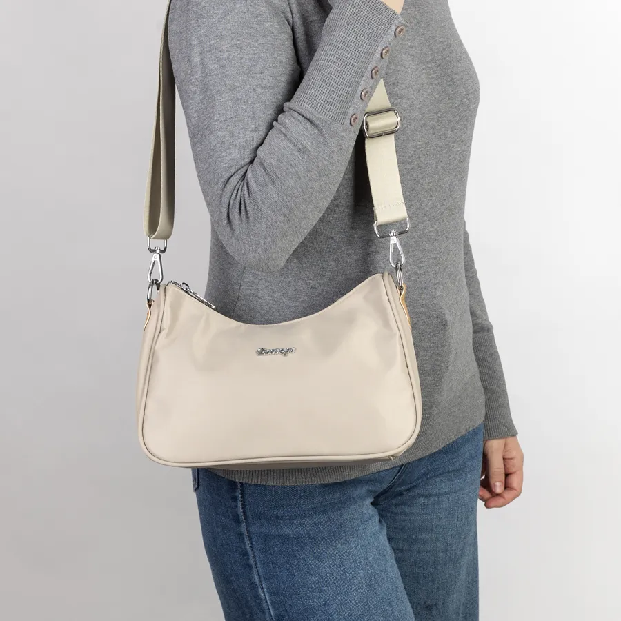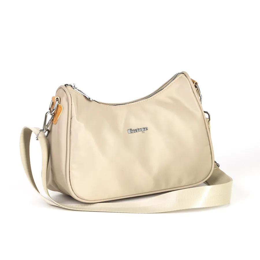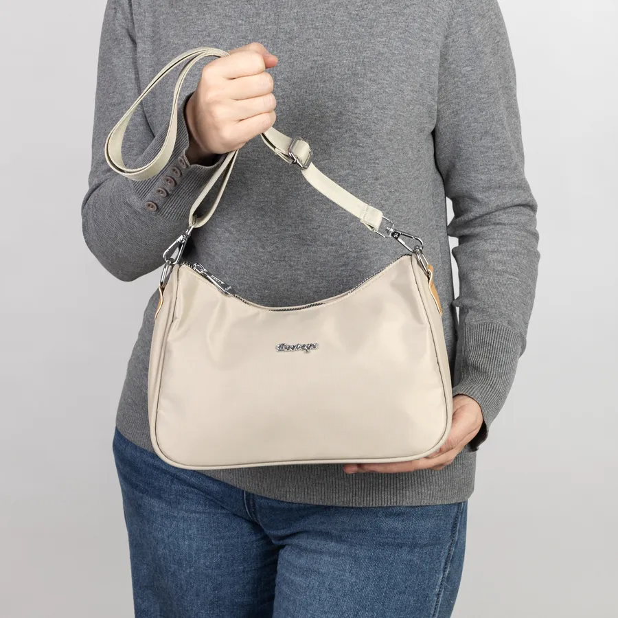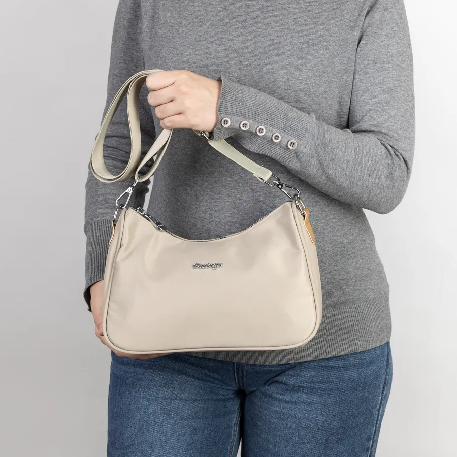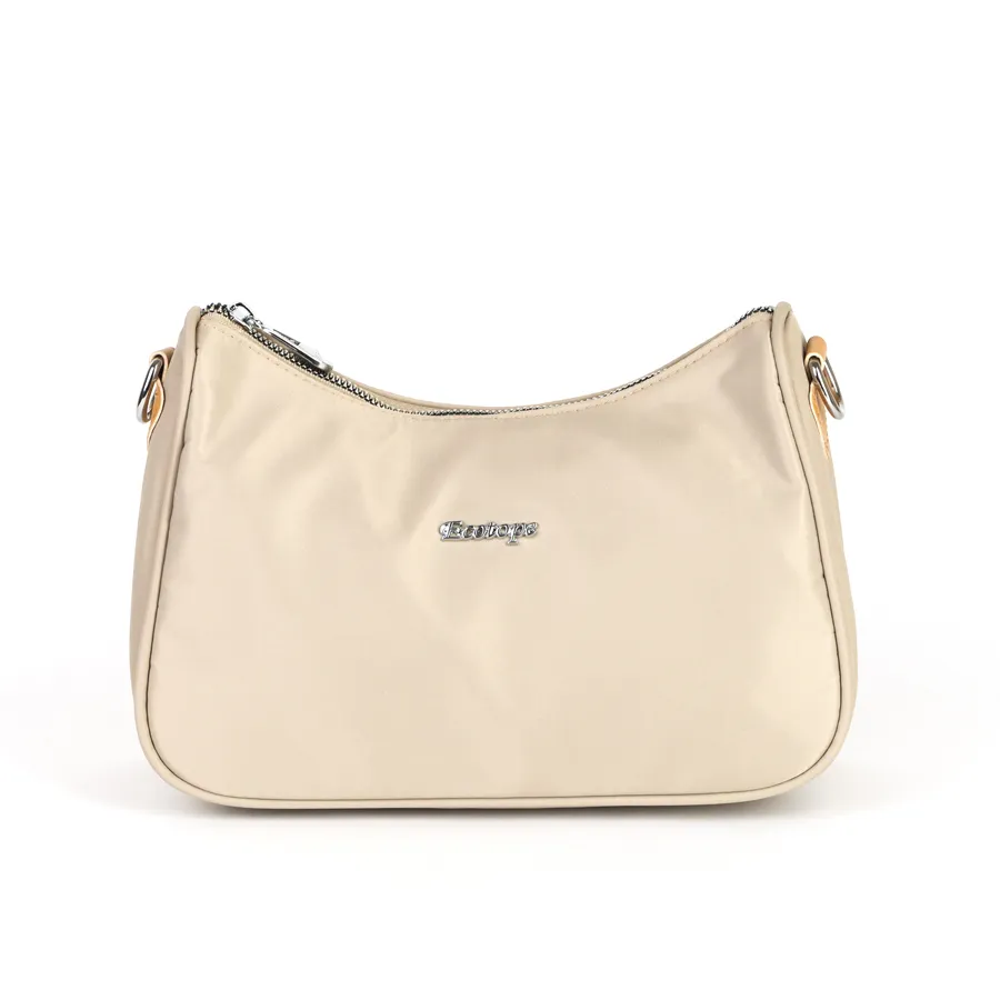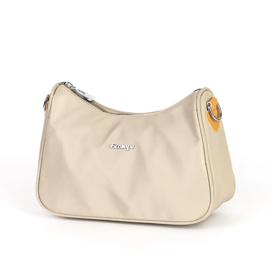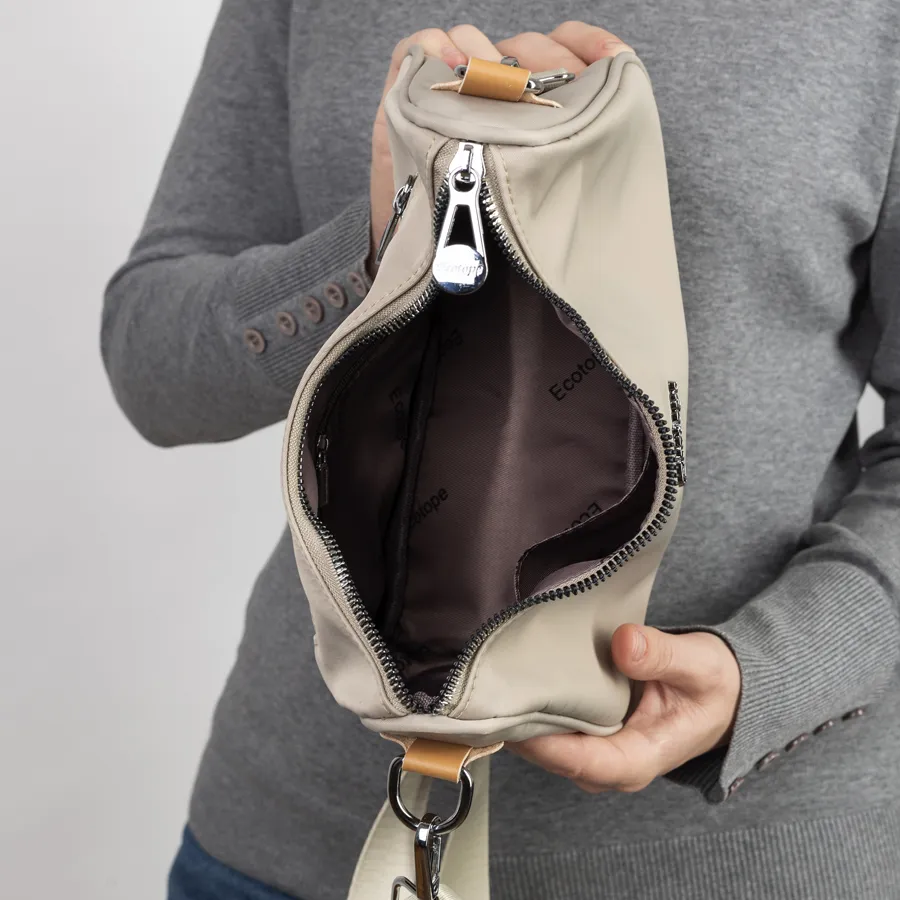 Женская сумка бренда Ecotope из искусственной гладкой кожи. Прошита фирменной подкладочной тканью. Внутри одно отделение под молнией, карман на молнии и кармашек для мелких вещей. На задней стороне есть карман на молнии. В комплект входит прицепной плечевой ремень из текстиля