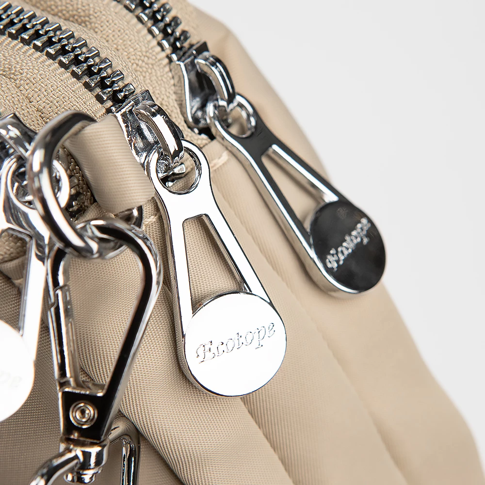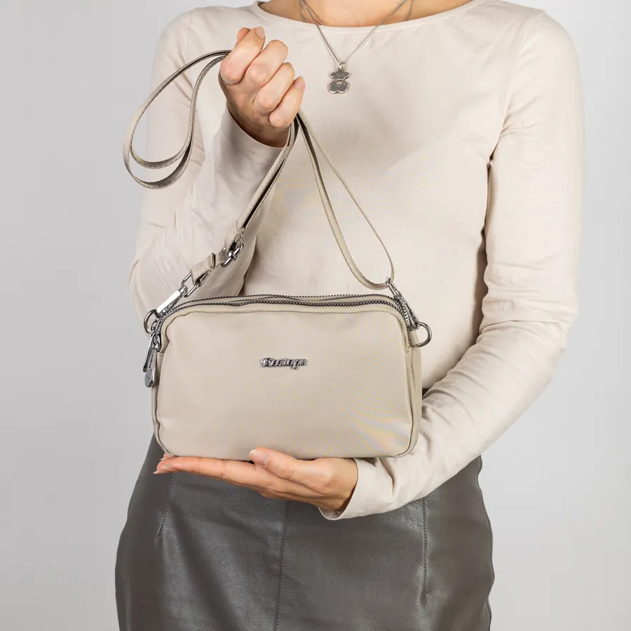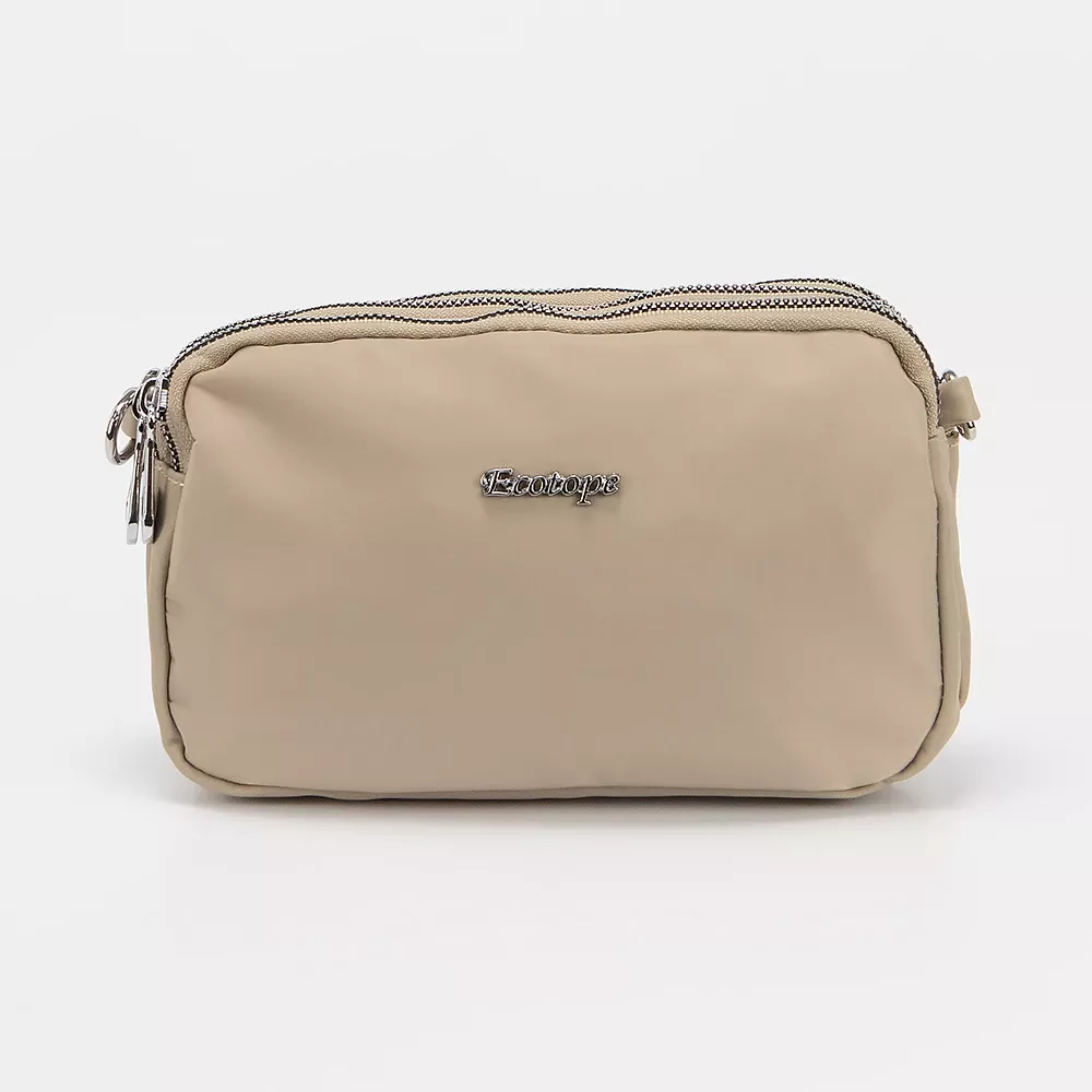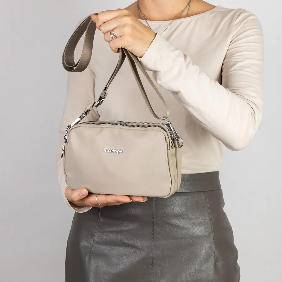 Маленькая женская текстильная сумочка бренда Ecotopе. Прошита фирменной подкладочной тканью. Имеет плечевой ремень на карабинах. Внутри 3 отделения. В отделении ближе к лицевой стороне есть также кармашек для мелких вещей