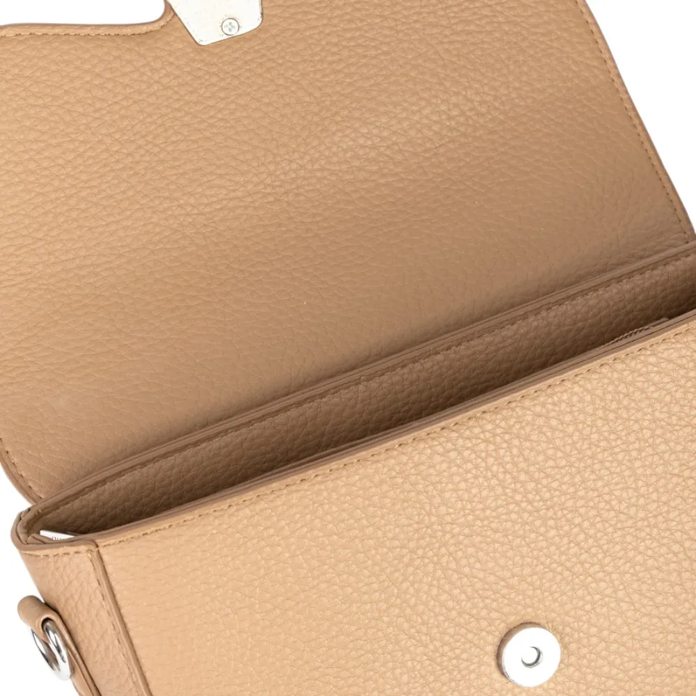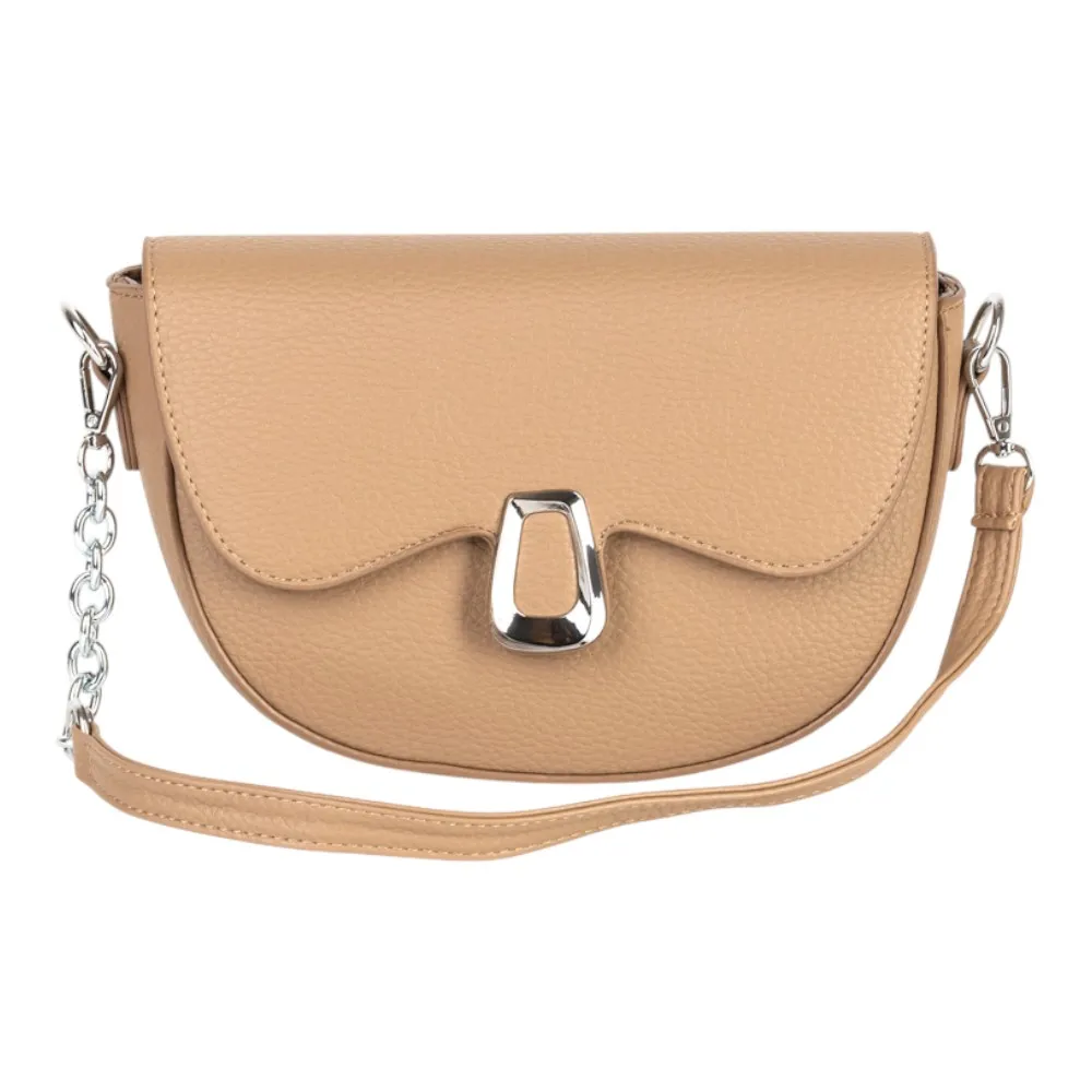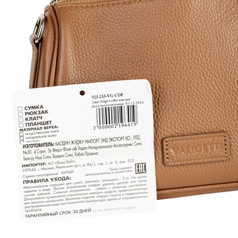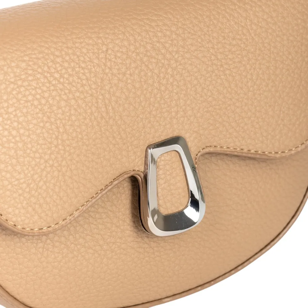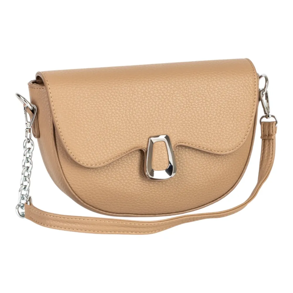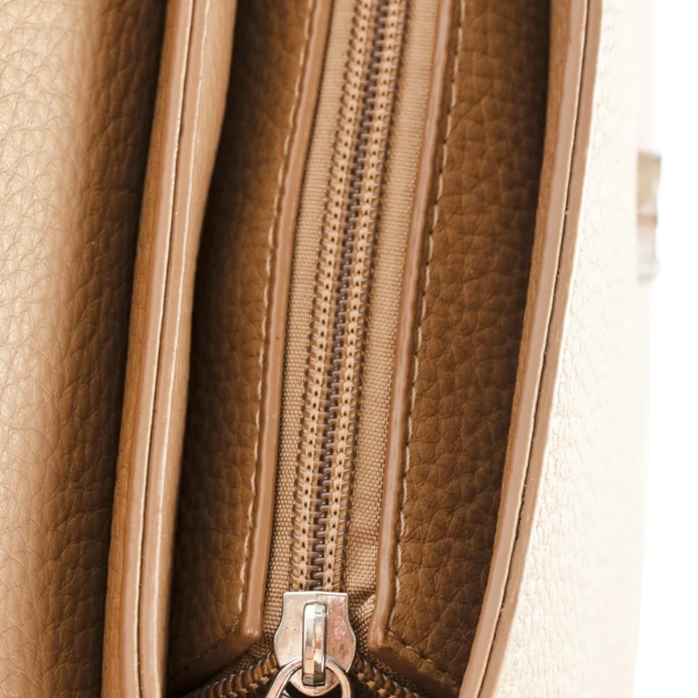 Сумка от торговой марки Passo Avanti из искусственной кожи бежевого цвета. Есть специальный карабин, к которому можно пристегнуть плечевой ремешок. Открывается на замок-клапан и внутри имеет 1 большое отделение с еще одним тайным кармашком, который застегивается на молнию.