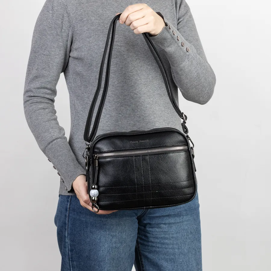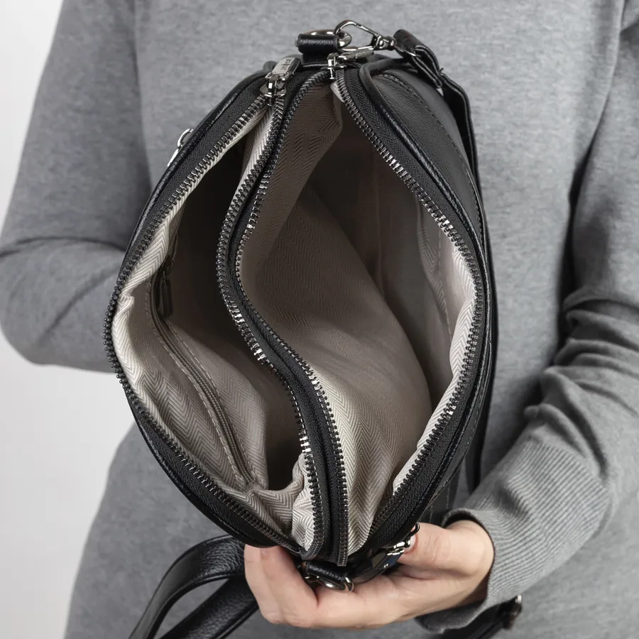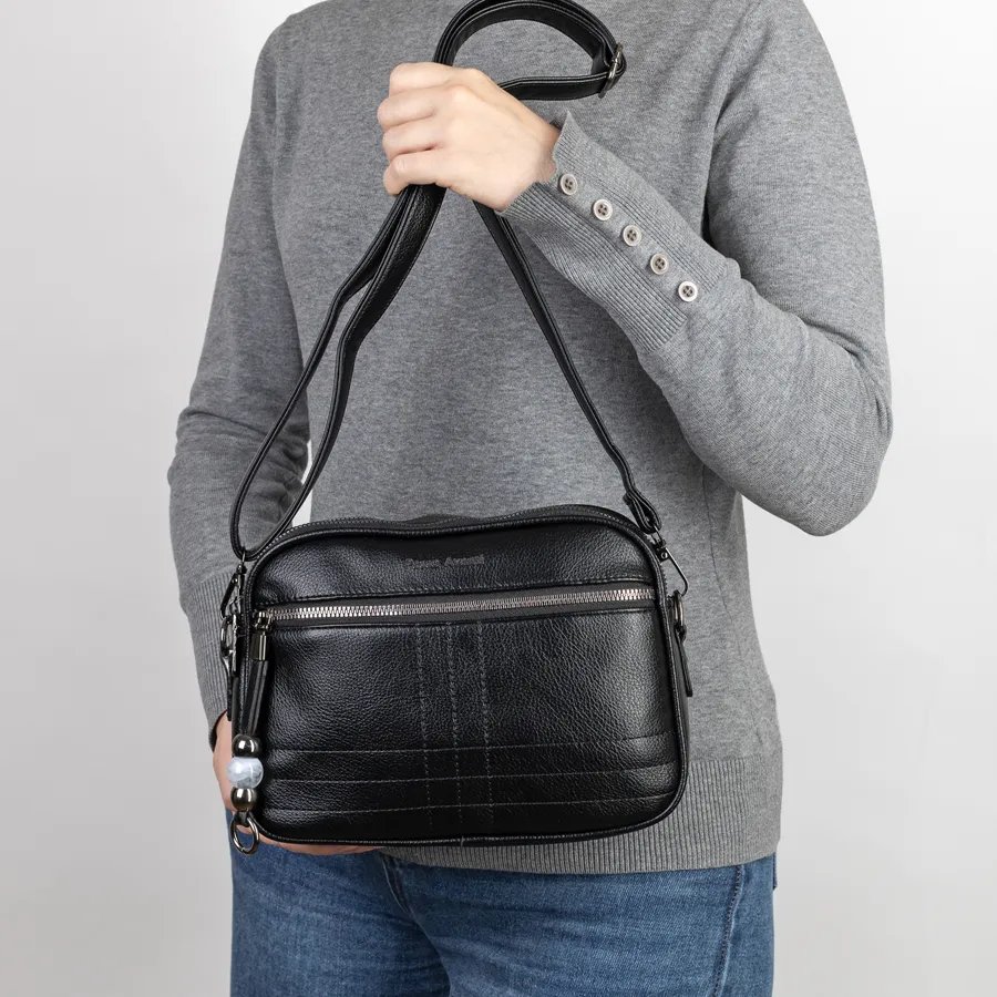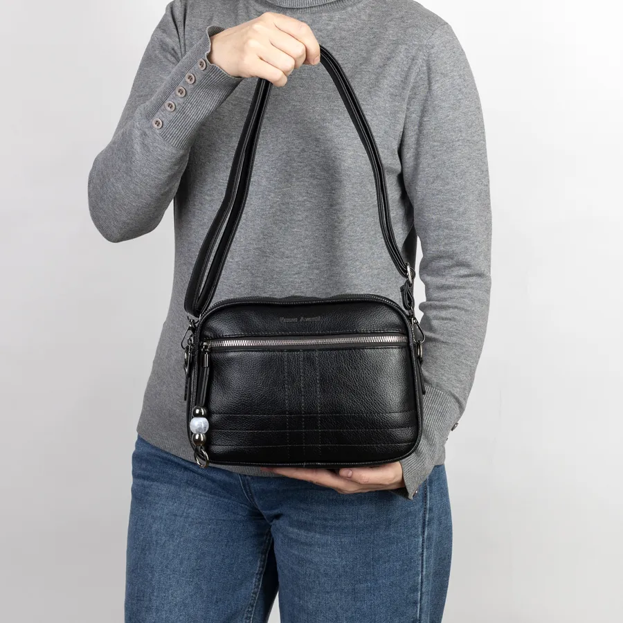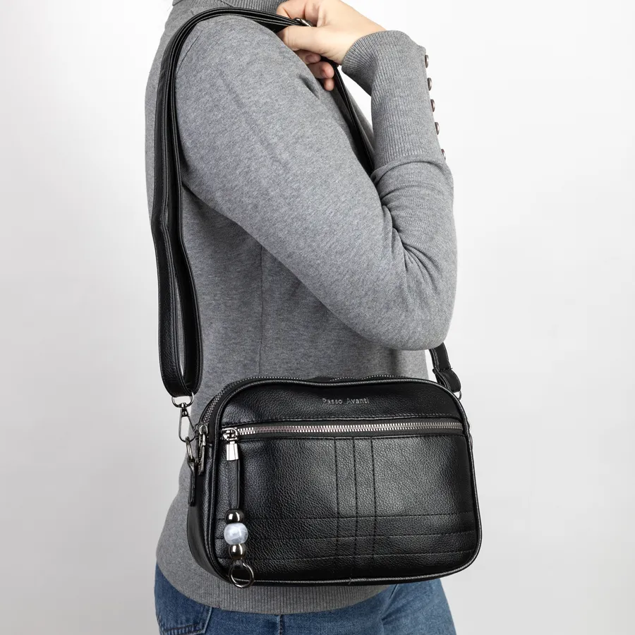 Сумка от торговой марки Passo Avanti выполнена из искусственной кожи черного цвета. Модель со съемным плечевым ремнем. Отделение на молнии. Внутри: текстильная подкладка, карман на молнии, накладной карман. С лицевой стороны карман на молнии с оригинальным пуллером.