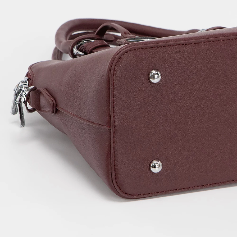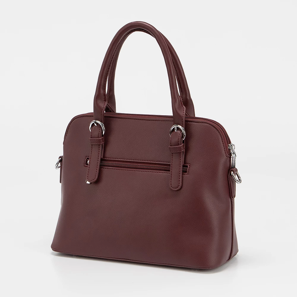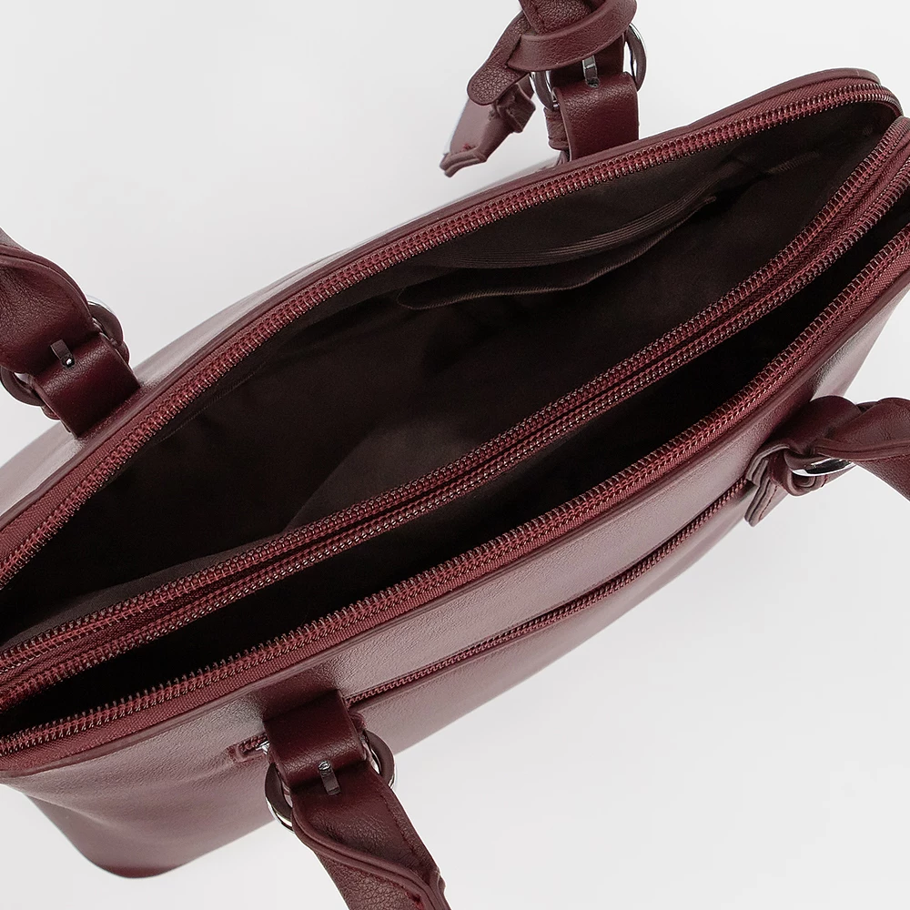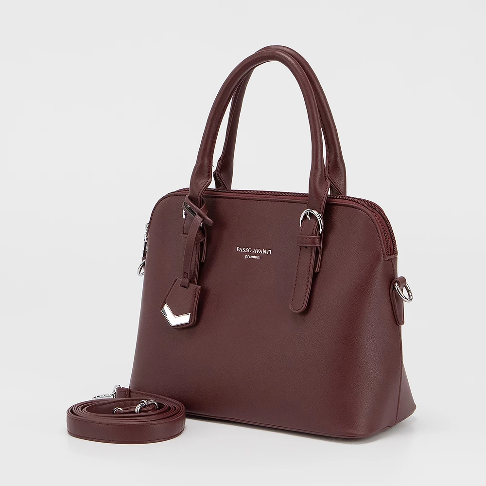 Сумка от бренда Passo Avanti из искусственной кожи бордового цвета. Модель с двумя ручками и съемным регулируемым плечевым ремнем. Два отделения на молнии. Внутри: текстильная подкладка, карман на молнии, накладной карман. С задней стороны — карман на молнии. Дно оснащено металлическими ножками для защиты от износа.
