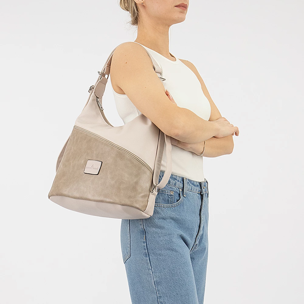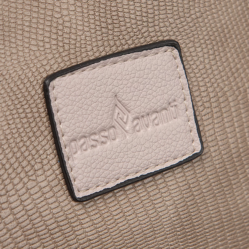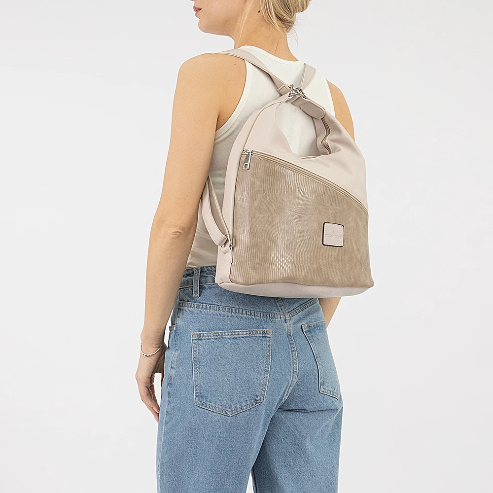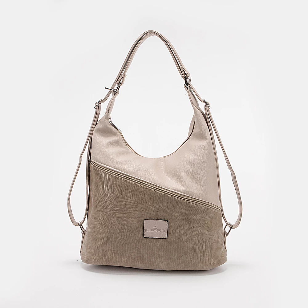 Сумка-рюкзак от бренда Passo Avanti из искусственной кожи в сочетании бежевого и кофейного цвета. Лицевая сторона декорирована вставкой с тиснением под рептилию. Вместительная модель с двумя ручками, которые стягиваются в плечевые лямки. Отделение на молнии. Внутри: средник и карман на молнии, два накладных кармана. На лицевой и задней сторонах – карман на молнии.