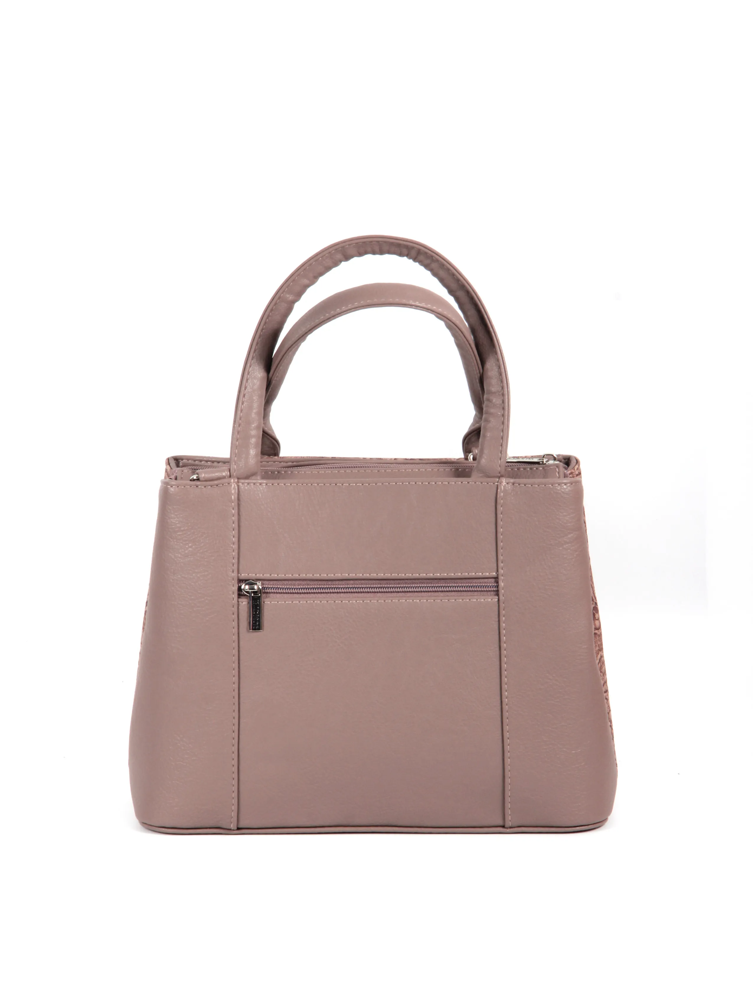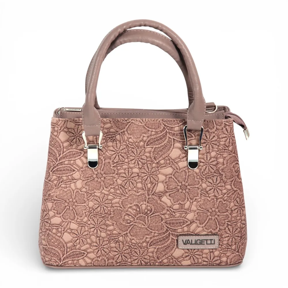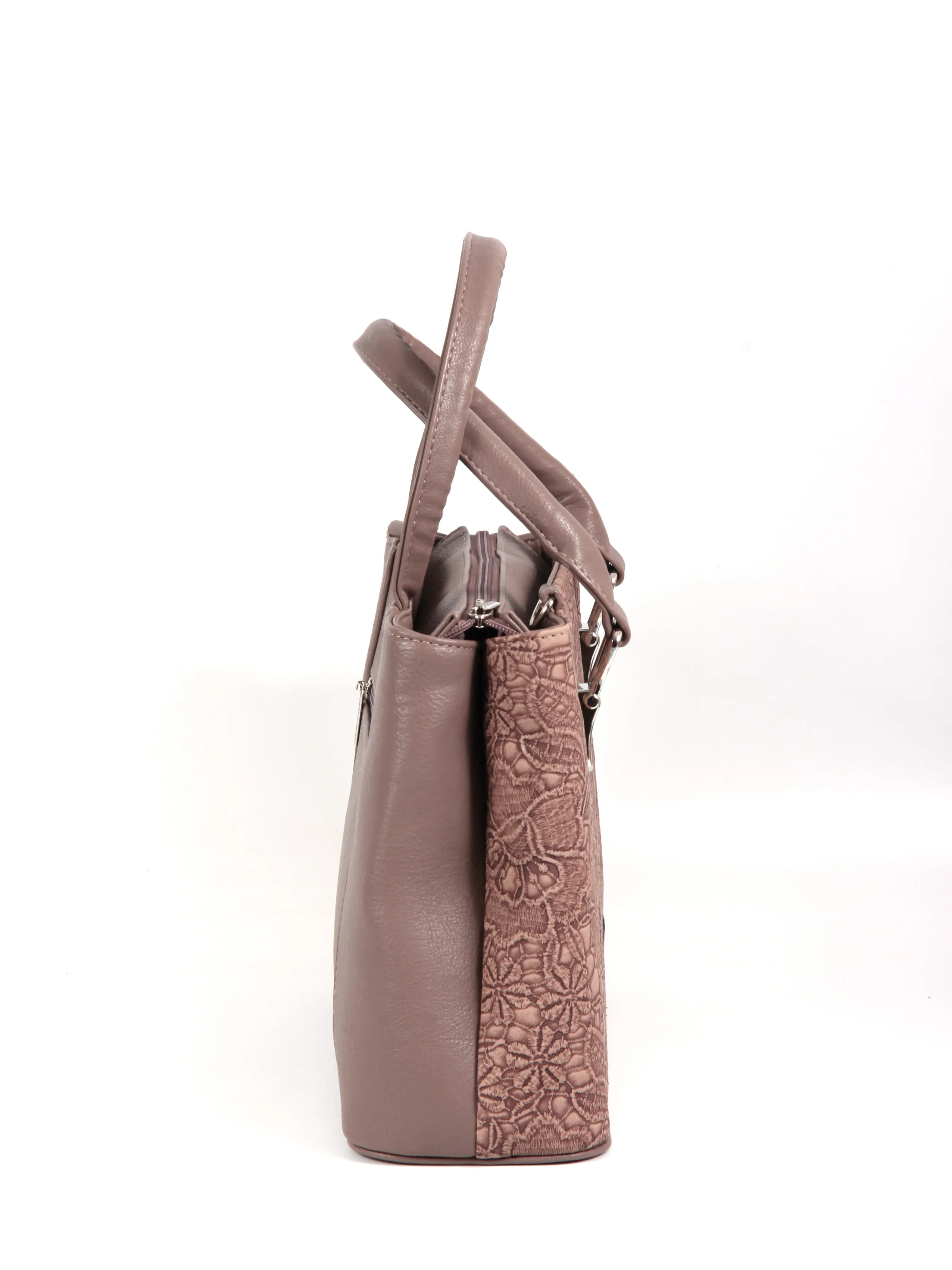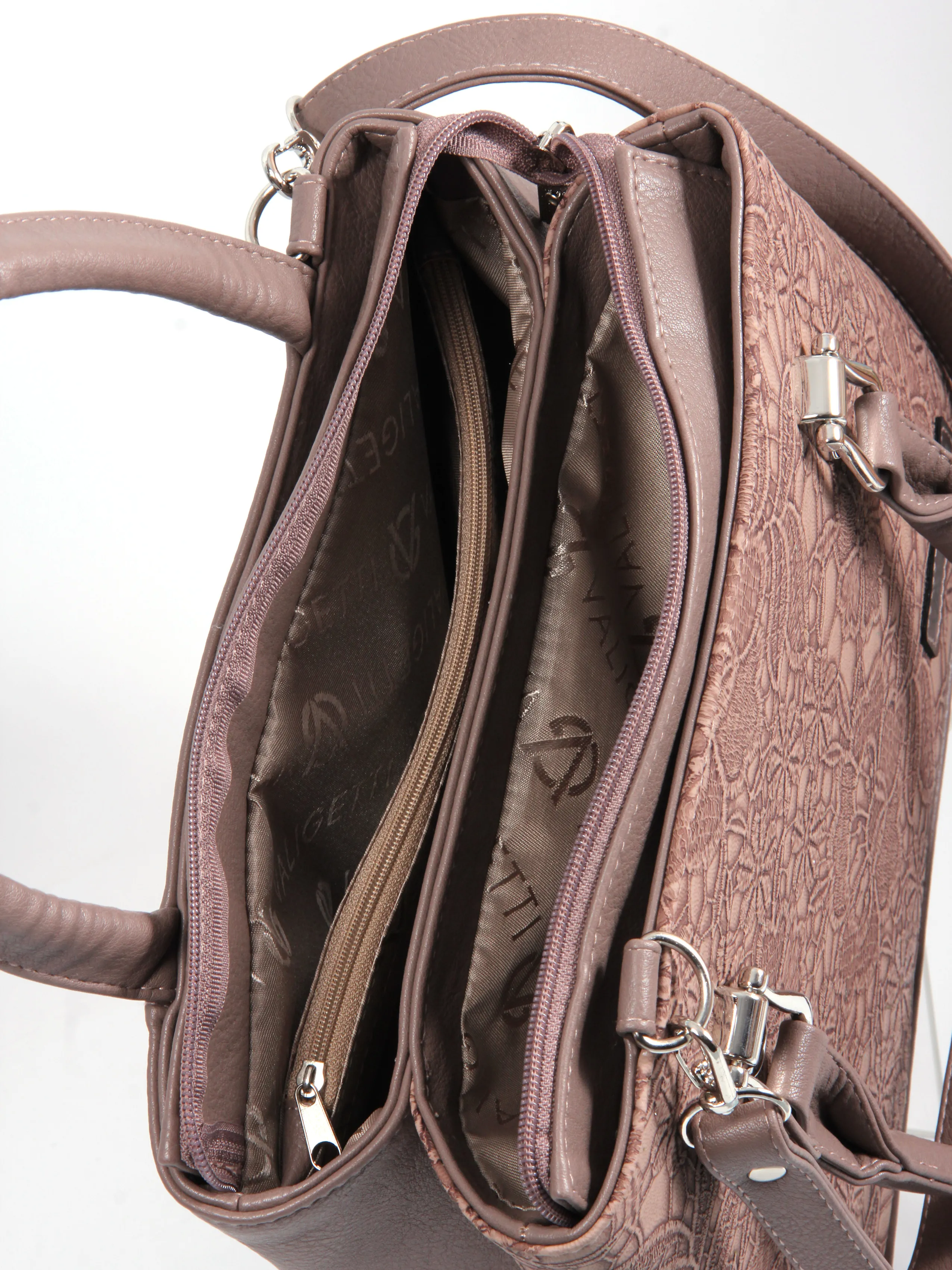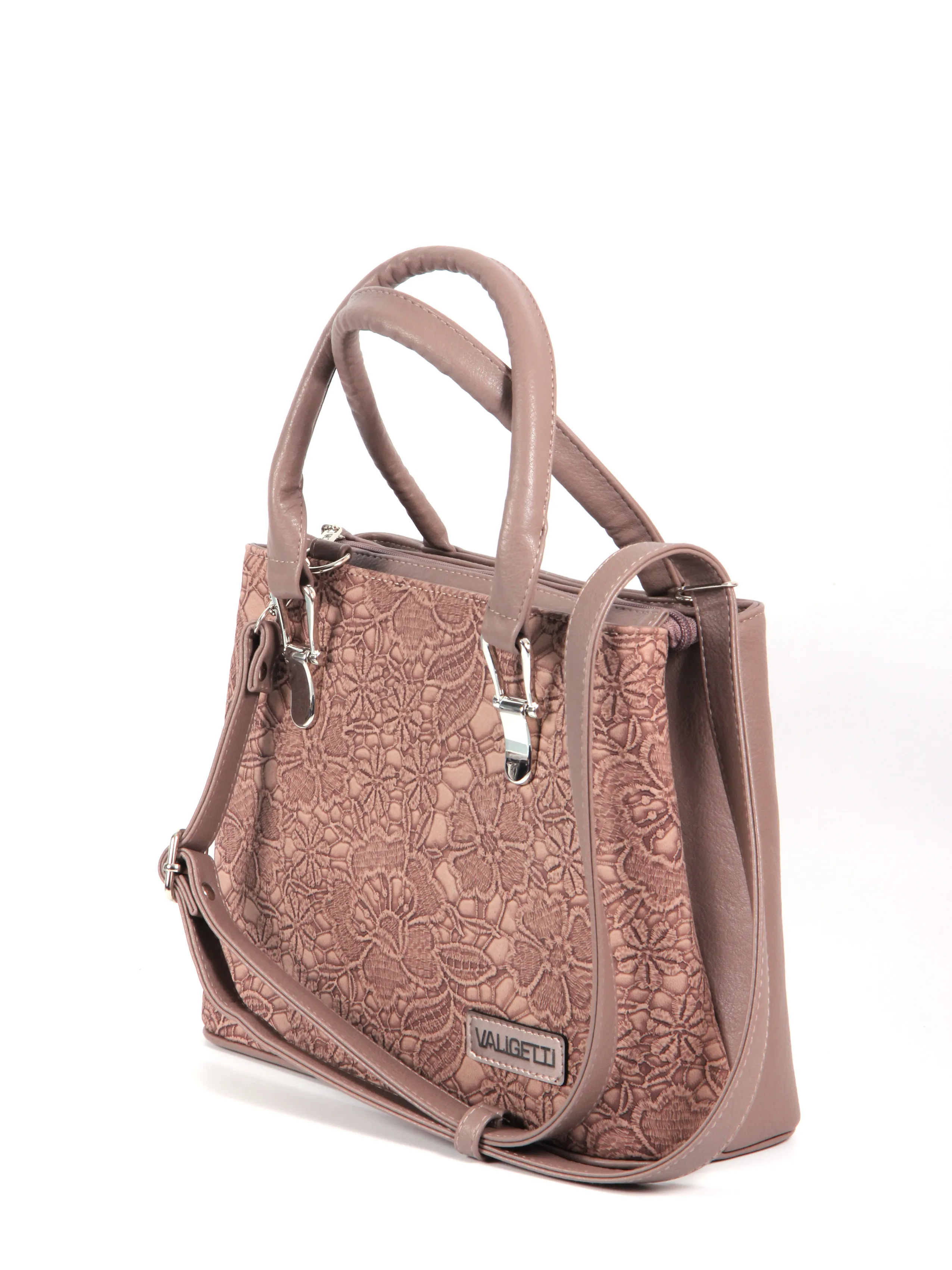 Сумка от бренда Valigetti выполнена из искусственной кожи в бежевом цвете и декорирована цветами на лицевой стороне. Модель с двумя ручками и съемным регулируемым плечевым ремнем. Два основных отделения закрываются на молнию, внутри: фирменная текстильная подкладка, накладной карман на молнии и боковой открытый карман. На задней стороне сумки расположен карман на молнии быстрого доступа.