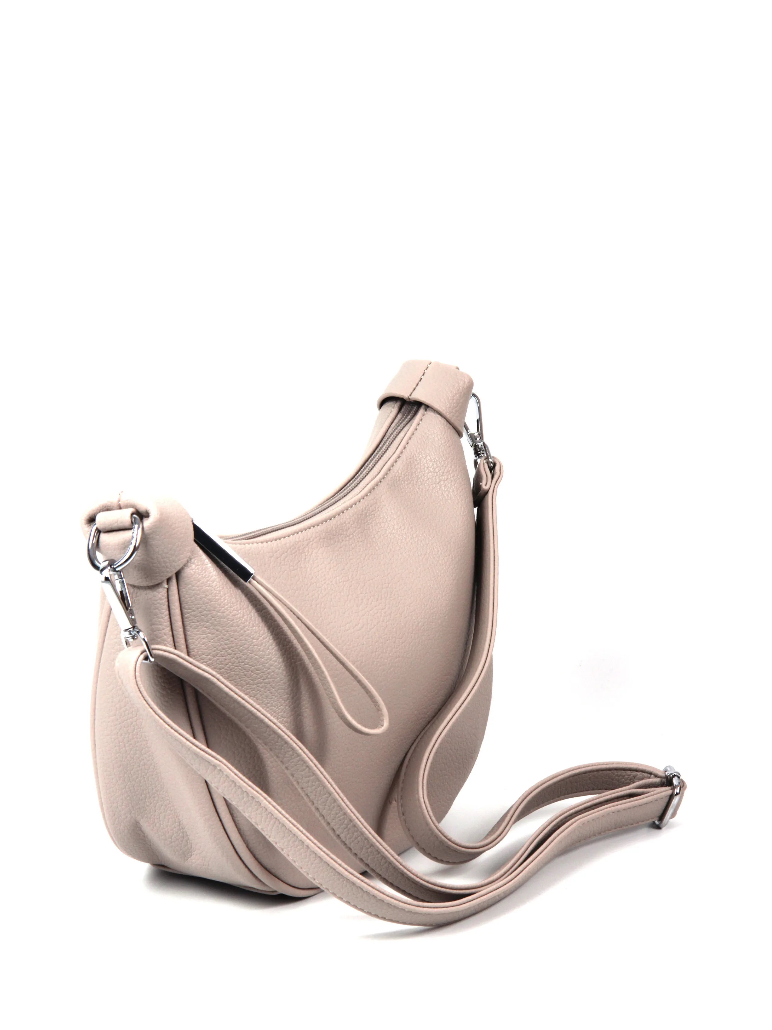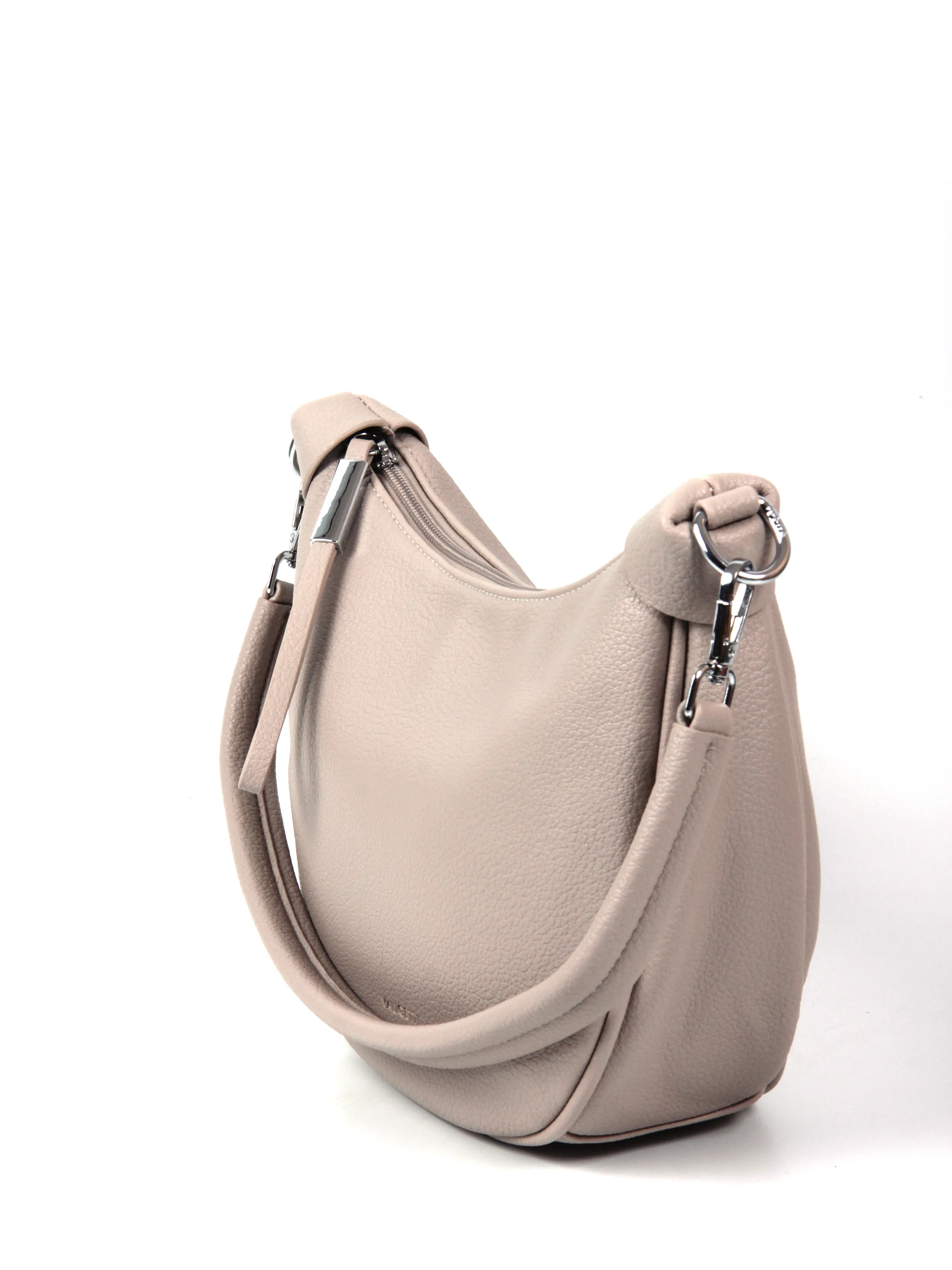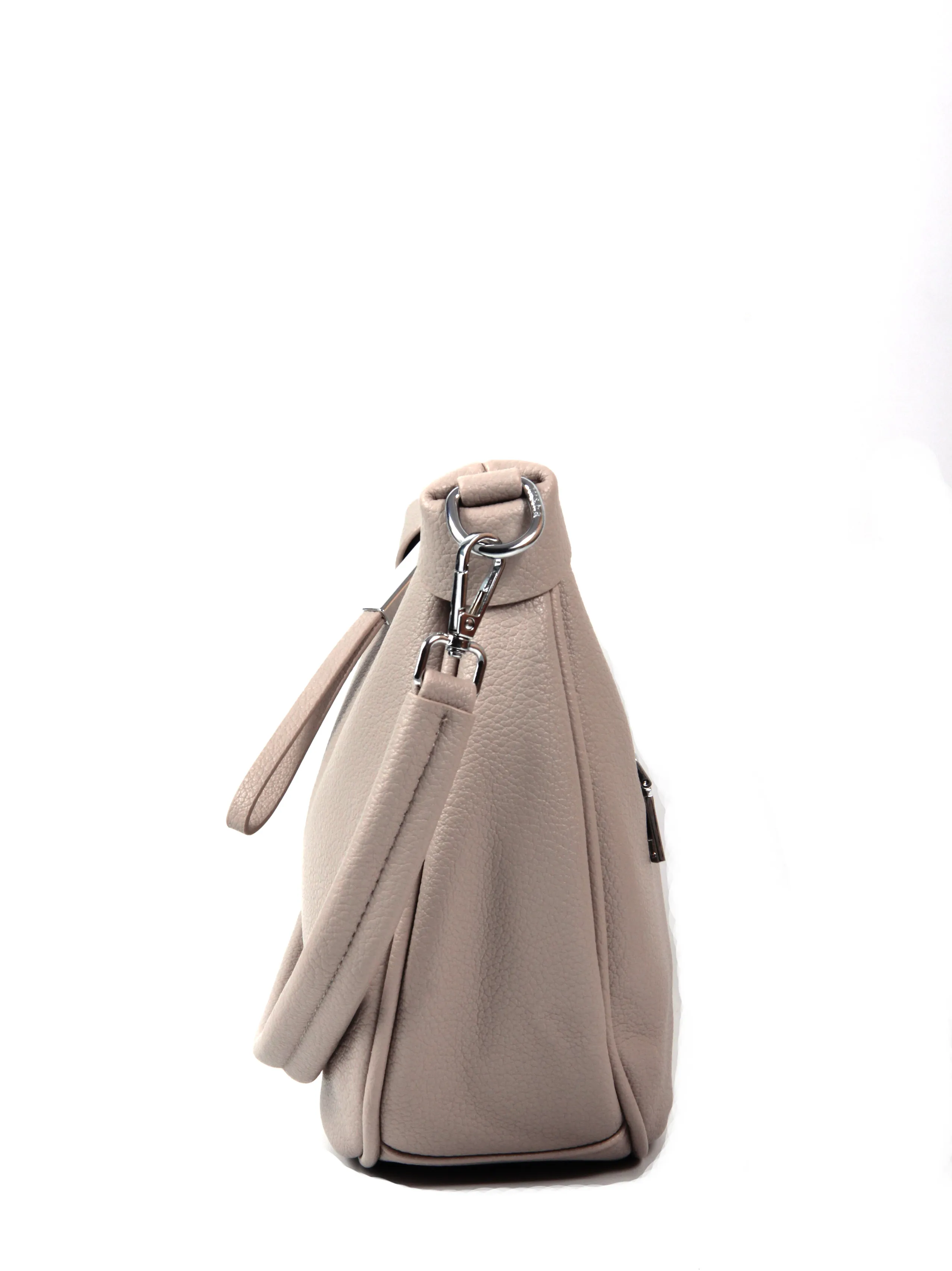 Сумка от бренда Valigetti из искусственной кожи выполнена в бежевом цвете. Модель со съемной ручкой и съемным регулируемым плечевым ремнем, основное отделение на молнии, внутри: текстильная подкладка, открытый накладной карман, средний карман на молнии и боковой карман на молнии. На задней стороне сумки расположен карман быстрого доступа на молнии.