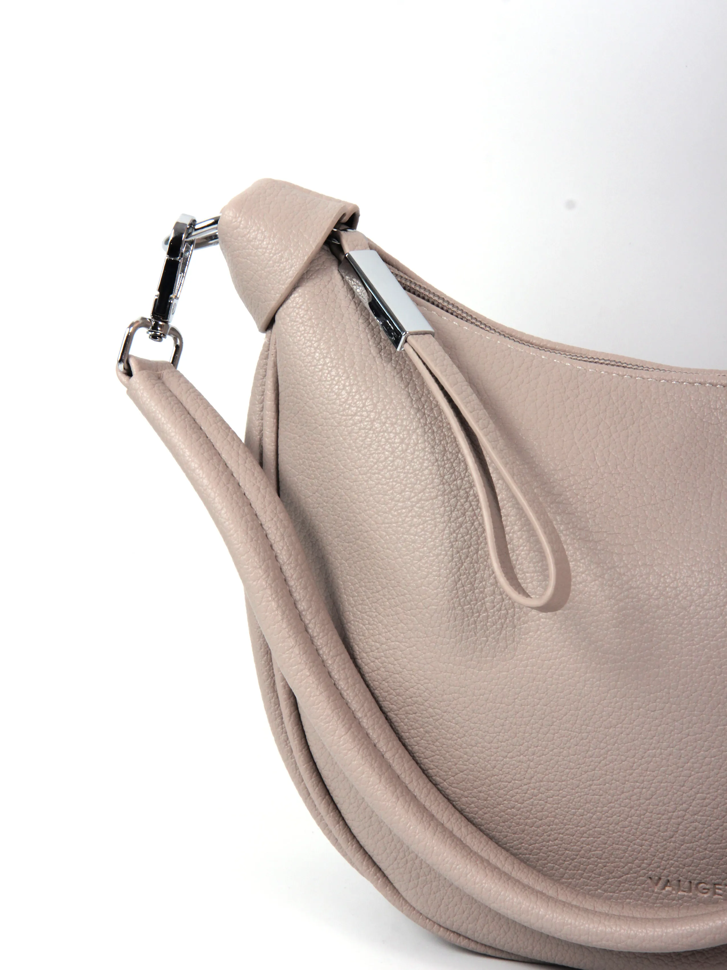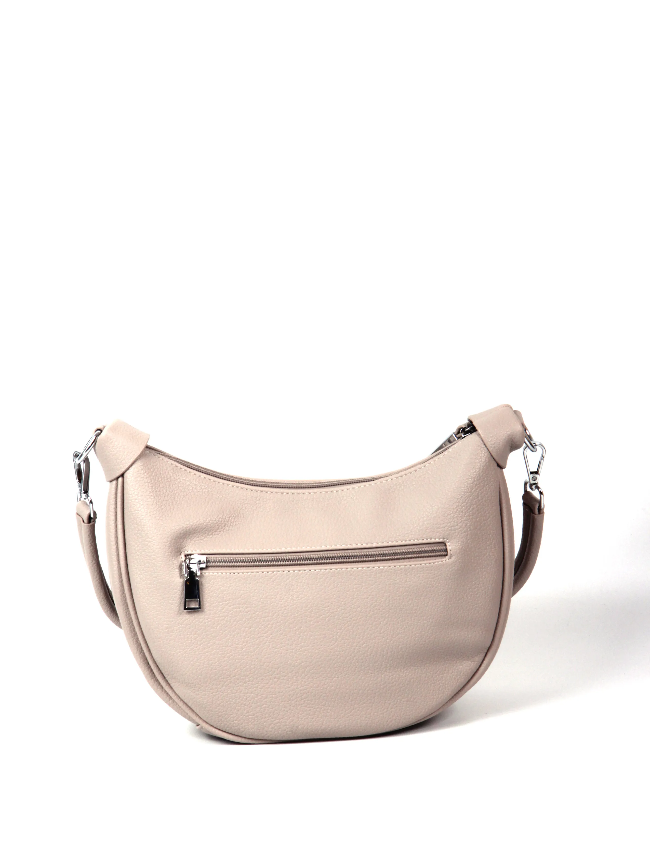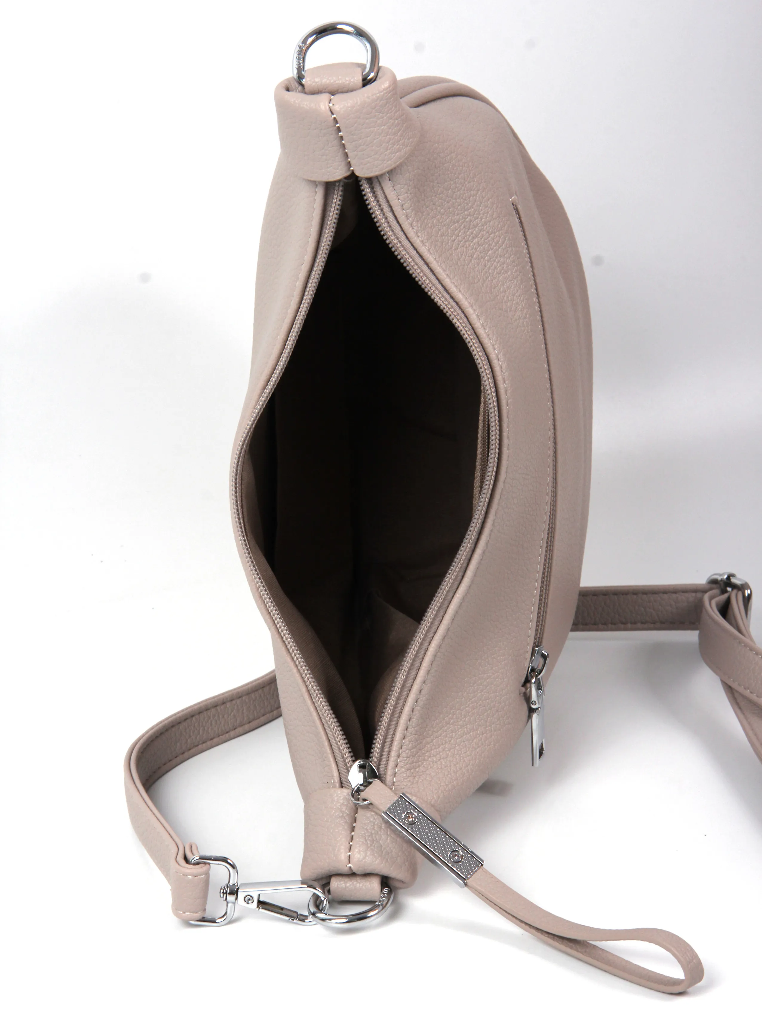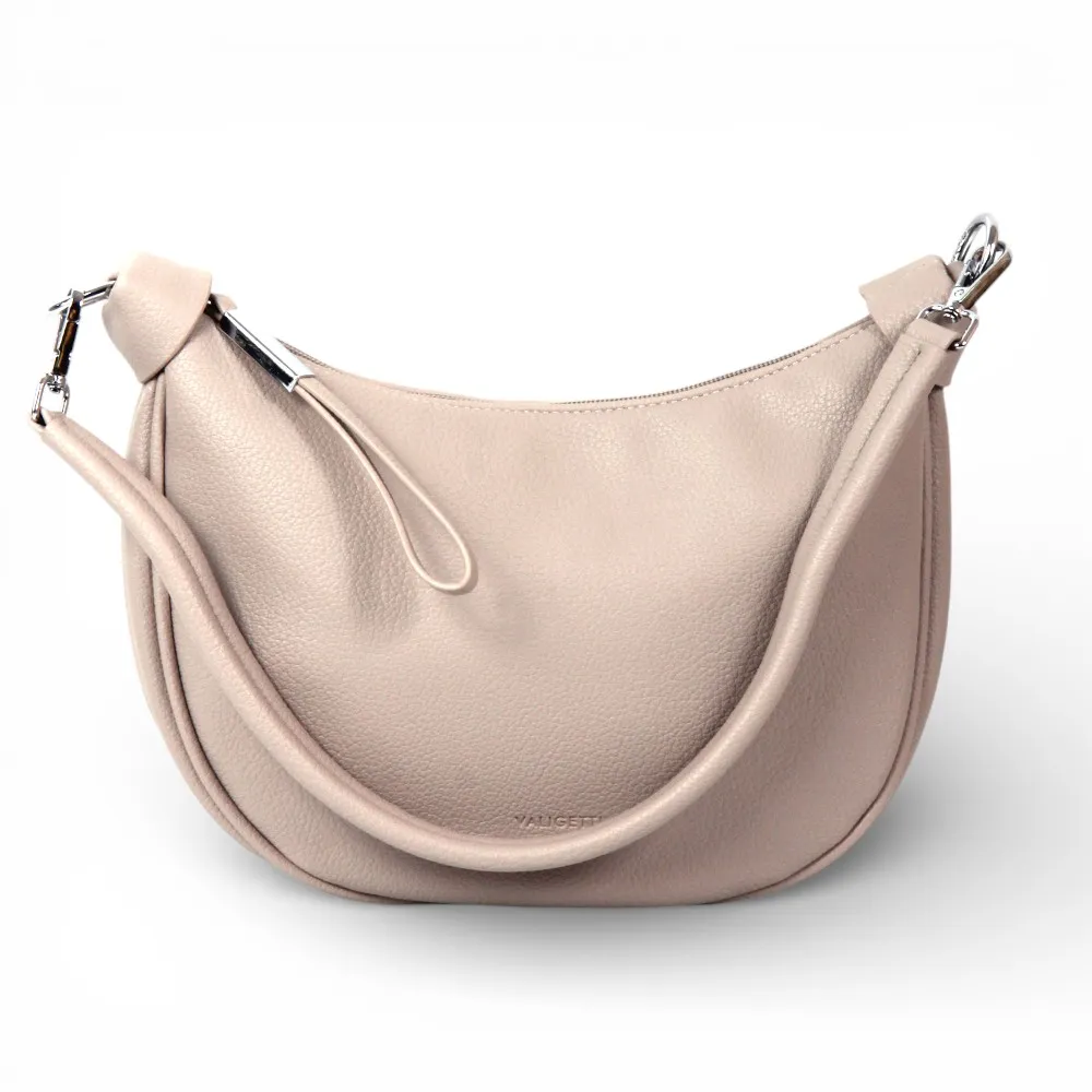 Сумка от бренда Valigetti из искусственной кожи выполнена в бежевом цвете. Модель со съемной ручкой и съемным регулируемым плечевым ремнем, основное отделение на молнии, внутри: текстильная подкладка, открытый накладной карман, средний карман на молнии и боковой карман на молнии. На задней стороне сумки расположен карман быстрого доступа на молнии.