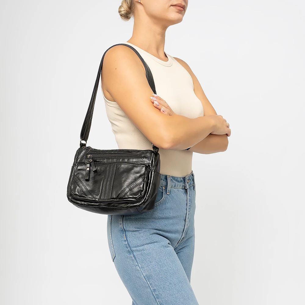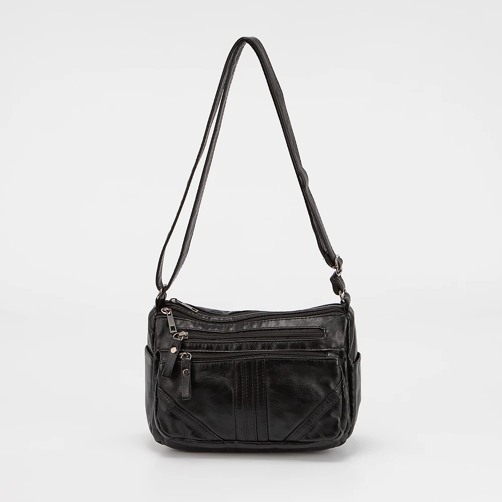 Сумка от бренда Passo Avanti выполнена из искусственной кожи черного цвета. Модель с длинным регулируемым плечевым ремнем. Два отделения на молнии. Внутри: текстильная подкладка, карман на молнии, накладной карман. На лицевой стороне — два кармана на молнии. По бокам — карманы без застежки. С задней стороны — карман на молнии.