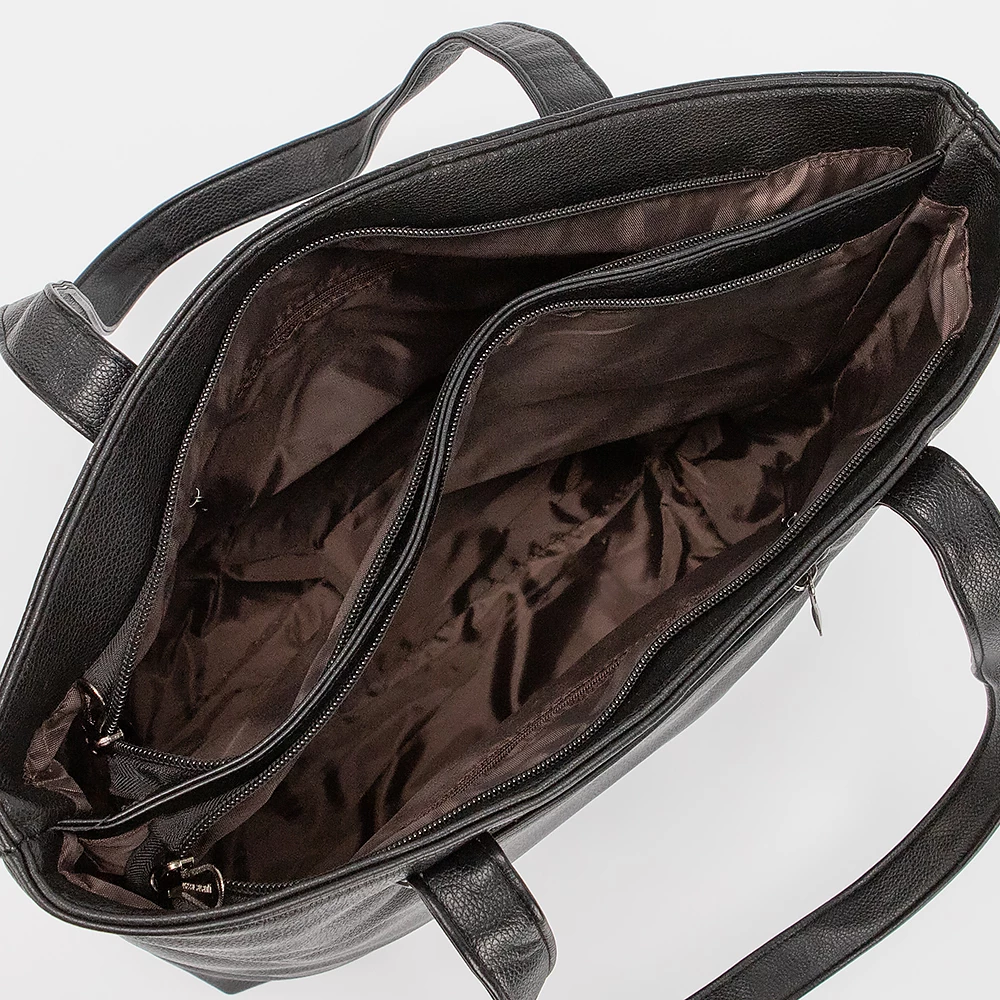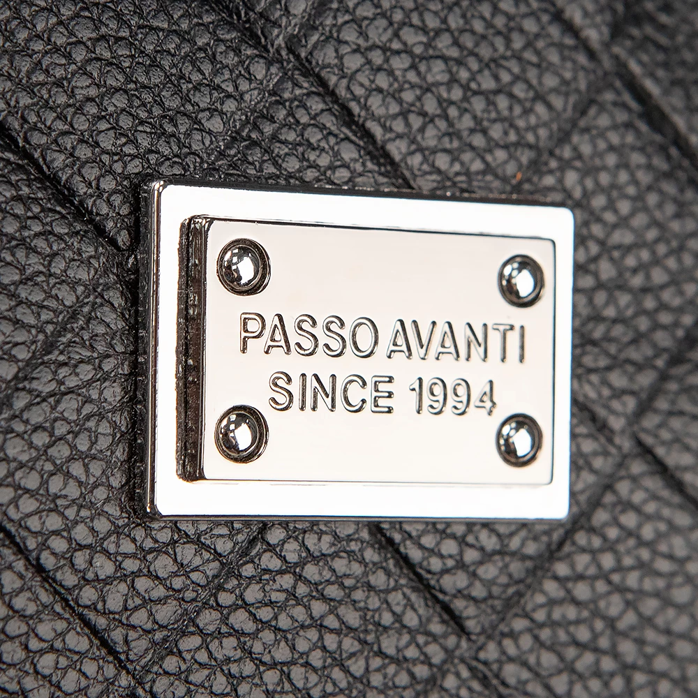 Сумка от бренда Passo Avanti из искусственной кожи. Лицевая сторона декорирована ромбовидным блинтовым тиснением. Модель с двумя удлиненными ручками. Отделение на молнии. Внутри: текстильная подкладка, средник и карман на молнии, два накладных кармана. На задней стороне – карман на молнии.