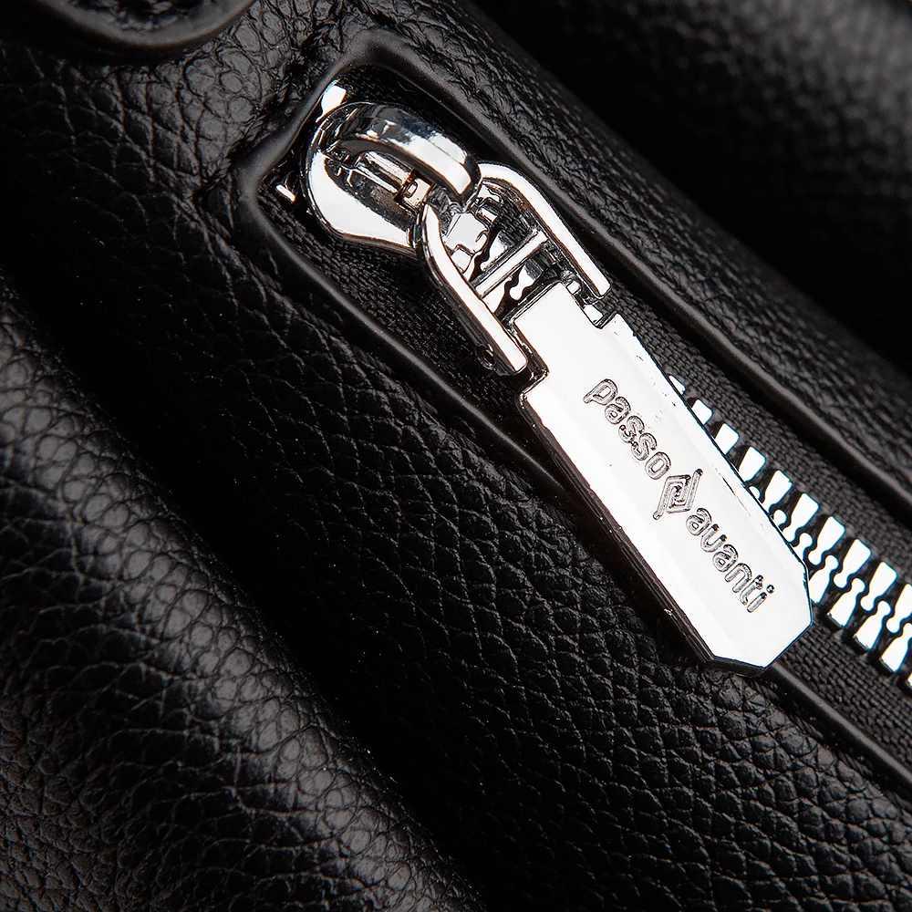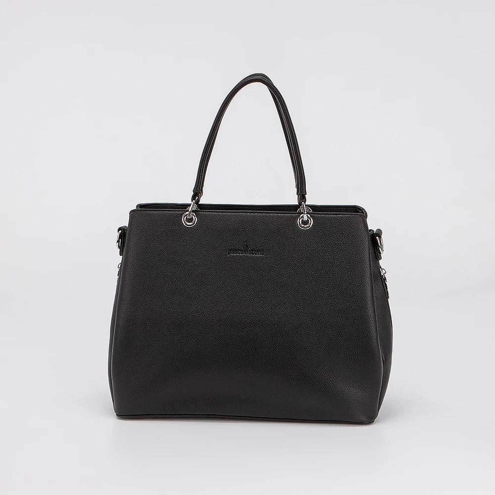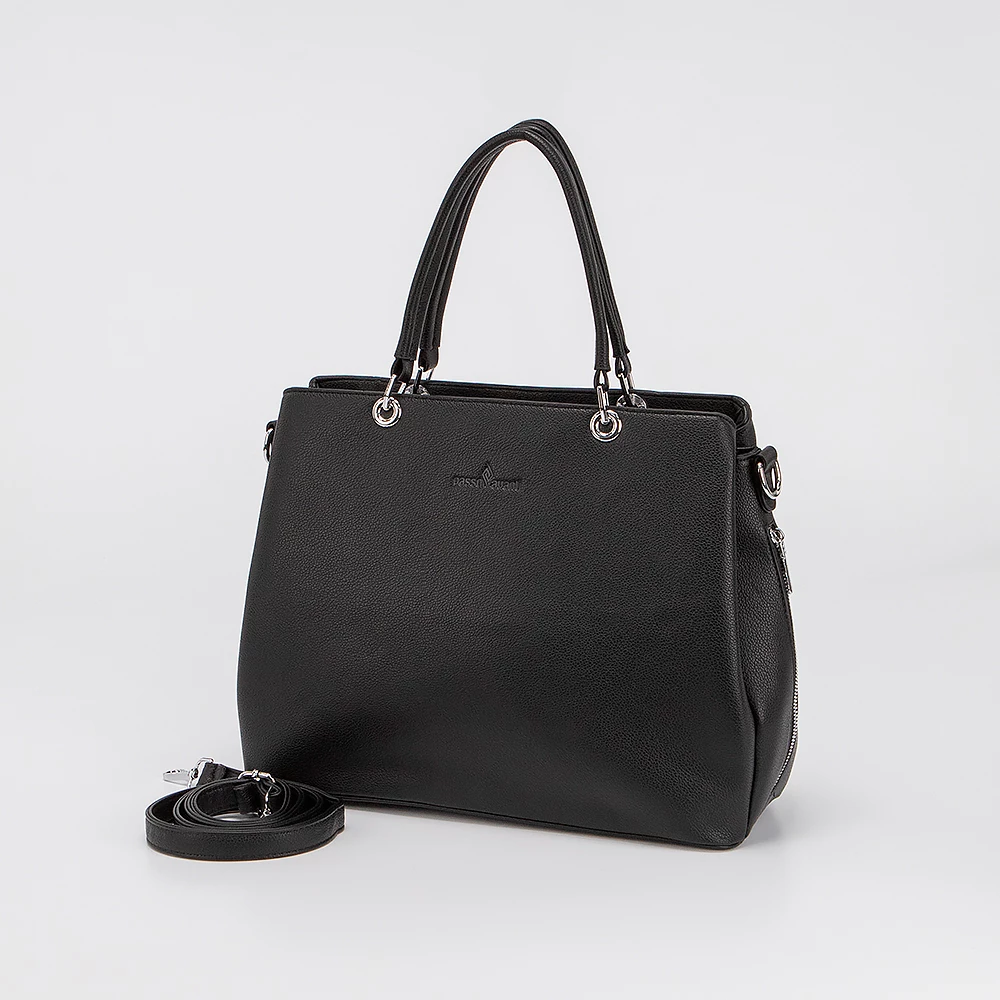 Сумка от бренда Passo Avanti выполнена из искусственной кожи черного цвета. Модель с двумя ручками и съемным регулируемым плечевым ремнем. Отделение на молнии. Внутри: три отсека, текстильная подкладка, карман на молнии, накладной карман. С задней стороны — карман на молнии. Дно оснащено металлическими ножками для защиты от износа.
