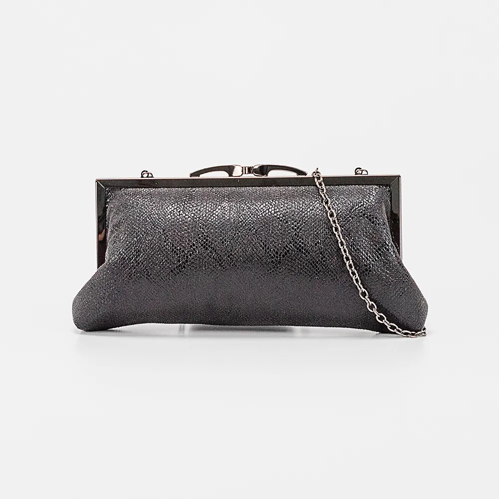 Клатч от торговой марки Marzia из искусственной кожи серебряного цвета с эффектной лазерной обработкой и тиснением под рептилию. Модель со съемным плечевым ремнем-цепочкой. Имеет рамочный вид закрытия фермуар. Внутри отделения: фирменная подкладка, накладной карман.