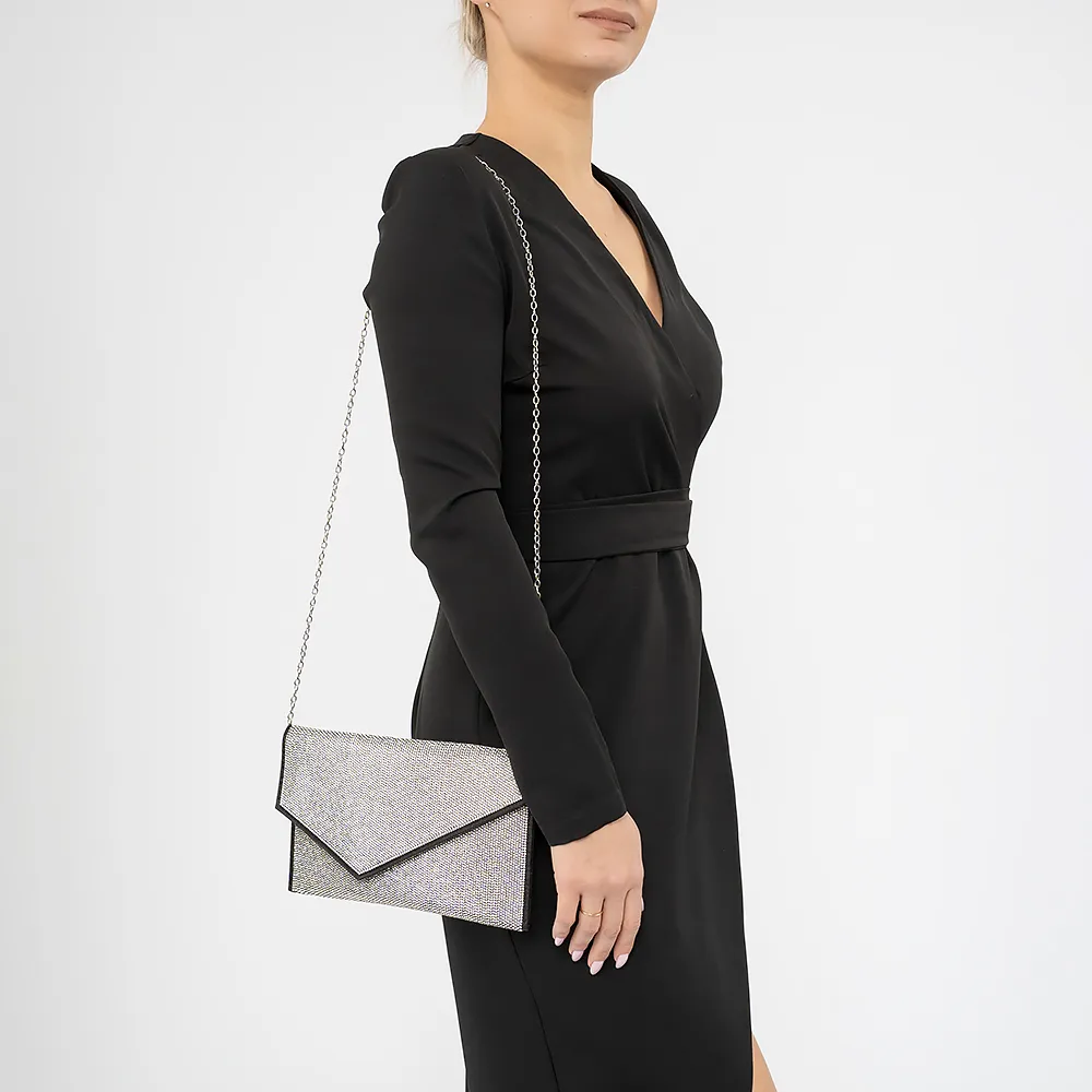 Клатч от торговой марки Passo Avanti. Модель серебристого цвета, декорирована стразами. Закрывается клапаном на магнитной кнопке, имеется съемная цепочка. Внутри: текстильная подкладка, накладной карман.