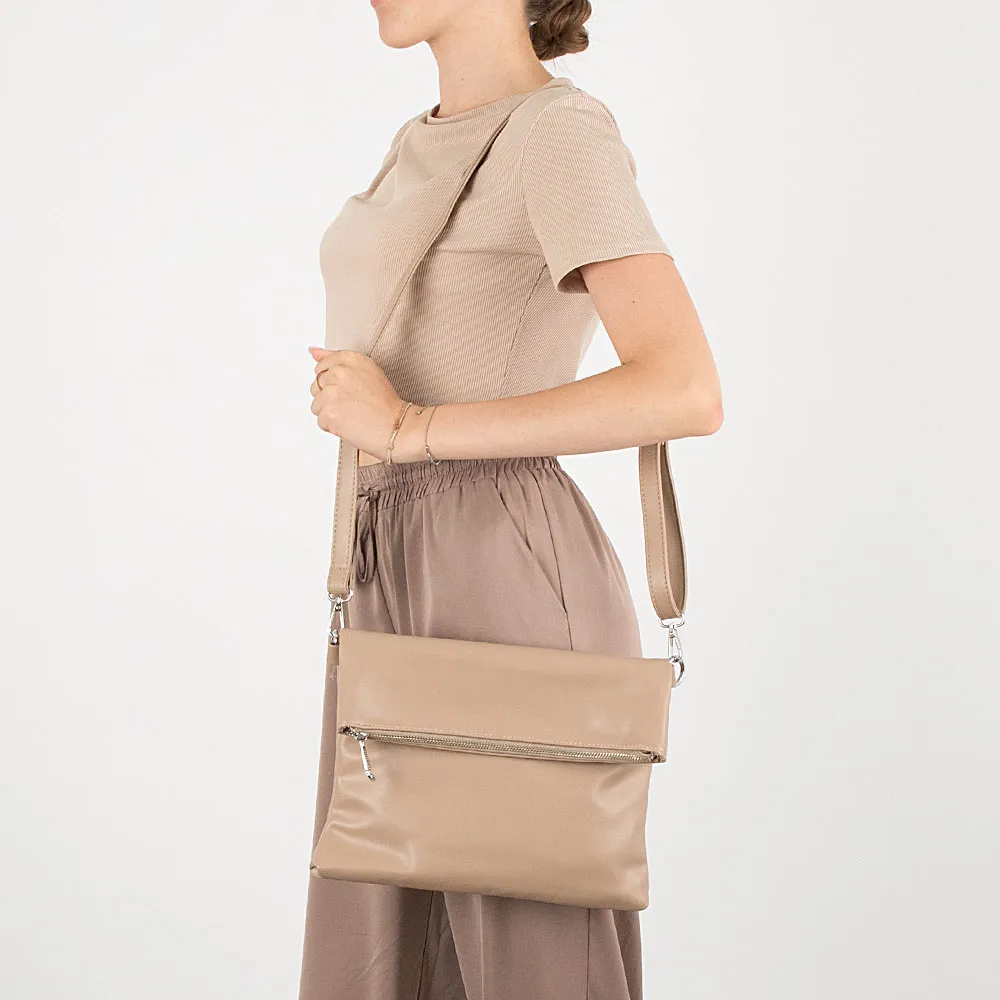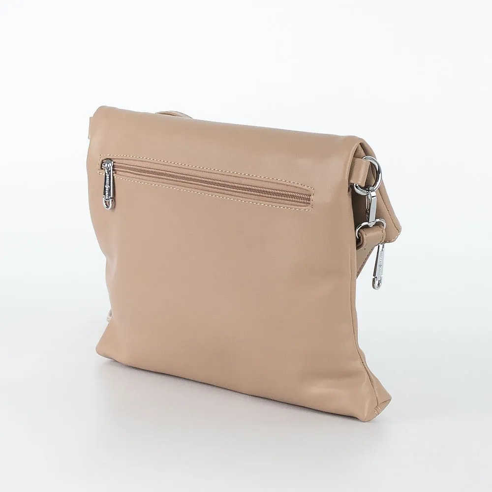 Сумка от торговой марки Passo Avanti из искусственной кожи кофейного цвета. Мягкая плоская модель фолдовер предназначена для использования в двух вариантах. В сложенном состоянии представляет собой модель-конверт; в развёрнутом получается достаточно вместительная сумка. Имеется съемная удлиненная ручка и съемный регулируемый плечевой ремень. Два отделения на молнии с текстильной подкладкой. В основном отделении – перегородка с карманом на молнии, карман на молнии и накладной карман. На задней стороне – карман на молнии.