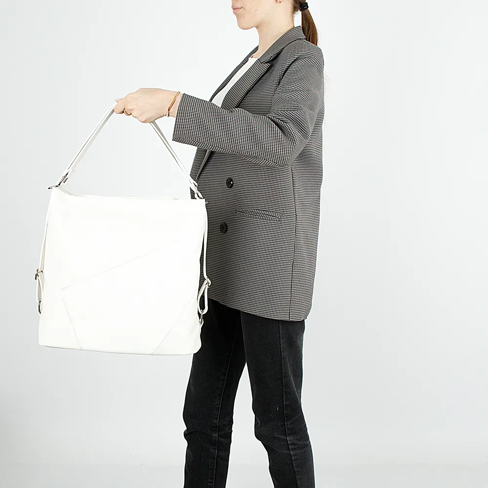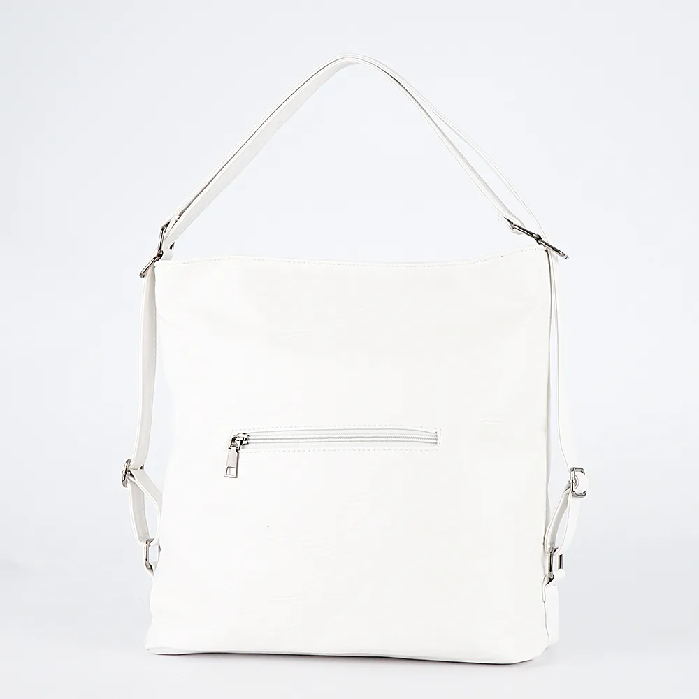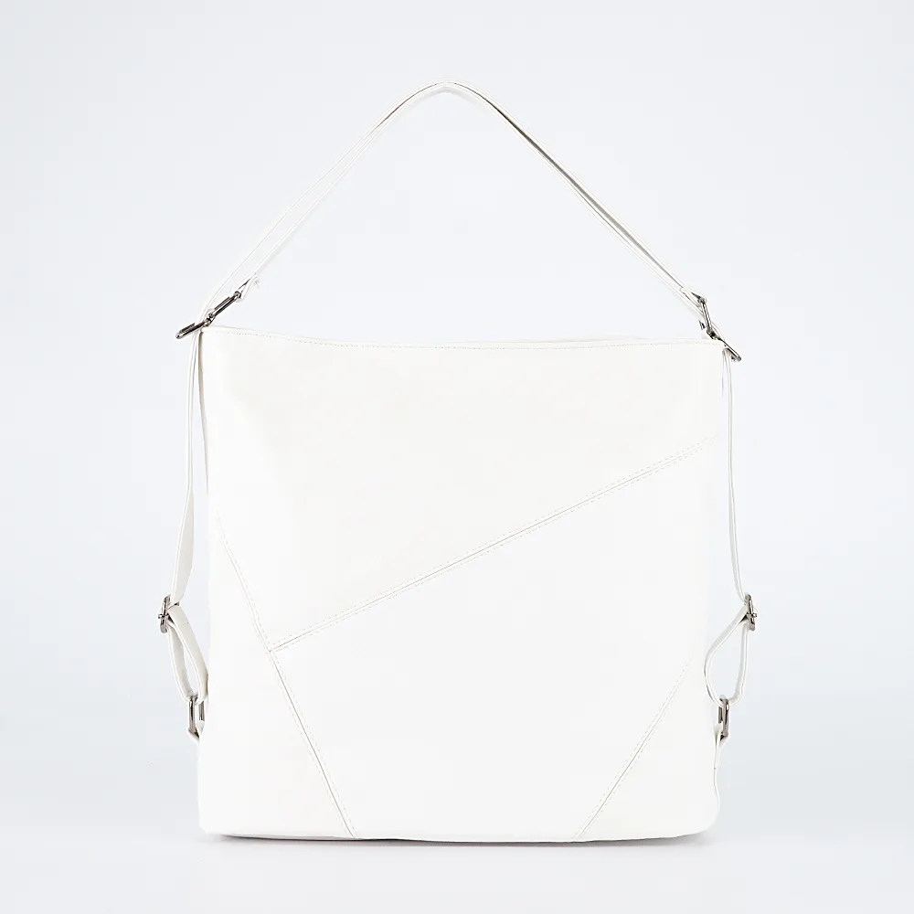 Сумка-рюкзак от торговой марки Passo Avanti из искусственной кожи белого цвета. Вместительная модель с двумя ручками, которые при стягивании превращаются в плечевые лямки. Отделение на молнии. Внутри: текстильная подкладка, средник и карман на молнии, два накладных кармана. На задней стороне – карман на молнии.