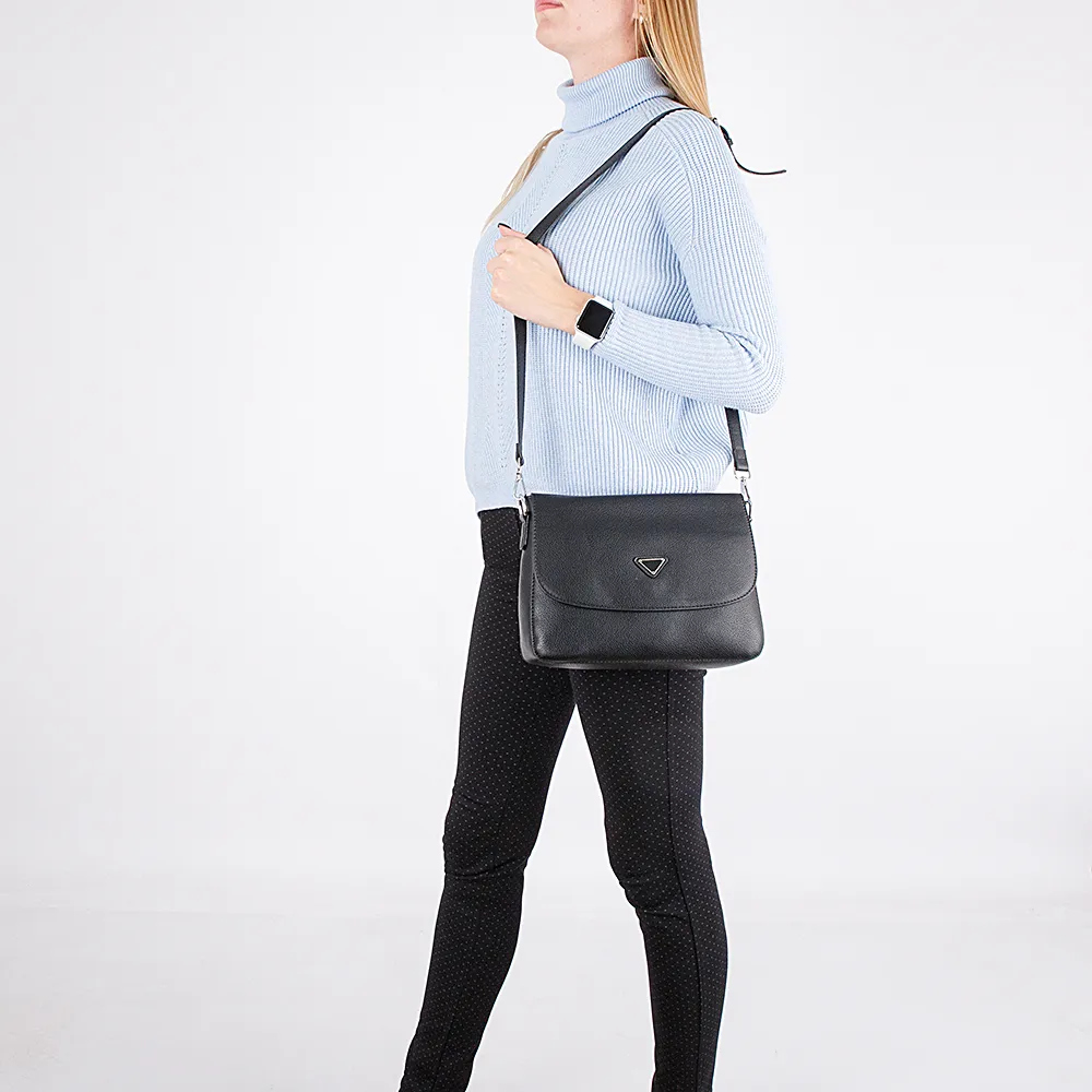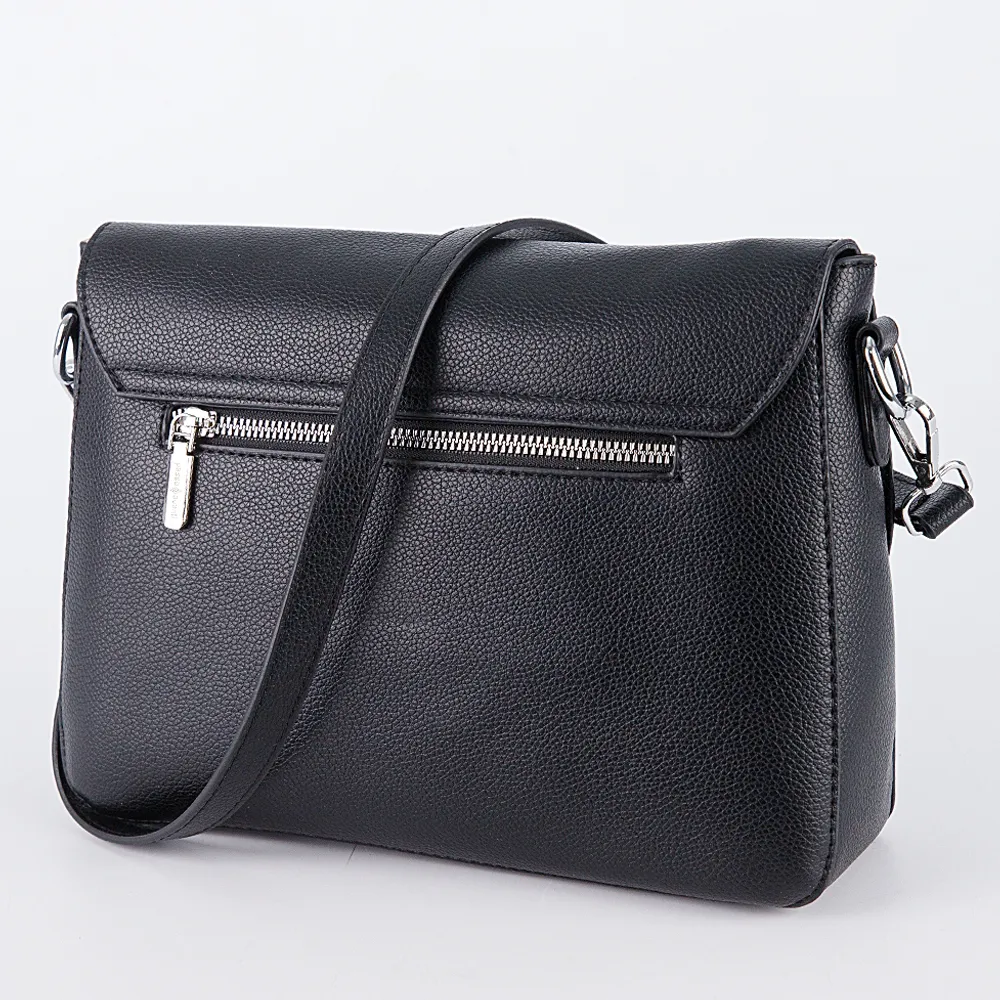 Сумка от торговой марки Passo Avanti из искусственной кожи черного цвета. Модель со съемным регулируемым плечевым ремнем. Закрывается клапаном на магнитной кнопке. Отделение на молнии. Внутри: текстильная подкладка, карман на молнии, накладной карман. На задней стороне – карман на молнии.