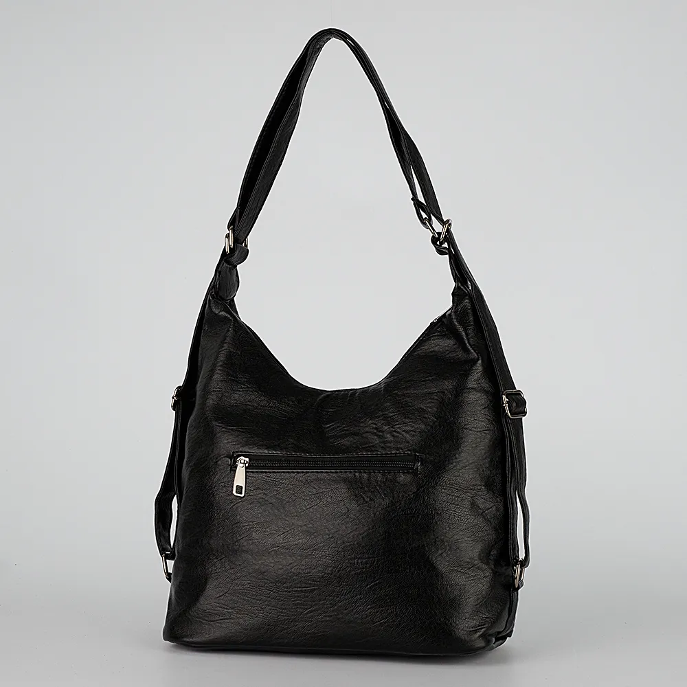 Сумка-рюкзак от торговой марки Passo Avanti из искусственной кожи черного цвета. Модель с двумя ручками, которые при стягивании превращаются в плечевые лямки. Отделение на молнии. Внутри: текстильная подкладка, средник и карман на молнии, два накладных кармана. На лицевой стороне – два кармана на молнии, на задней – карман на молнии.