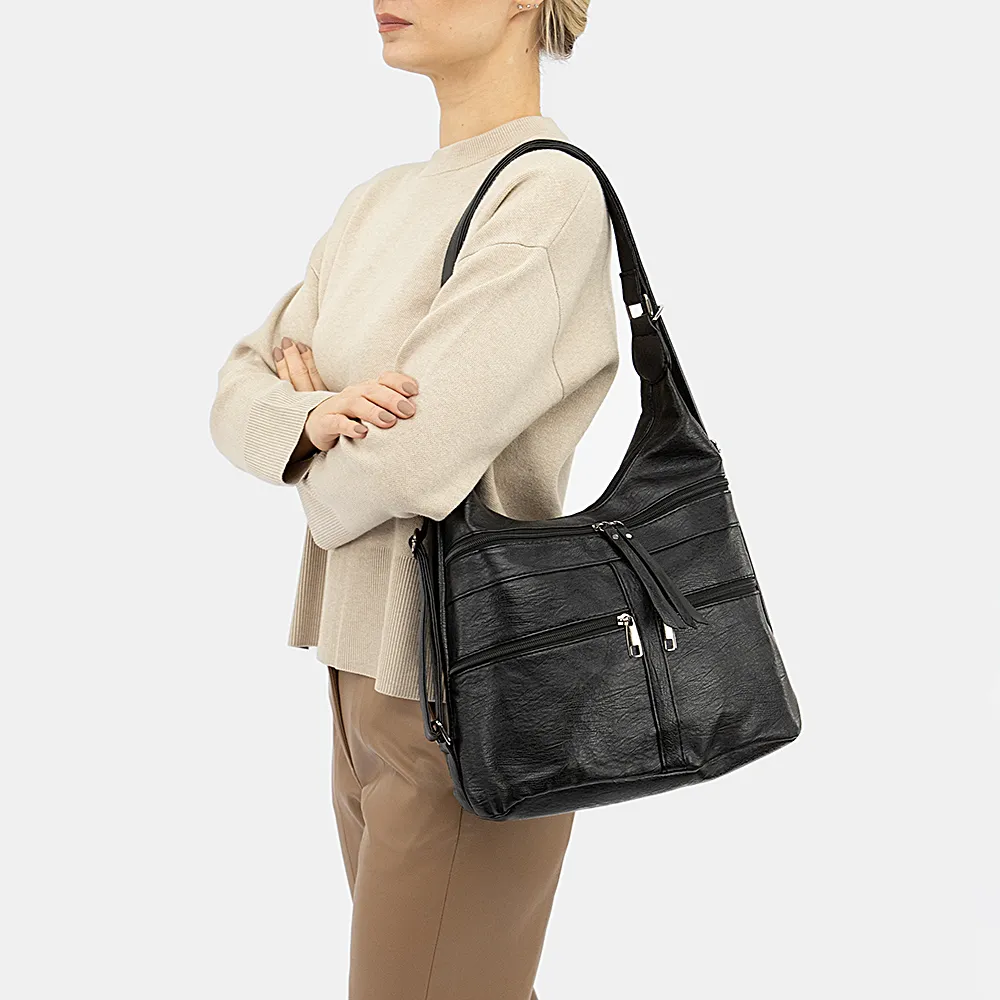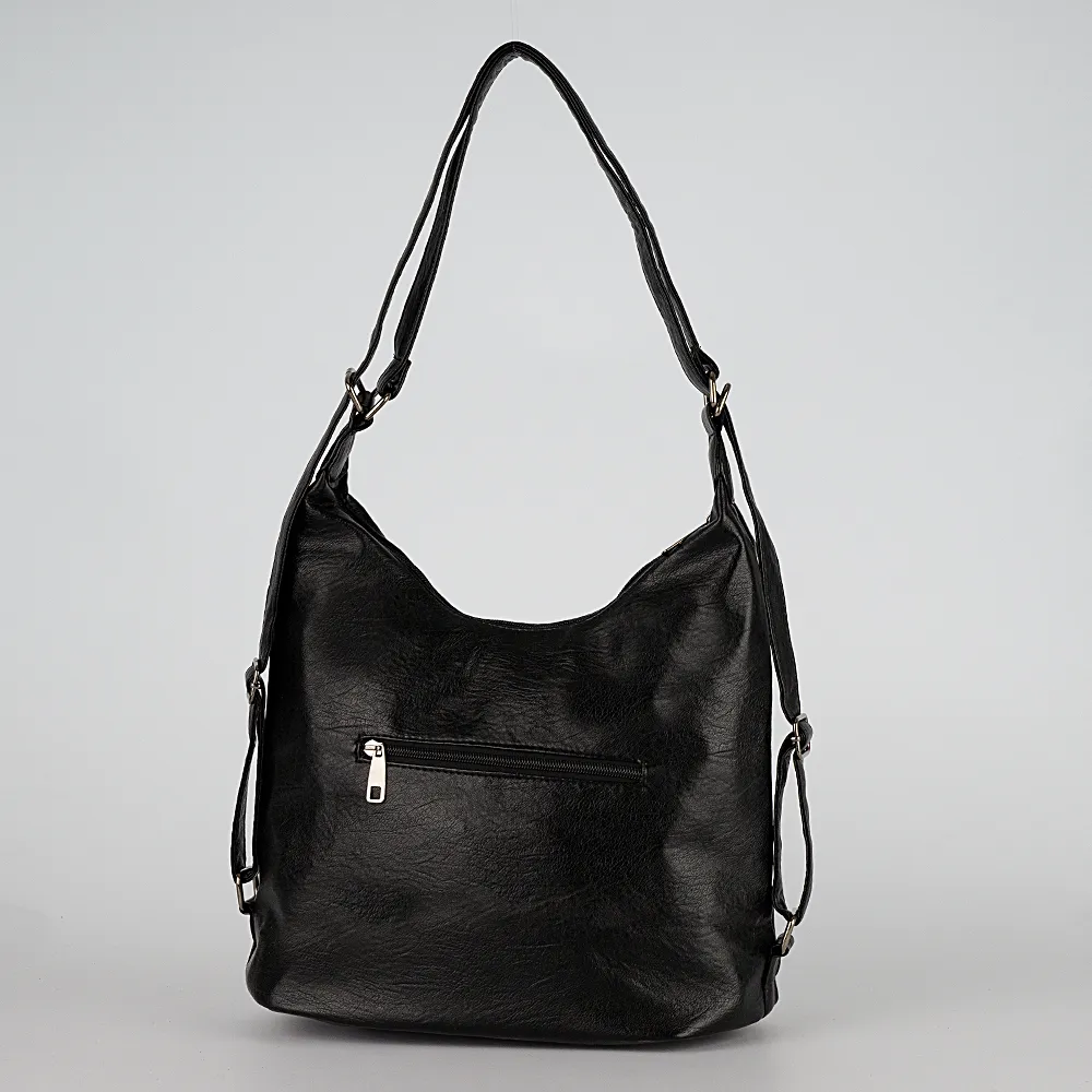 Сумка-рюкзак от торговой марки Passo Avanti из искусственной кожи черного цвета. Модель с двумя ручками, которые при стягивании превращаются в плечевые лямки. Отделение на молнии. Внутри: текстильная подкладка, средник и карман на молнии, два накладных кармана. На лицевой стороне – три кармана на молнии, на задней – карман на молнии.