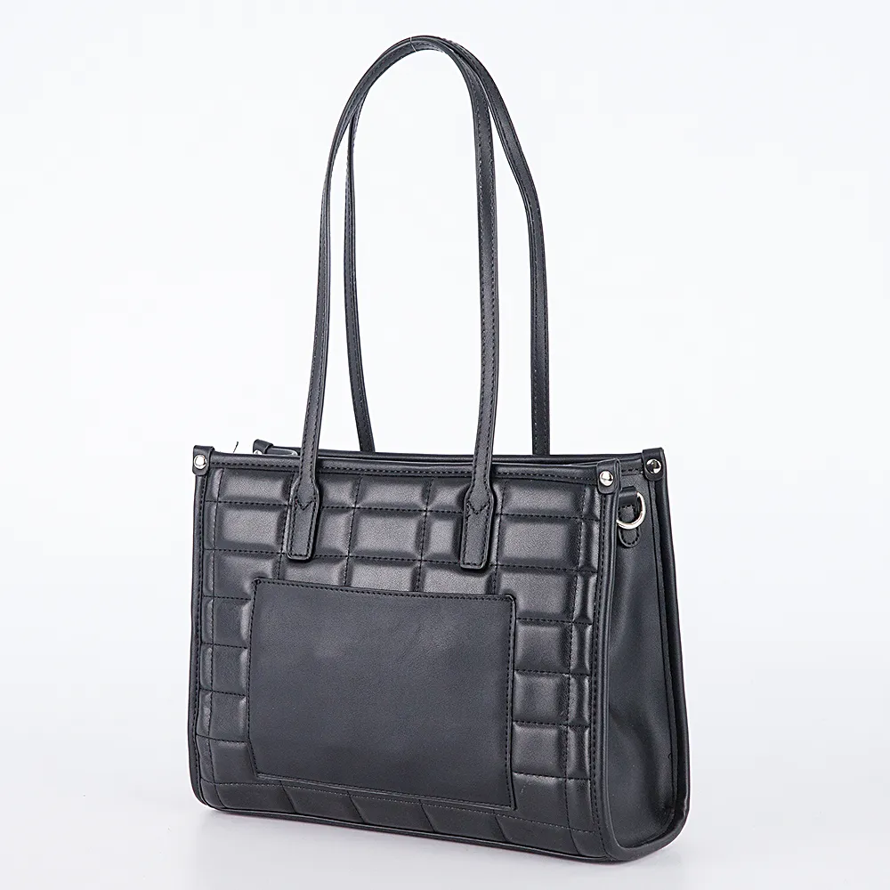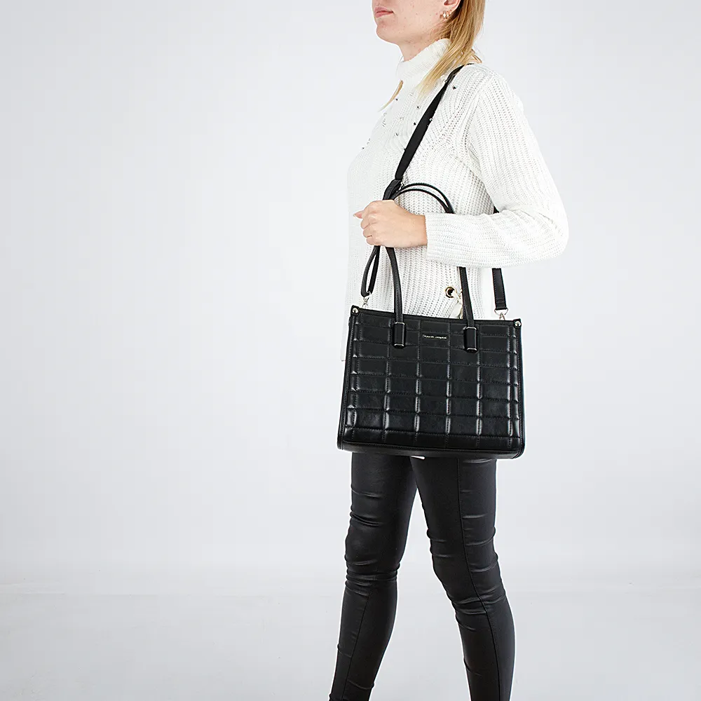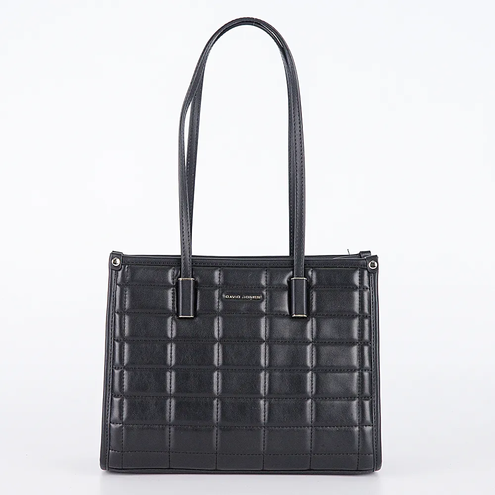 Сумка от торговой марки David Jones из искусственной кожи черного цвета. Декорирована мягкой прямоугольной стежкой. Модель среднего размера с двумя удлиненными ручками. Отделение на молнии. Внутри: фирменная подкладка, карман на молнии, накладной карман. На задней стороне – накладной карман без застежки.