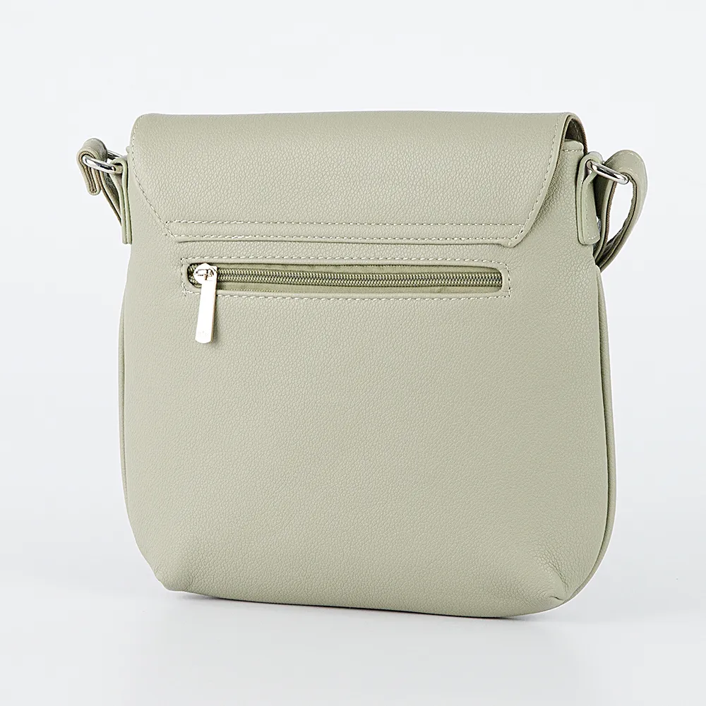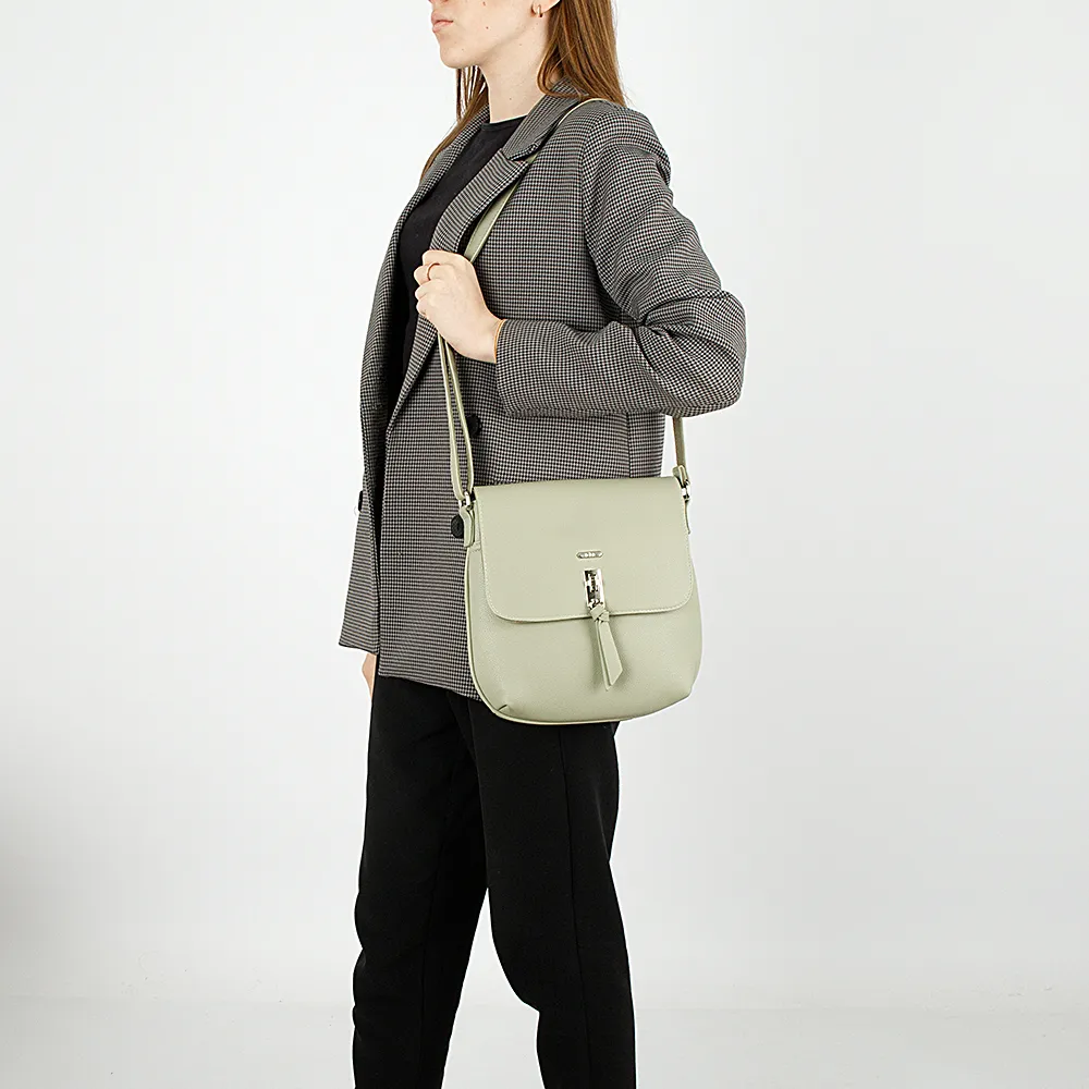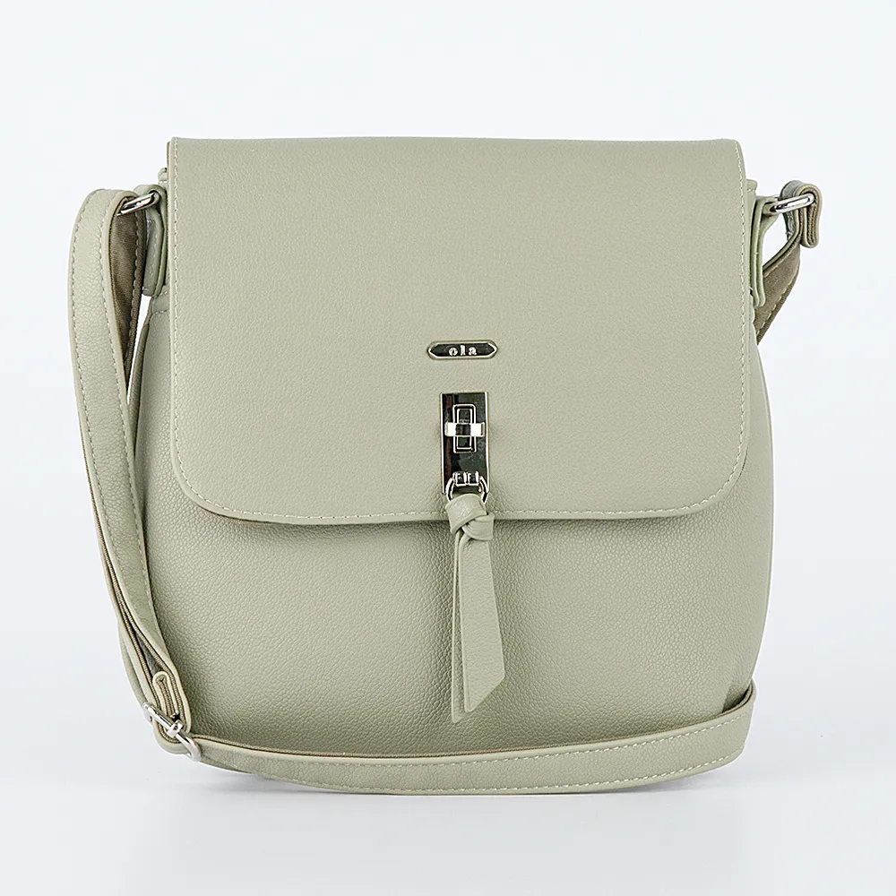 Сумка от торговой марки Ola из искусственной кожи светло-зеленого цвета. Плоская модель вертикальной ориентации с несъемным регулируемым плечевым ремнем. Клапан на поворотном замке закрывает накладной карман и отделение на молнии. Внутри: фирменная подкладка, карман на молнии. На задней стороне – карман на молнии.
