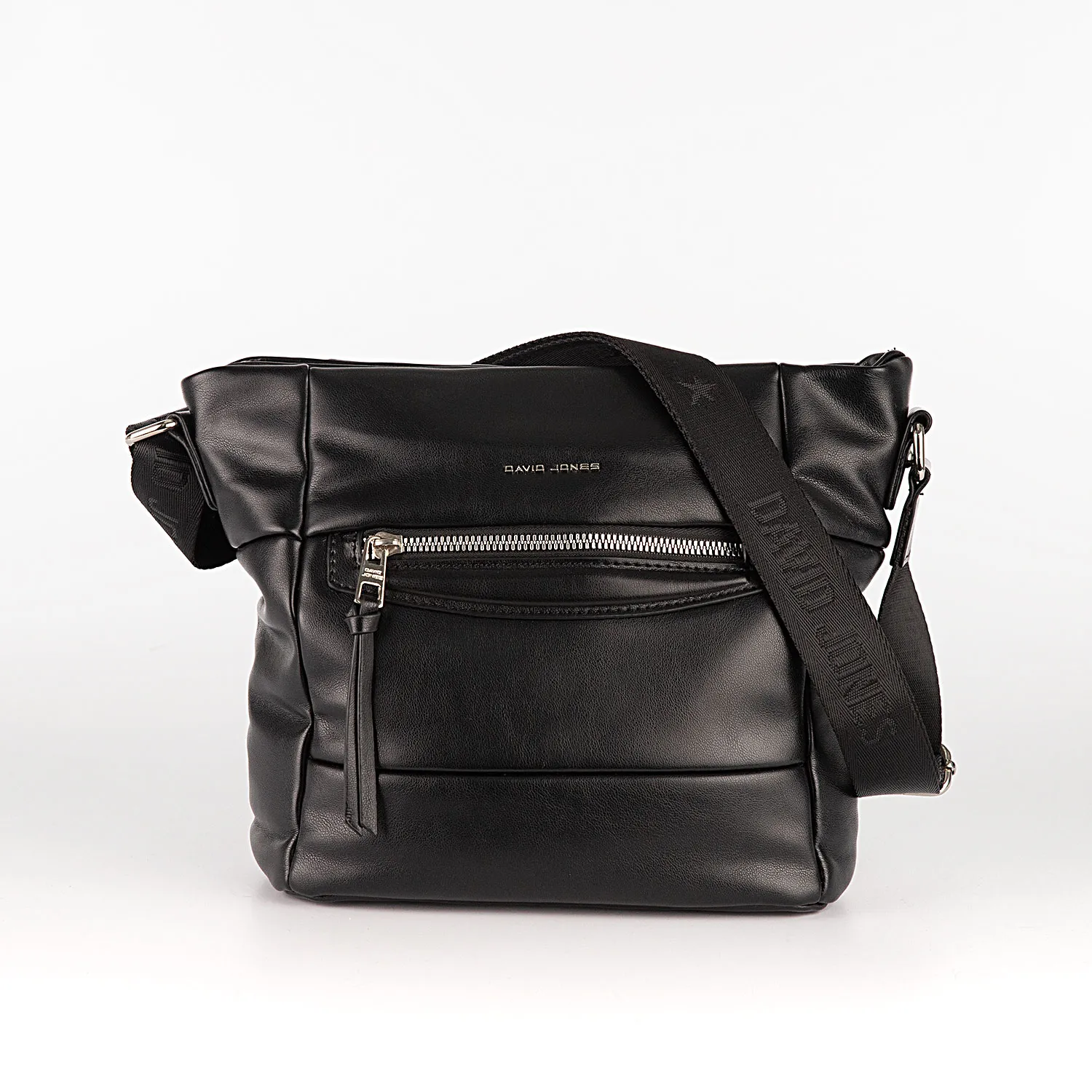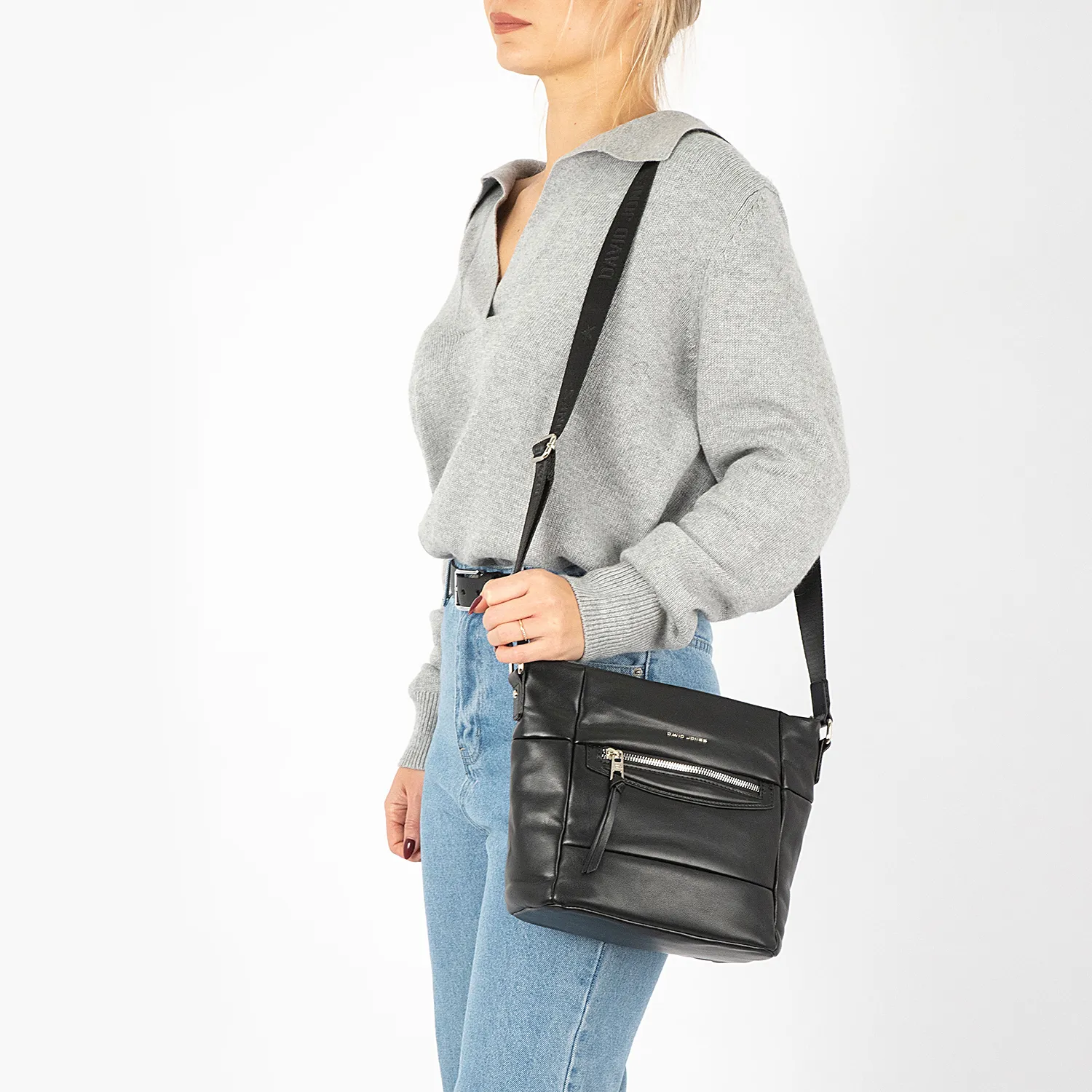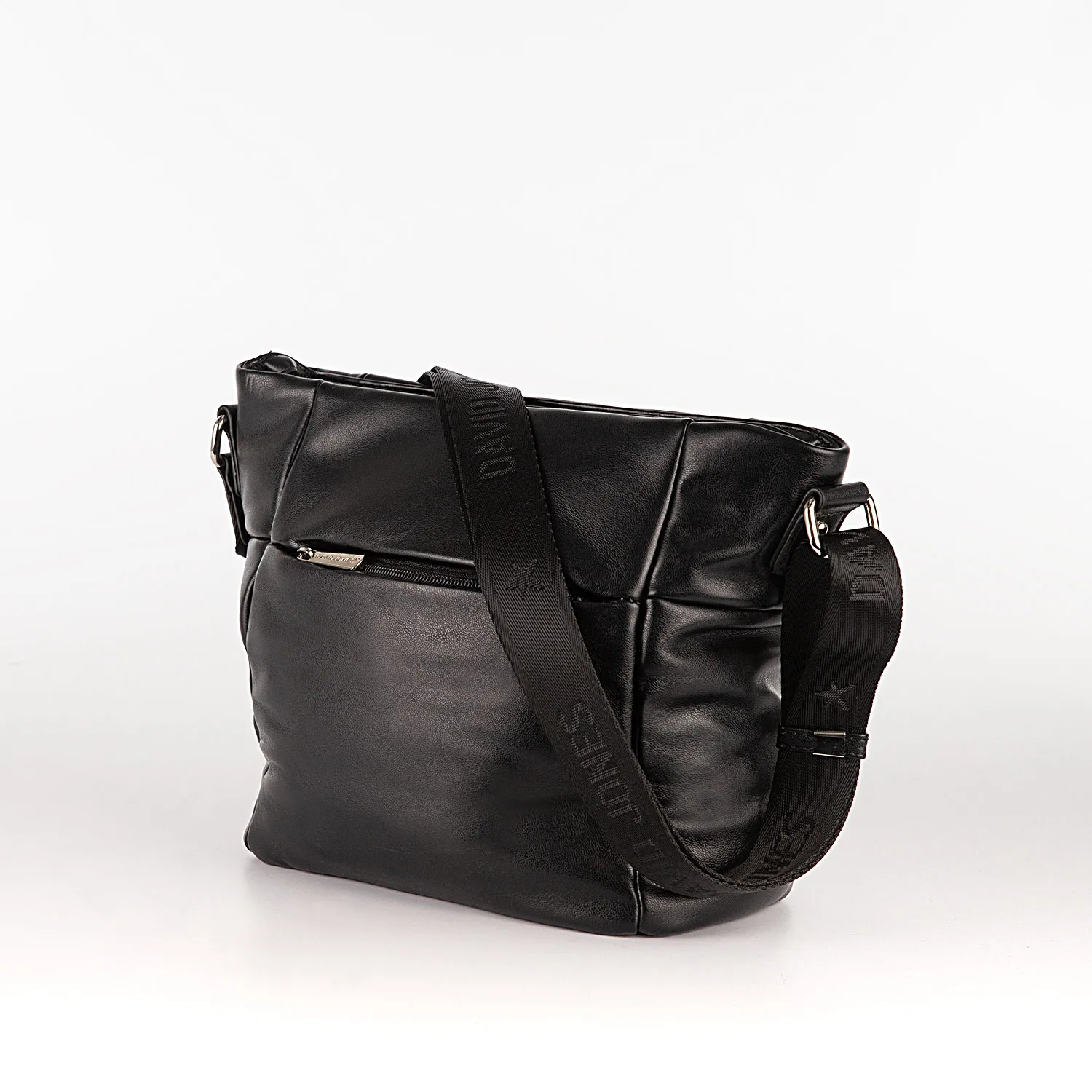 Сумка от торговой марки David Jones из экокожи черного цвета. Модель с несъемным регулируемым плечевым ремнем, выполненным из текстильного материала. Отделение на молнии. Внутри: фирменная подкладка, карман на молнии, накладной карман. На лицевой и задней сторонах – карман на молнии.