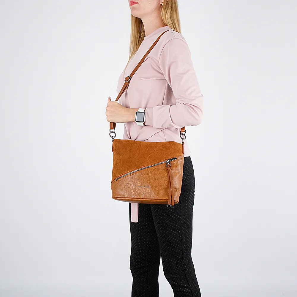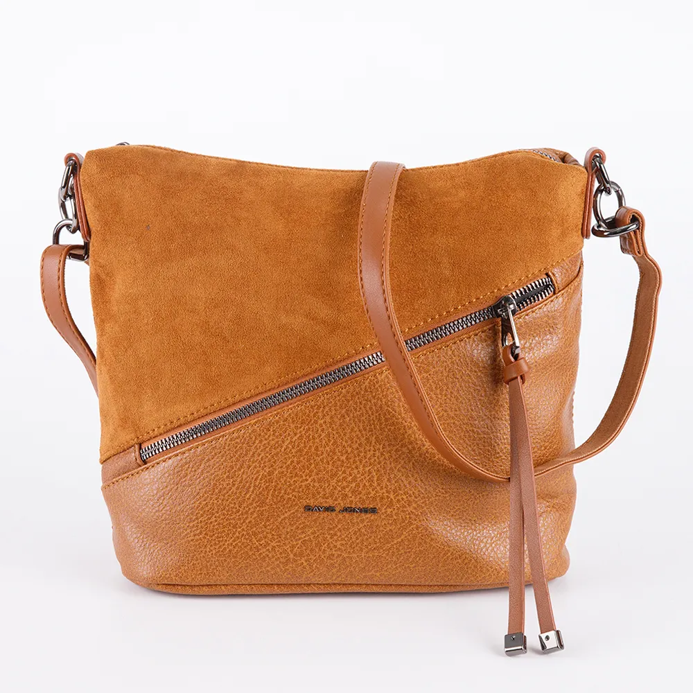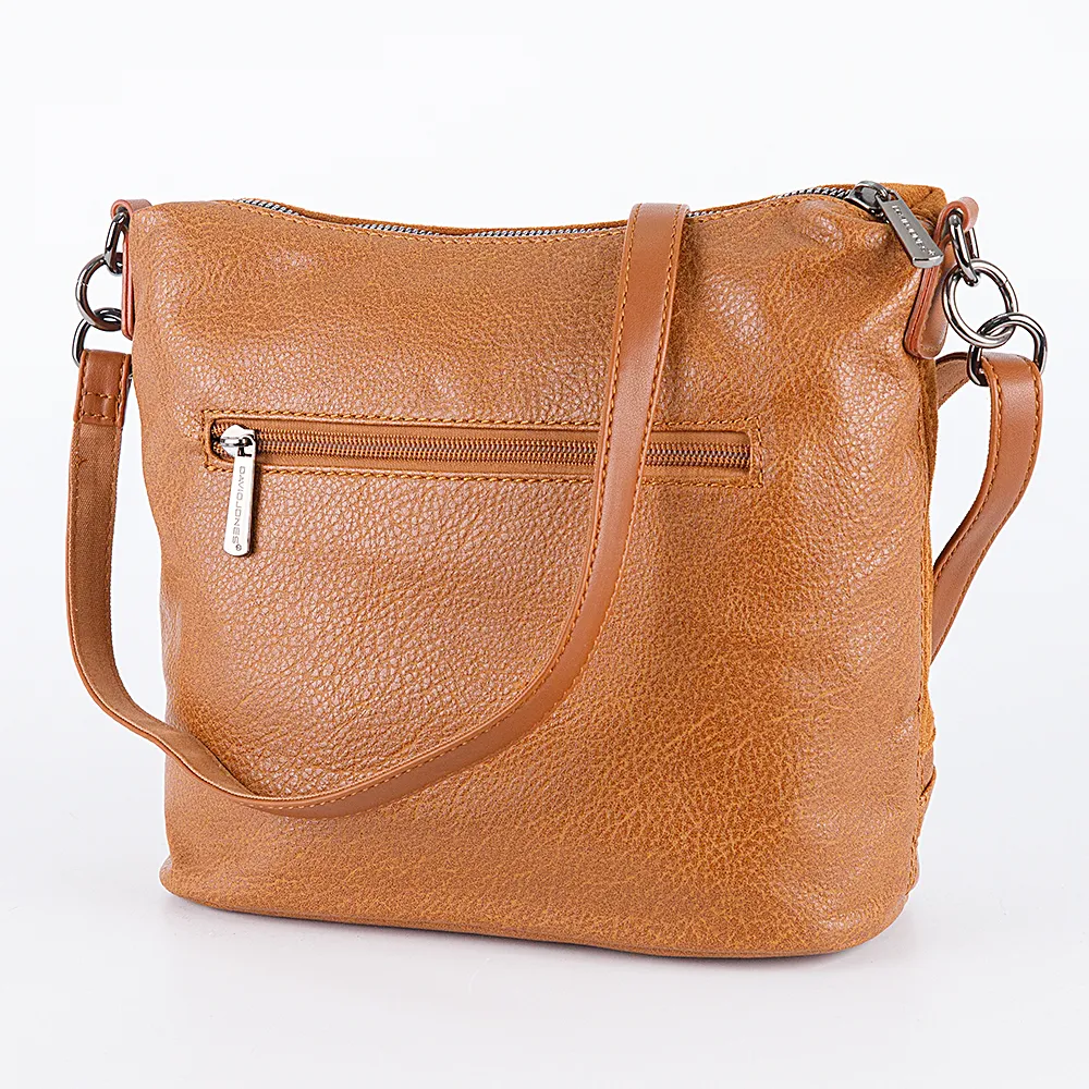Сумка от торговой марки David Jones из искусственной кожи коньячного цвета. Лицевая сторона декорирована мягкой бархатистой вставкой. Компактная модель с несъемным регулируемым плечевым ремнем. Отделение на молнии. Внутри: фирменная подкладка, карман на молнии, вместительный накладной карман. На лицевой и задней сторонах – карман на молнии.