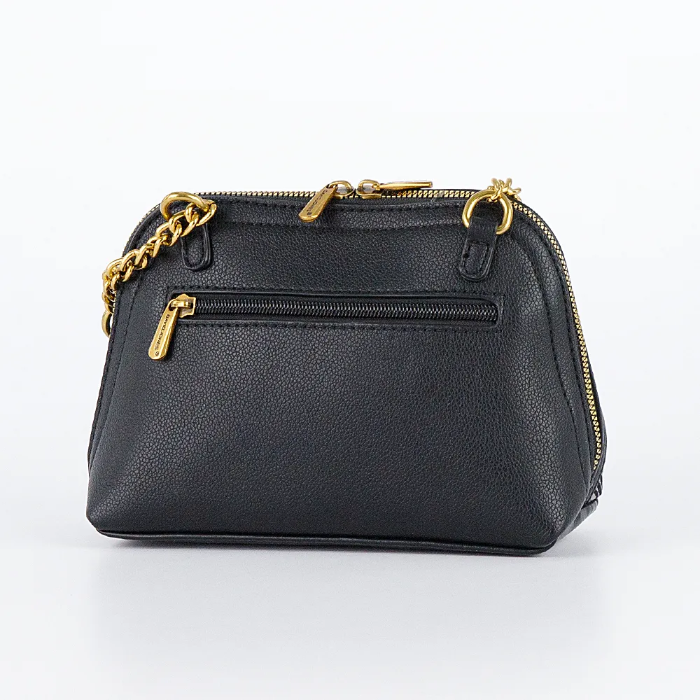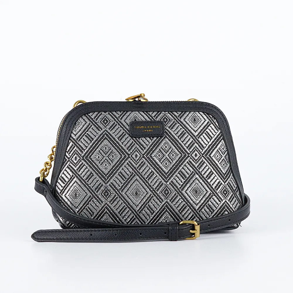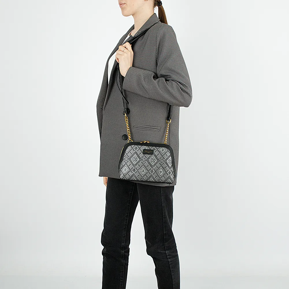 Сумка от торговой марки David Jones из искусственной кожи черного цвета и текстильного материала серебристо-серого цвета с оригинальным тканым ромбовидным узором. Компактная модель с несъемным регулируемым плечевым ремнем-цепочкой. Отделение на молнии по трем сторонам, что обеспечивает удобный доступ. Внутри: фирменная подкладка, карман на молнии, накладной карман. На задней стороне – карман на молнии.
