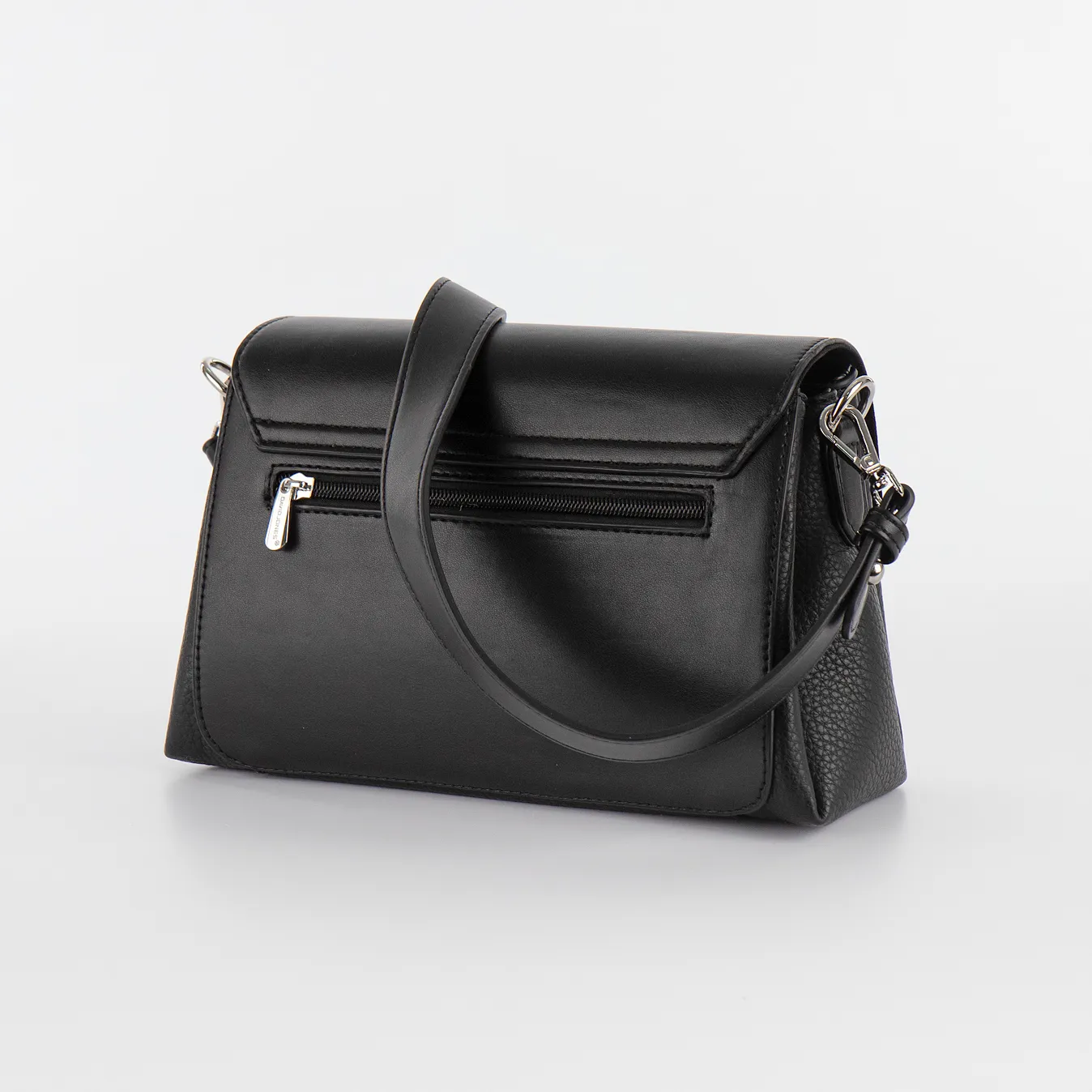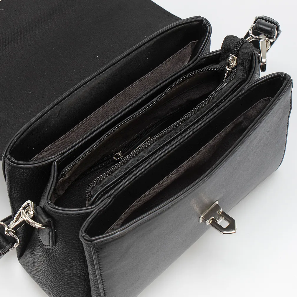 Сумка от торговой марки David Jones из искусственной кожи черного цвета. Модель со съемной ручкой и съемным регулируемым плечевым ремнем. Закрывается клапаном на поворотном замке. Внутри: три отделения с фирменной подкладкой. Среднее отделение на молнии; внутри: карман на молнии, накладной карман. На задней стороне – карман на молнии.