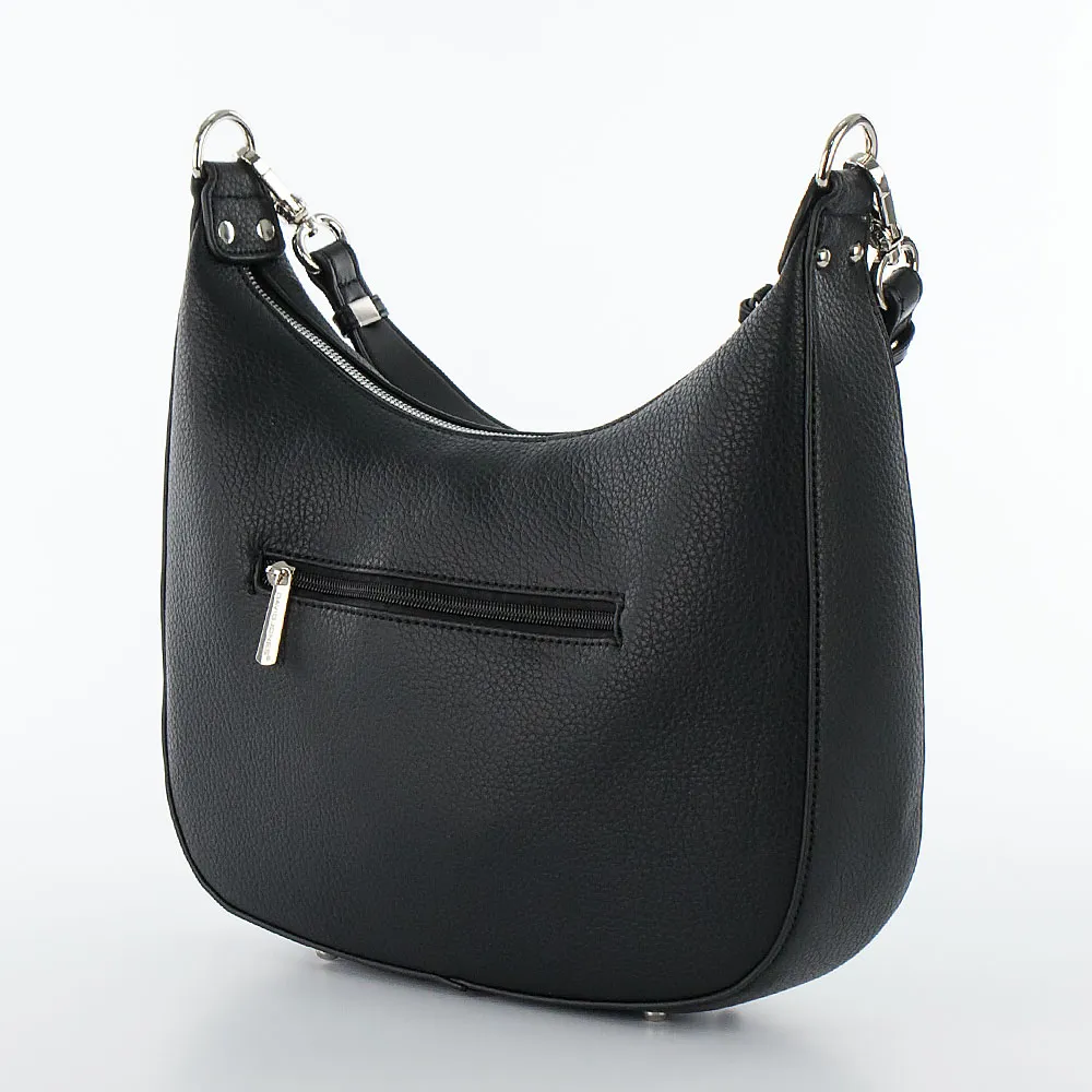 Сумка от торговой марки David Jones из искусственной зернистой кожи черного цвета. Модель среднего размера с одной съемной ручкой и съемным регулируемым плечевым ремнем. Отделение на молнии с длинным кожаным пуллером. Внутри: фирменная подкладка, карман на молнии, накладной карман. На задней стороне – карман на молнии.