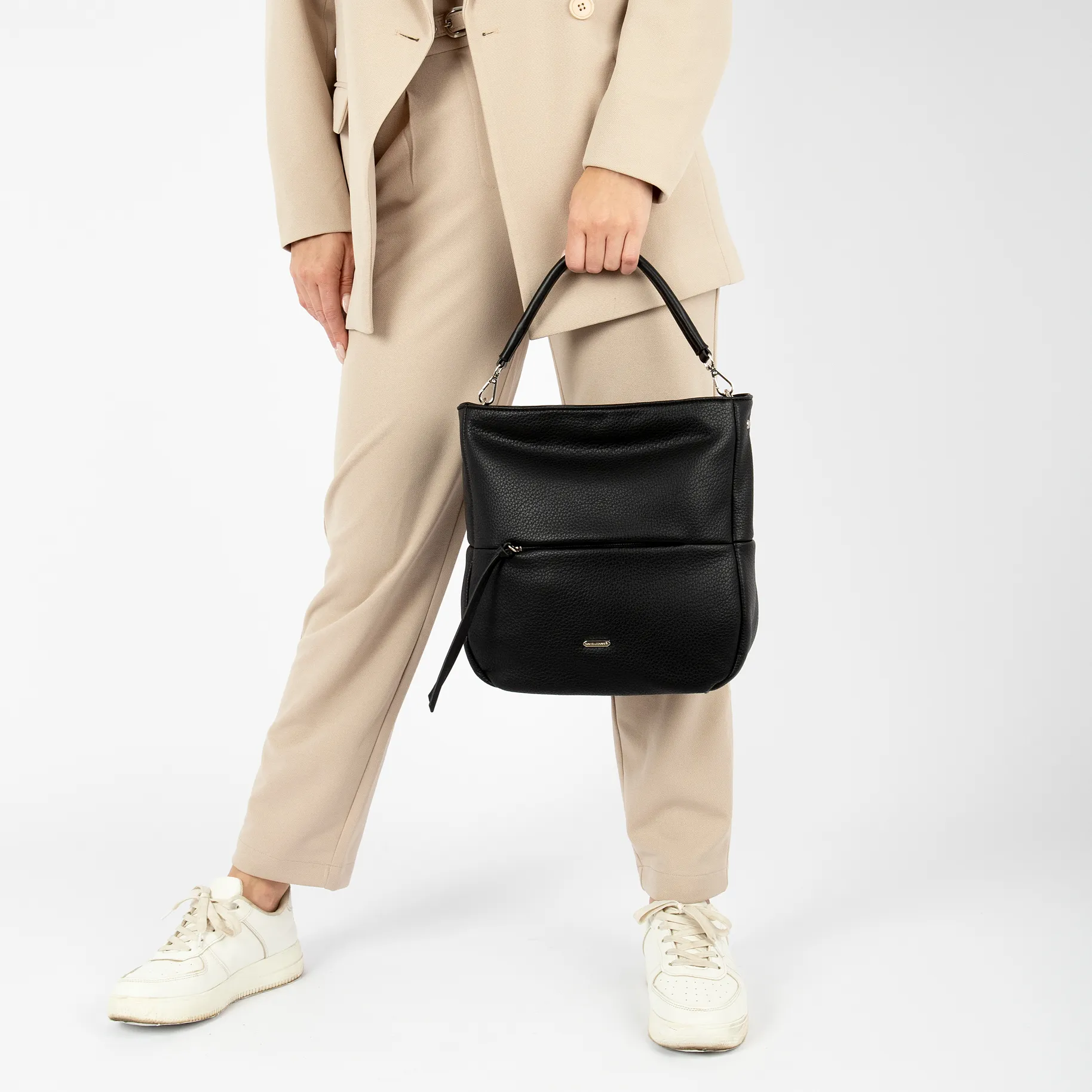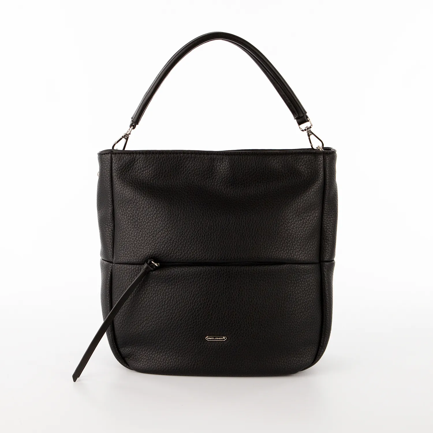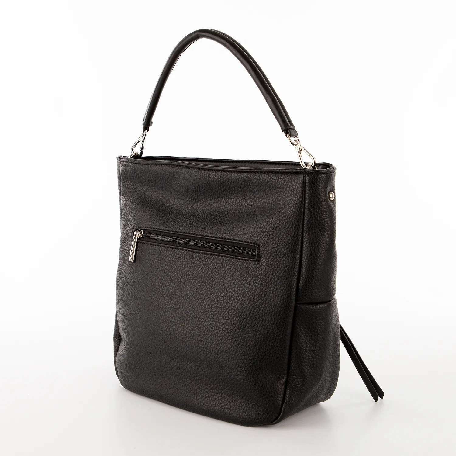 Сумка от торговой марки David Jones из искусственной зернистой кожи черного цвета. Модель со съемной ручкой и съемным регулируемым плечевым ремнем. Отделение на молнии. Внутри: фирменная подкладка, карман на молнии, накладной карман. На лицевой и задней сторонах – карман на молнии.