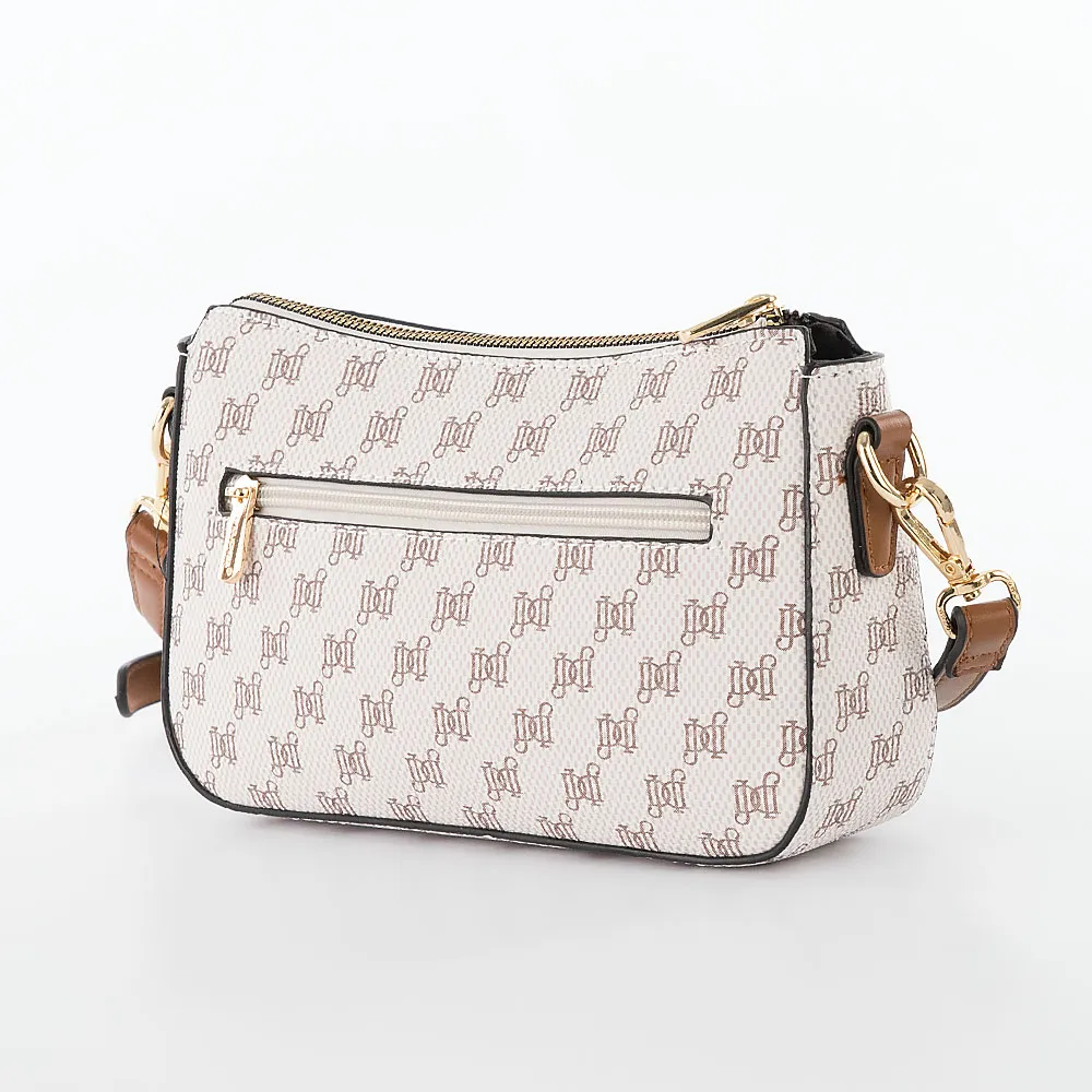 Сумка от торговой марки David Jones из искусственной кожи бежевого цвета. Декорирована оригинальным принтом с монограммой бренда. Модель со съемным регулируемым плечевым ремнем. Отделение на молнии. Внутри: фирменная подкладка, карман на молнии, накладной карман. На задней стороне – карман на молнии.