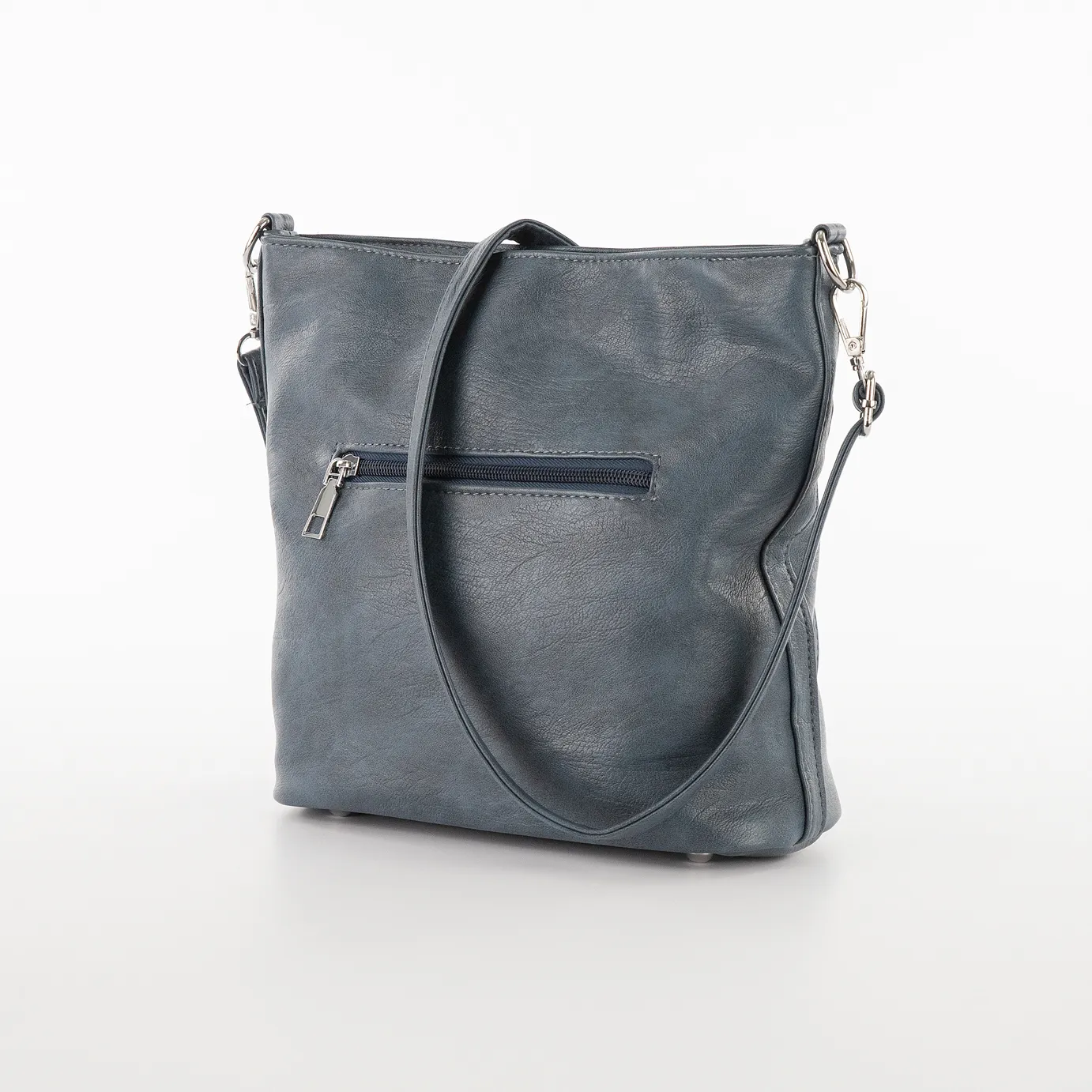 Сумка от торговой марки Passo Avanti из искусственной кожи синего цвета. Модель со съемным регулируемым плечевым ремнем. Отделение на молнии. Внутри: текстильная подкладка, средник и карман на молнии, накладной карман. На лицевой стороне – карман на скрытой молнии, на задней – карман на молнии. Дно оснащено металлическими ножками для защиты от износа.