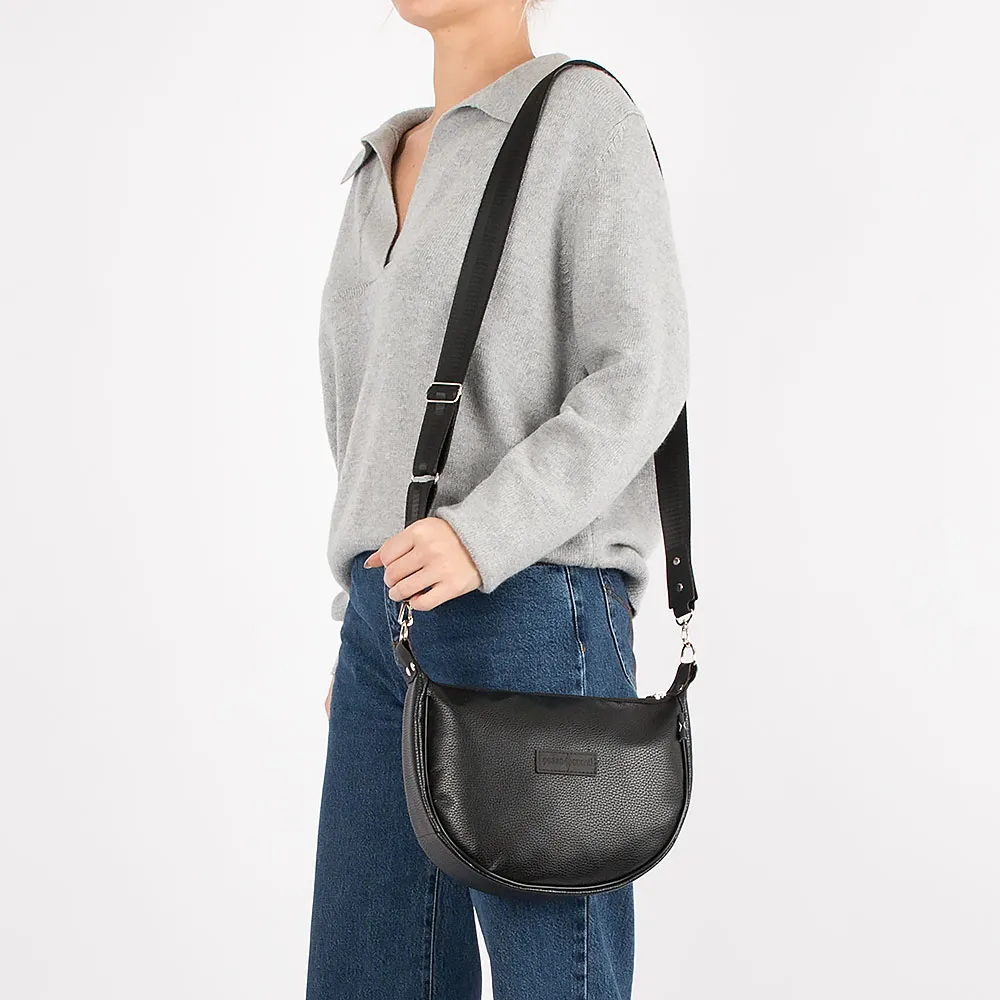 Сумка от торговой марки Passo Avanti из искусственной кожи черного цвета. Модель-седло в форме полукруга со съемным регулируемым плечевым ремнем, выполненным из текстильного материала. Отделение на молнии. Внутри: текстильная подкладка, карман на молнии, накладной карман.