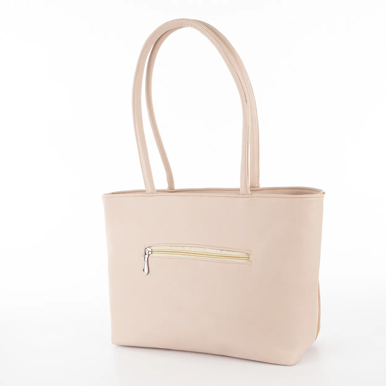 Сумка от торговой марки Passo Avanti из искусственной кожи в сочетании бежевого и кофейного цвета. Лицевая сторона декорирована вставкой с тиснением под рептилию. Модель с двумя удлиненными ручками. Два отделения на молнии с текстильной подкладкой. В одном из них – карман на молнии, в другом – накладной карман. На задней стороне – карман на молнии.