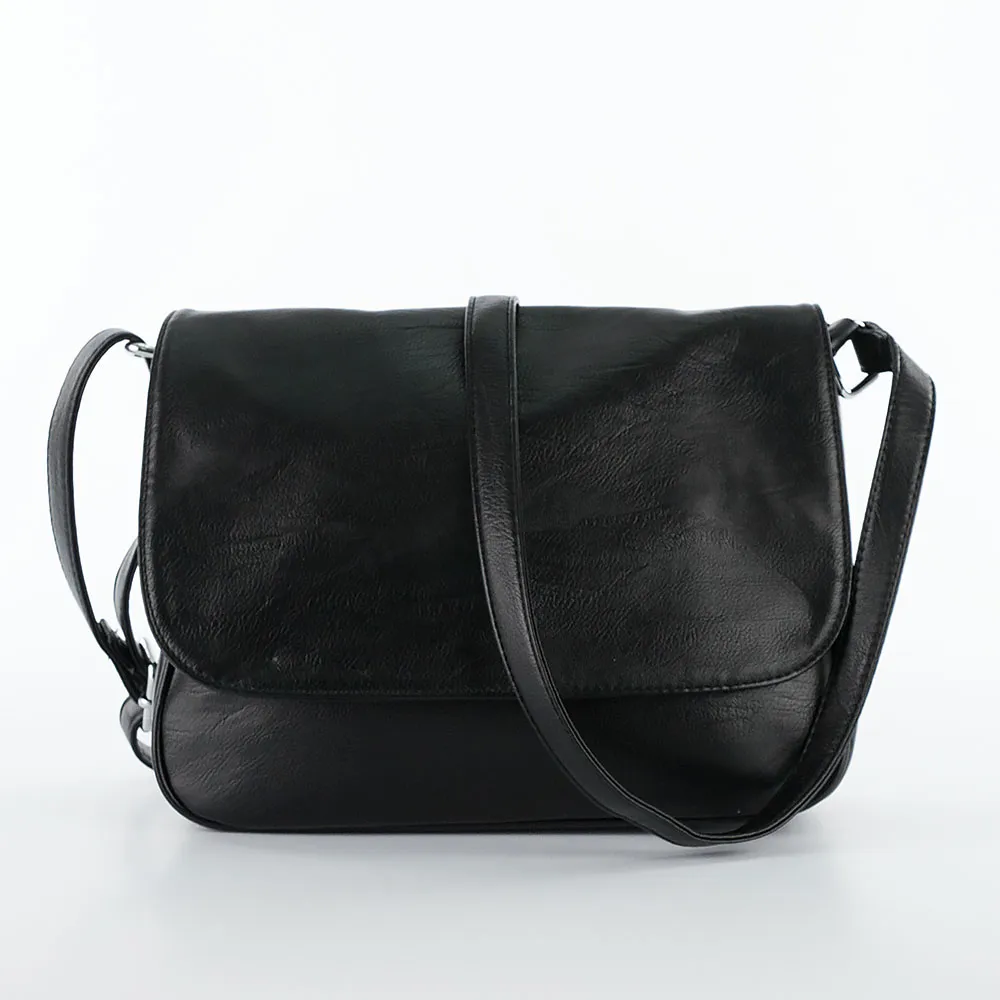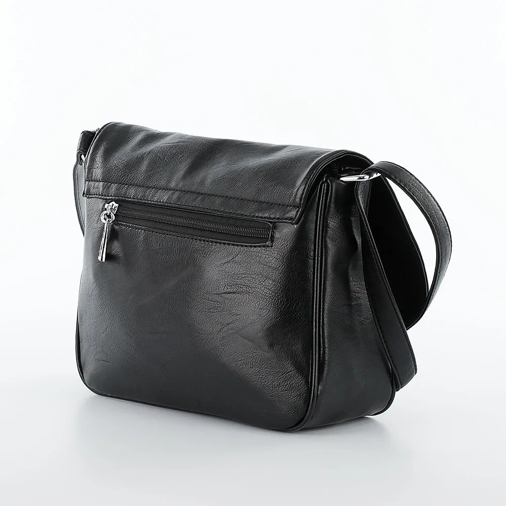 Сумка от торговой марки Passo Avanti из искусственной кожи черного цвета. Модель с несъемным регулируемым плечевым ремнем. Закрывается клапаном на магнитной кнопке. Отделение на молнии. Внутри: текстильная подкладка, средник и карман на молнии, накладной карман. На задней стороне – карман на молнии.