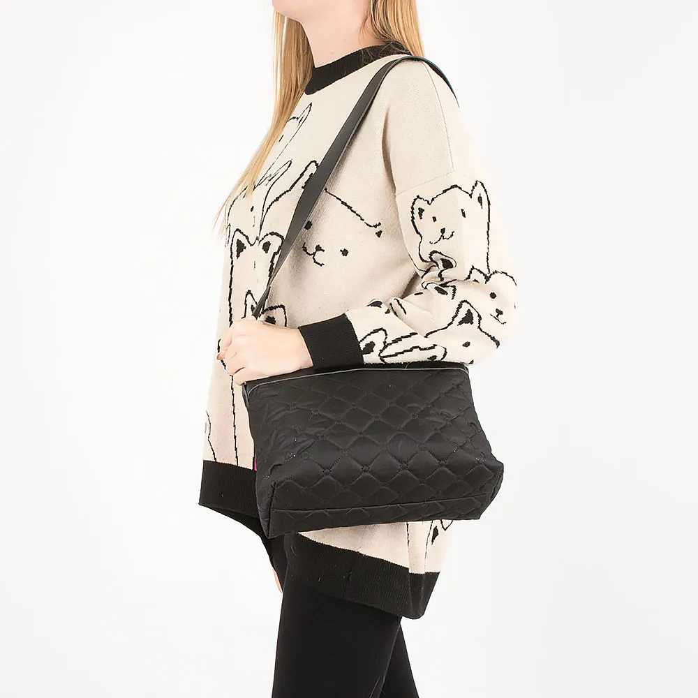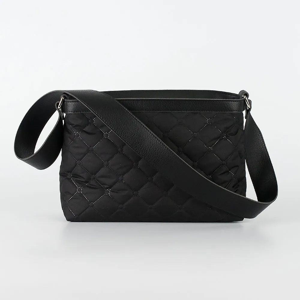 Сумка от торговой марки Galanteya из искусственной кожи и синтетического материала черного цвета. Декорирована блинтовым тиснением под ромбовидную стежку. Модель мягкой конструкции с широким несъемным плечевым ремнем. Отделение на молнии. Внутри: фирменная подкладка, накладной карман. На задней стороне – карман на молнии.