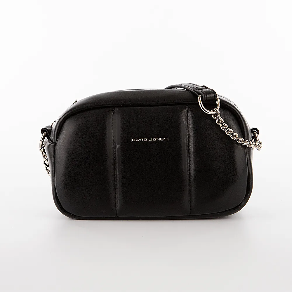 Сумка от торговой марки David Jones из искусственной кожи черного цвета. Лицевая сторона декорирована вертикальной строчкой. Модель с несъемным регулируемым плечевым ремнем-цепочкой. Отделение на молнии. Внутри: фирменная подкладка, карман на молнии, накладной карман.
