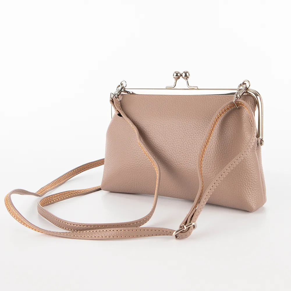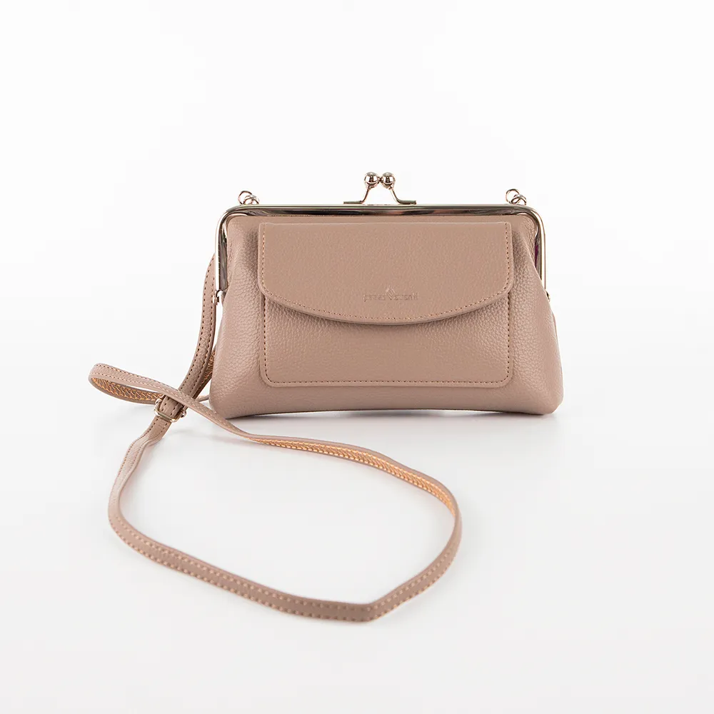 Сумка-кошелек от торговой марки Passo Avanti из искусственной кожи бежевого цвета. Модель со съемным регулируемым плечевым ремнем. Отделение с застежкой фермуар; внутри: текстильная подкладка, карман для карт. На лицевой стороне – накладной карман с клапаном на кнопке.