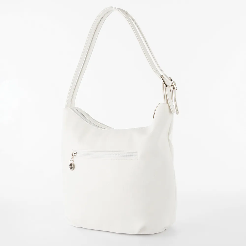 Сумка от торговой марки Passo Avanti из искусственной кожи белого цвета. Модель с двумя удлиненными ручками. Два отделения на молнии, с текстильной подкладкой. В заднем отделении – карман на молнии, в переднем – два накладных кармана. Сбоку – два кармана на молнии. На задней стороне – карман на молнии.
