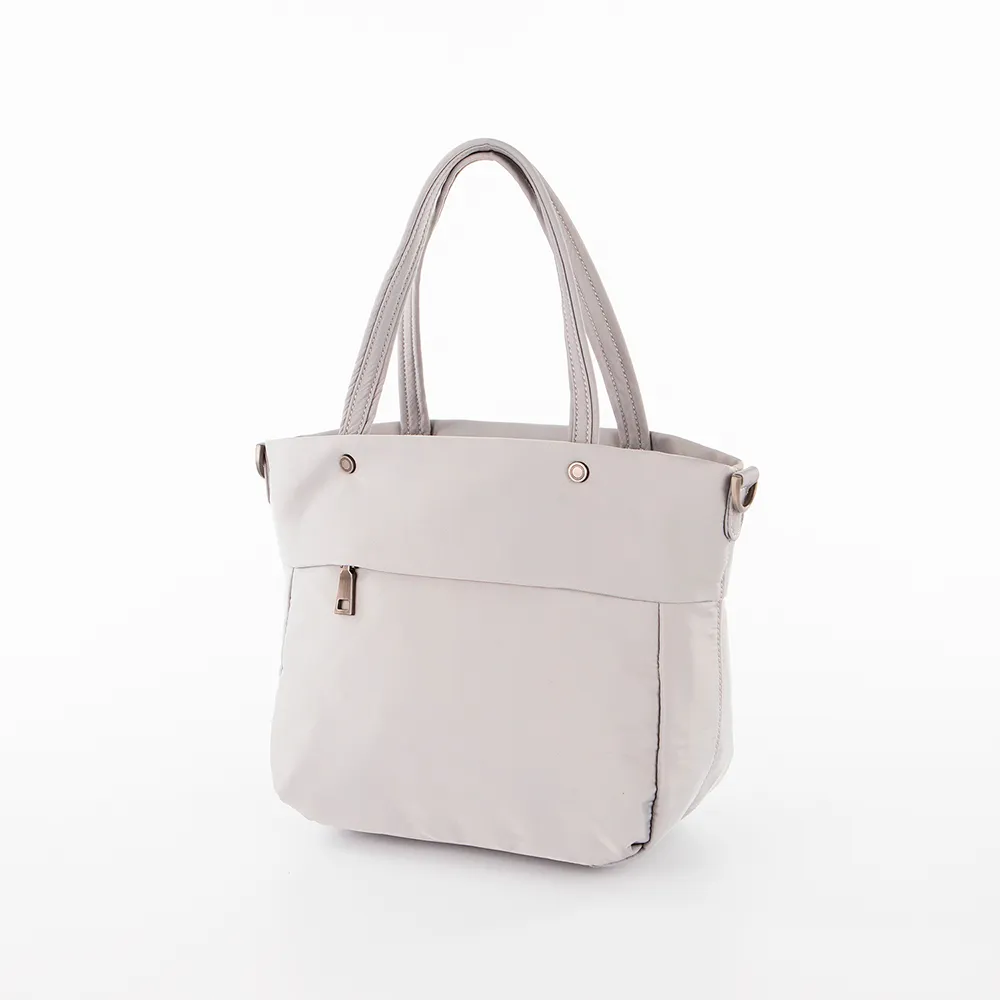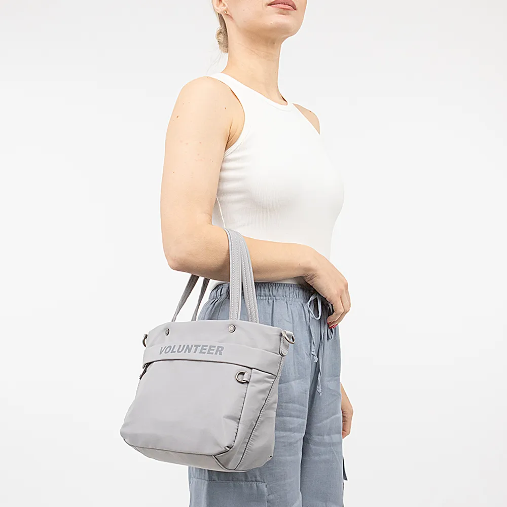 Сумка от торговой марки Volunteer из практичного прочного текстильного материала светло-серого цвета. Модель с двумя удлиненными ручками и съемным плечевым ремнем. Отделение на молнии. Внутри: текстильная подкладка, карман на молнии, два накладных кармана. На лицевой и задней сторонах – карман на молнии. Спереди имеется кольцо для крепления.