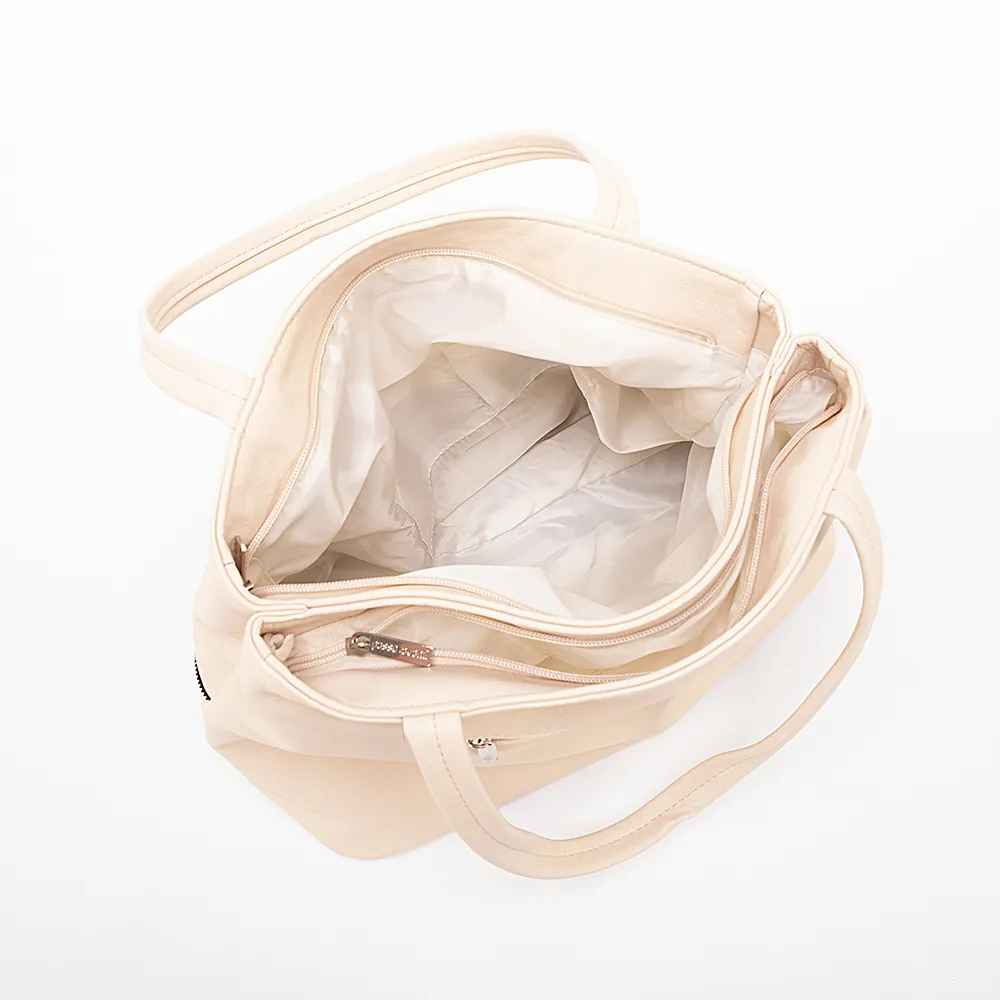 Сумка от торговой марки Passo Avanti из искусственной кожи бежевого цвета. Модель с двумя ручками. Два отделения на молнии, с текстильной подкладкой и карманами. На лицевой стороне – два кармана на молнии, на задней – карман на молнии.