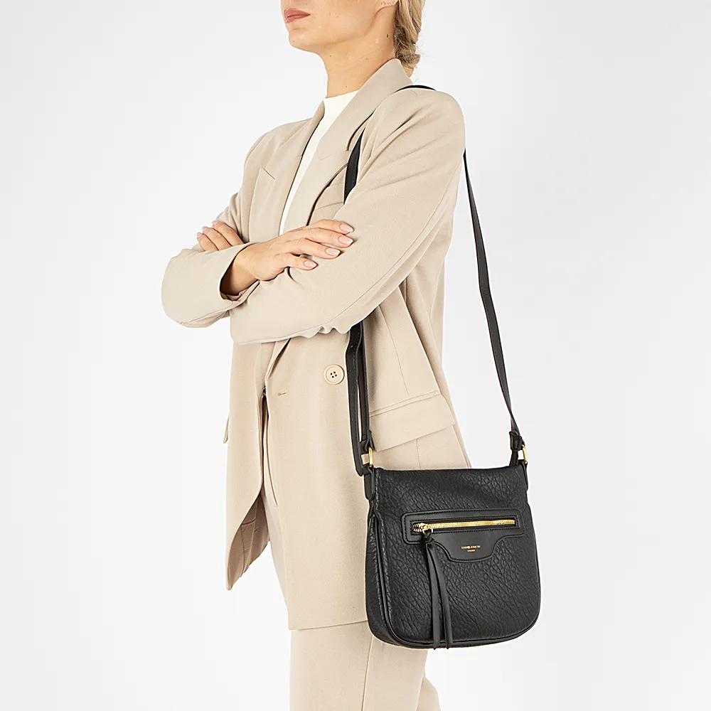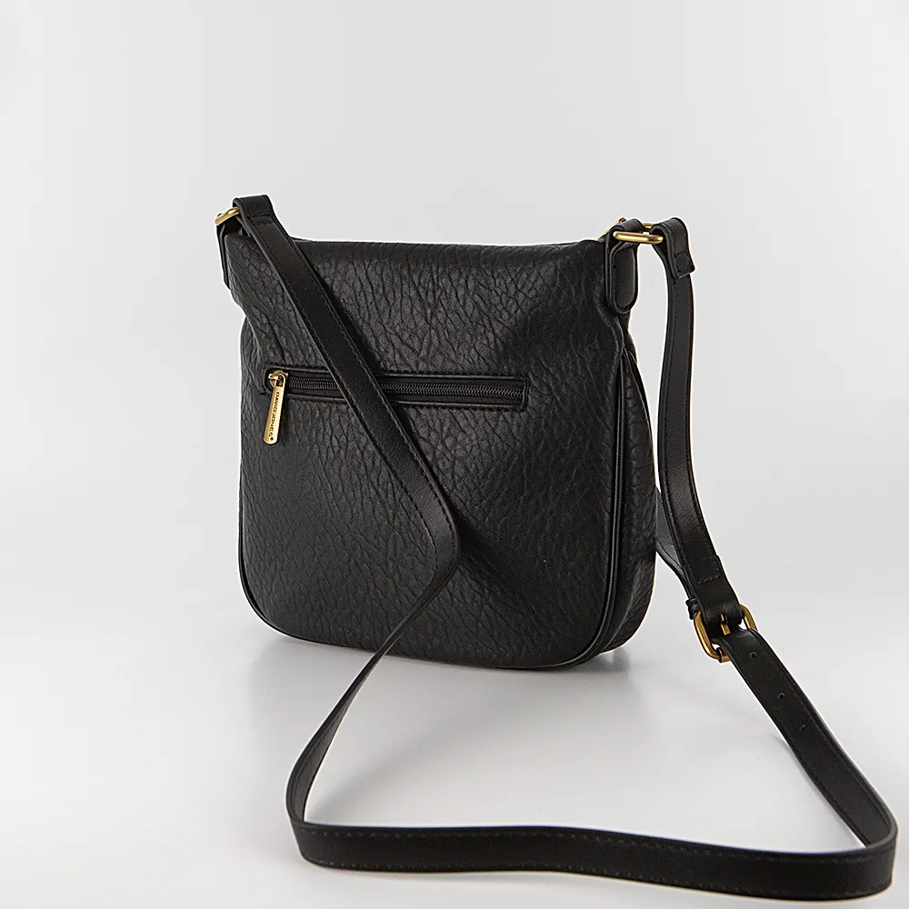 Сумка от торговой марки David Jones из искусственной кожи в черном цвете. Плоская модель кросс-боди со съемным регулируемым плечевым ремнем. Отделение на молнии. Внутри: фирменная подкладка, карман на молнии, накладной карман. На лицевой и задней сторонах – карман на молнии.