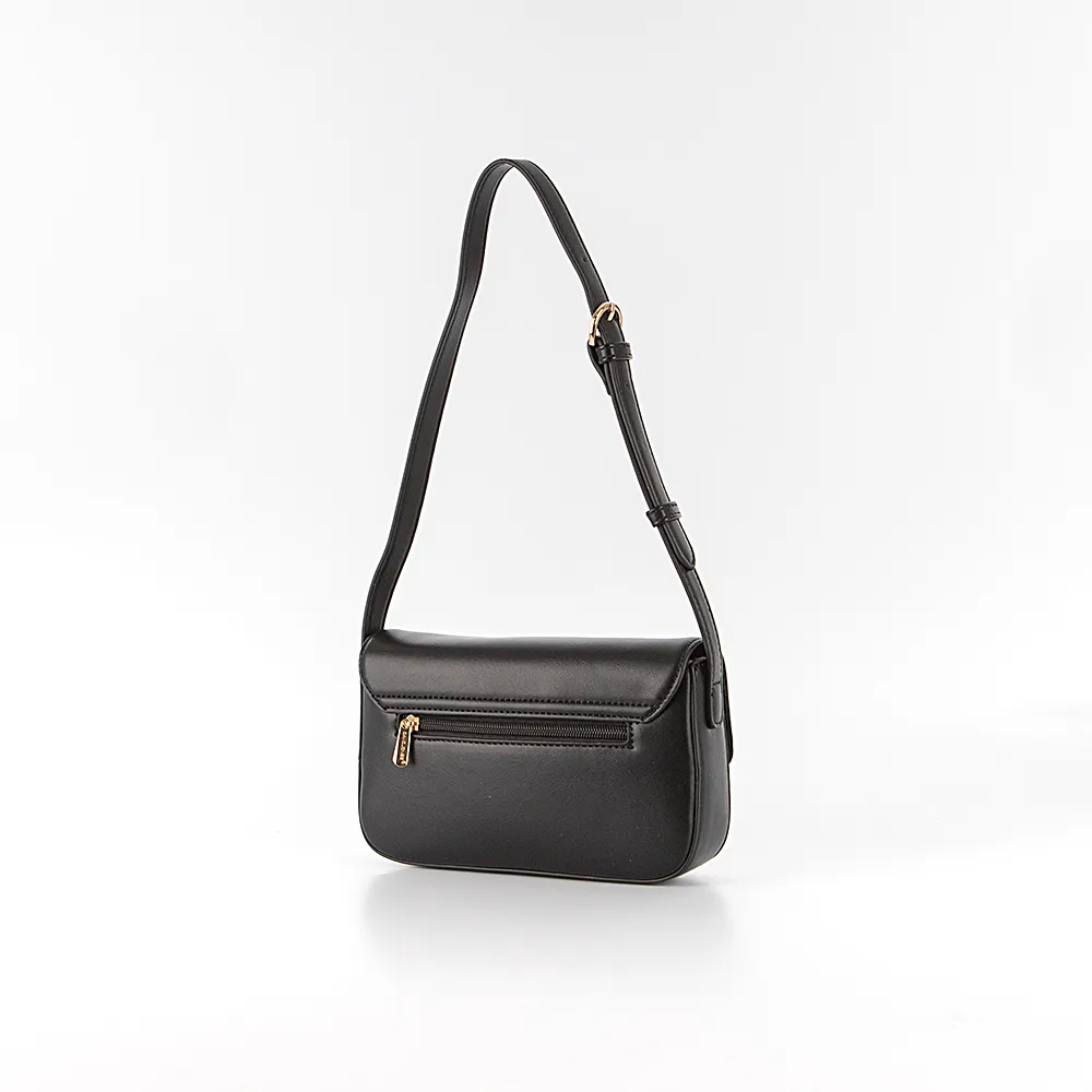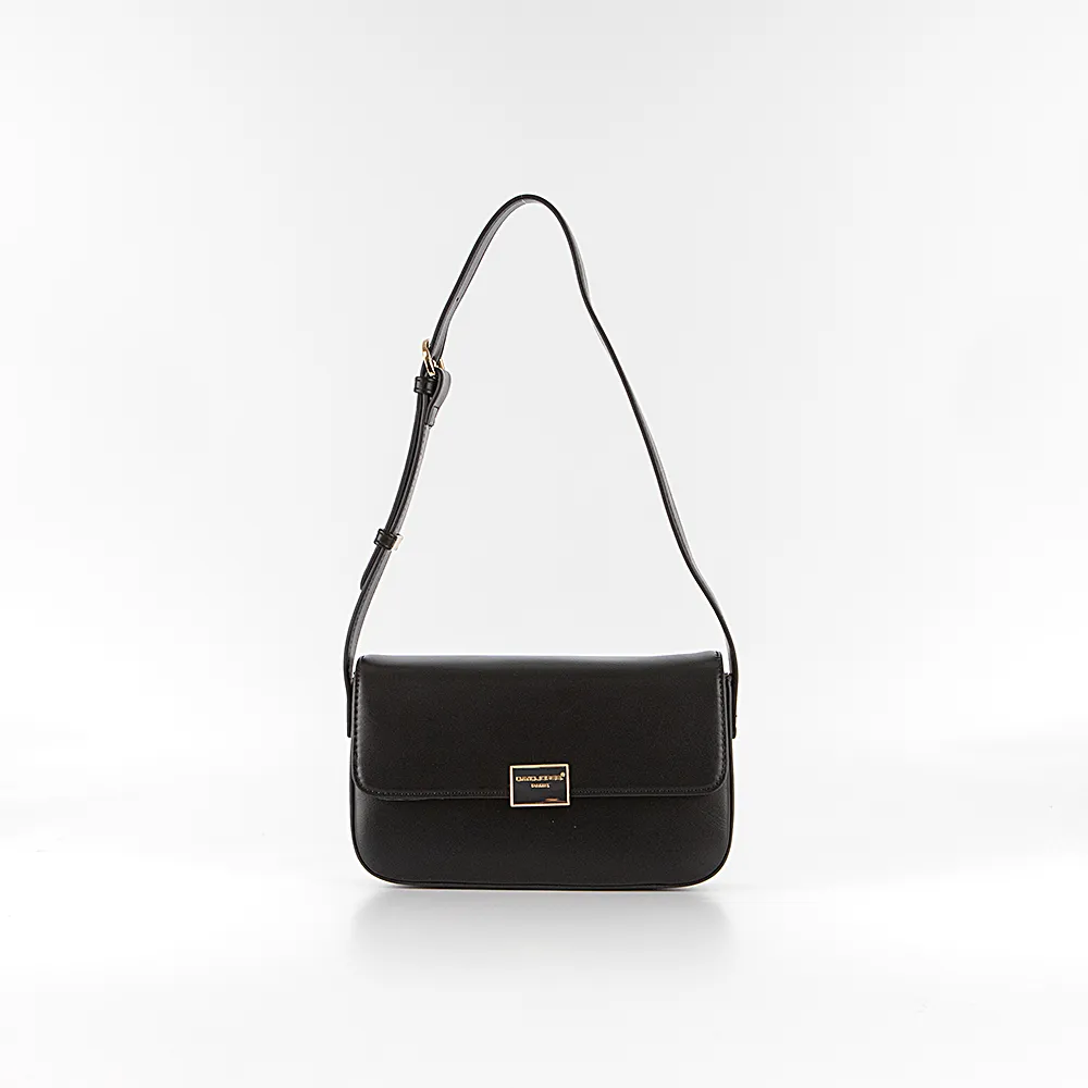 Сумка от торговой марки David Jones из искусственной кожи черного цвета. Модель с несъемной удлиненной ручкой и съемным плечевым ремнем. Закрывается клапаном на магнитной кнопке. Отделение на молнии. Внутри: фирменная подкладка, карман на молнии, накладной карман. На задней стороне – карман на молнии.