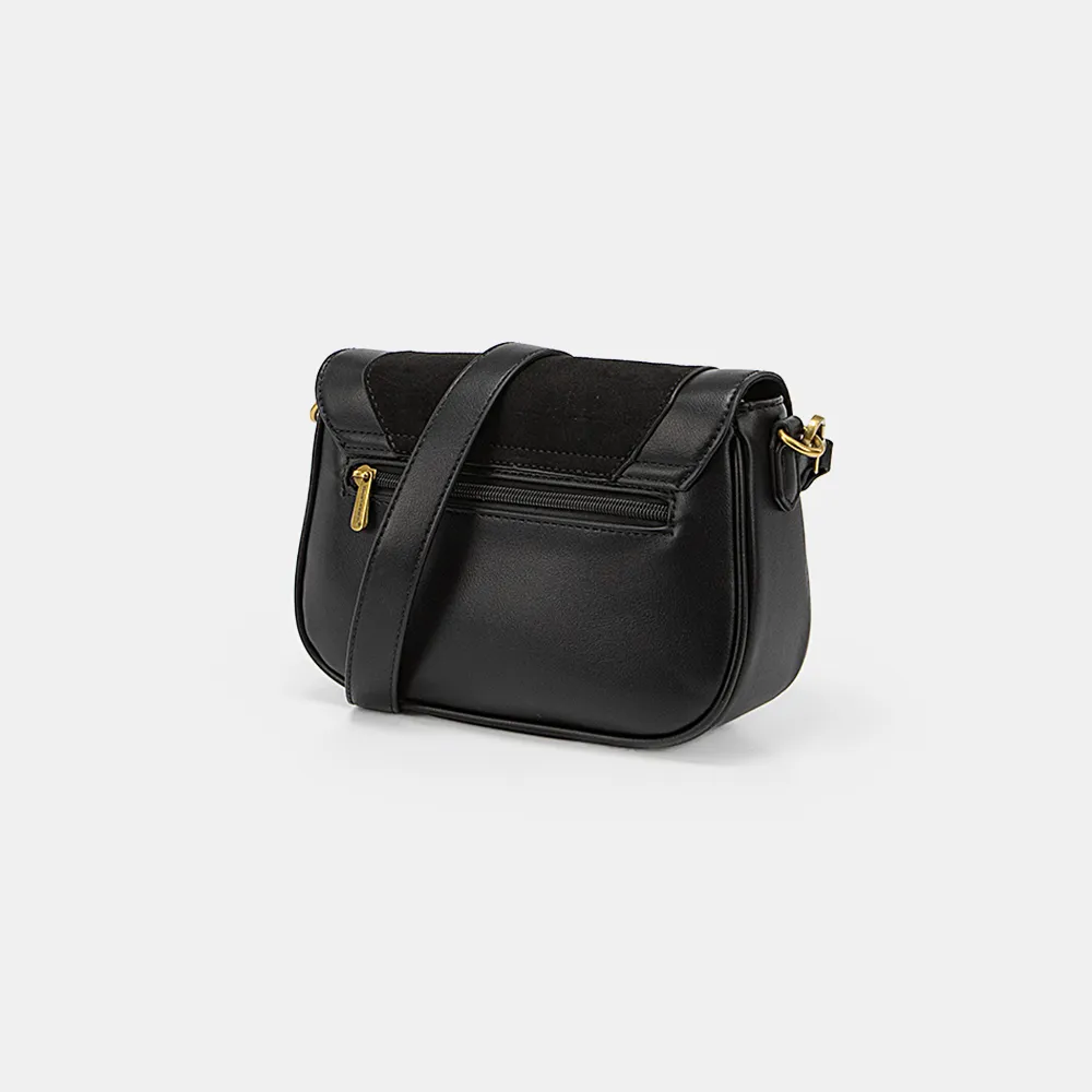 Сумка от торговой марки David Jones из искусственной кожи черного цвета. Декорирована бархатистой вставкой. Компактная модель со съемным регулируемым плечевым ремнем. Клапан на поворотном замке закрывает накладной карман и отделение на молнии. Внутри отделения: фирменная подкладка, карман на молнии, накладной карман. На задней стороне – карман на молнии.