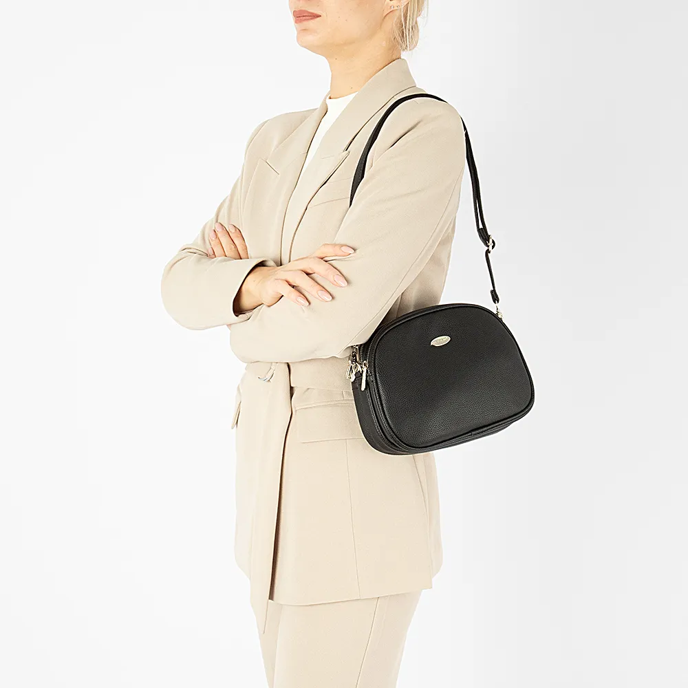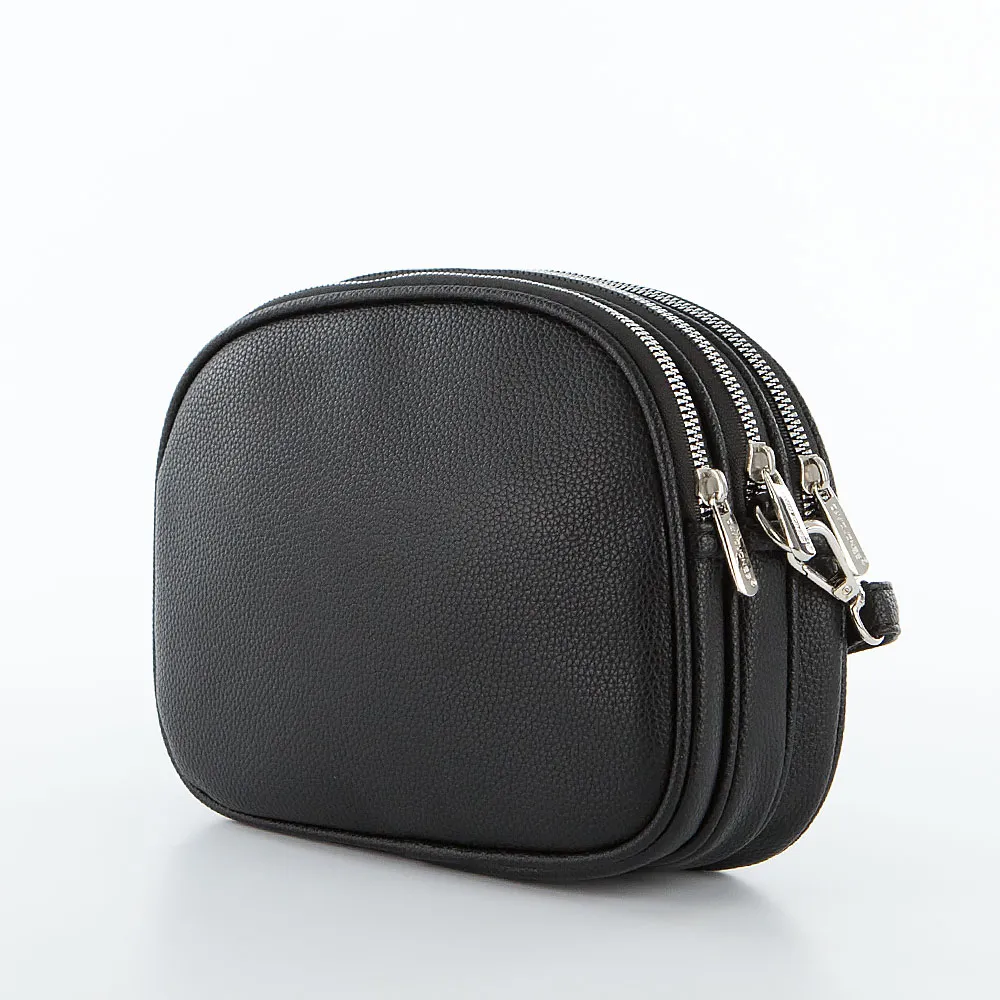 Сумка от торговой марки David Jones из искусственной кожи черного цвета. Модель со съемным регулируемым плечевым ремнем. Три отделения на молнии, с фирменной подкладкой. В заднем – карман на молнии, в переднем – накладной карман.