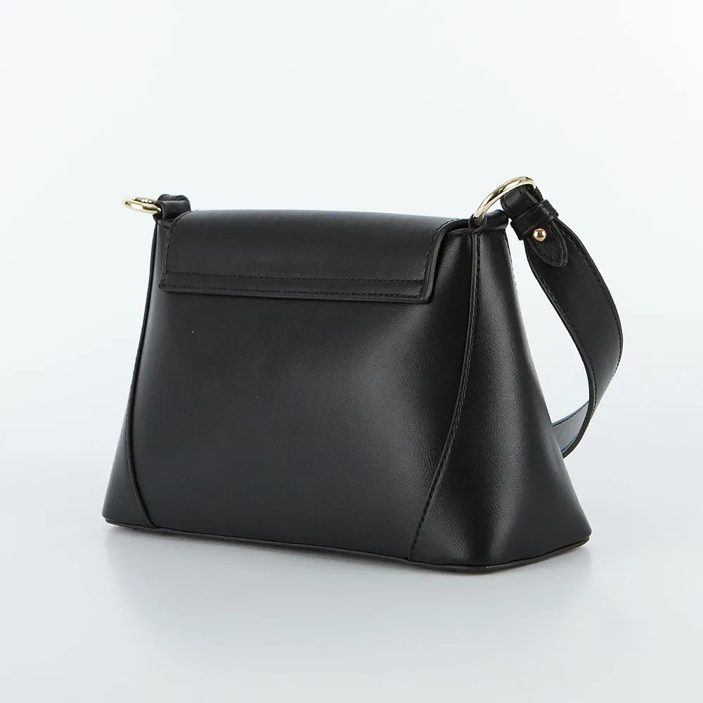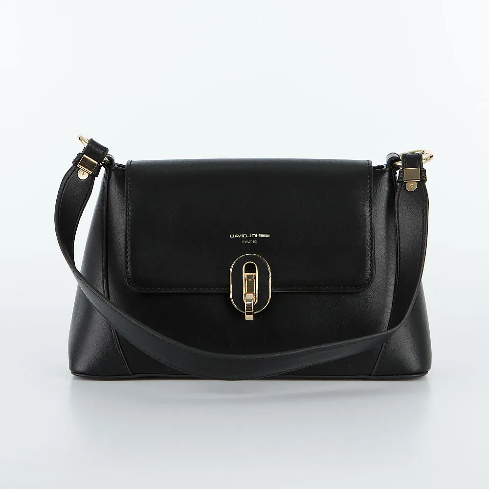 Сумка от торговой марки David Jones из искусственной кожи черного цвета. Модель с несъемной широкой удлиненной ручкой и съемным регулируемым плечевым ремнем. Закрывается клапаном на поворотном замке. Отделение на молнии. Внутри: фирменная подкладка, карман на молнии, накладной карман.