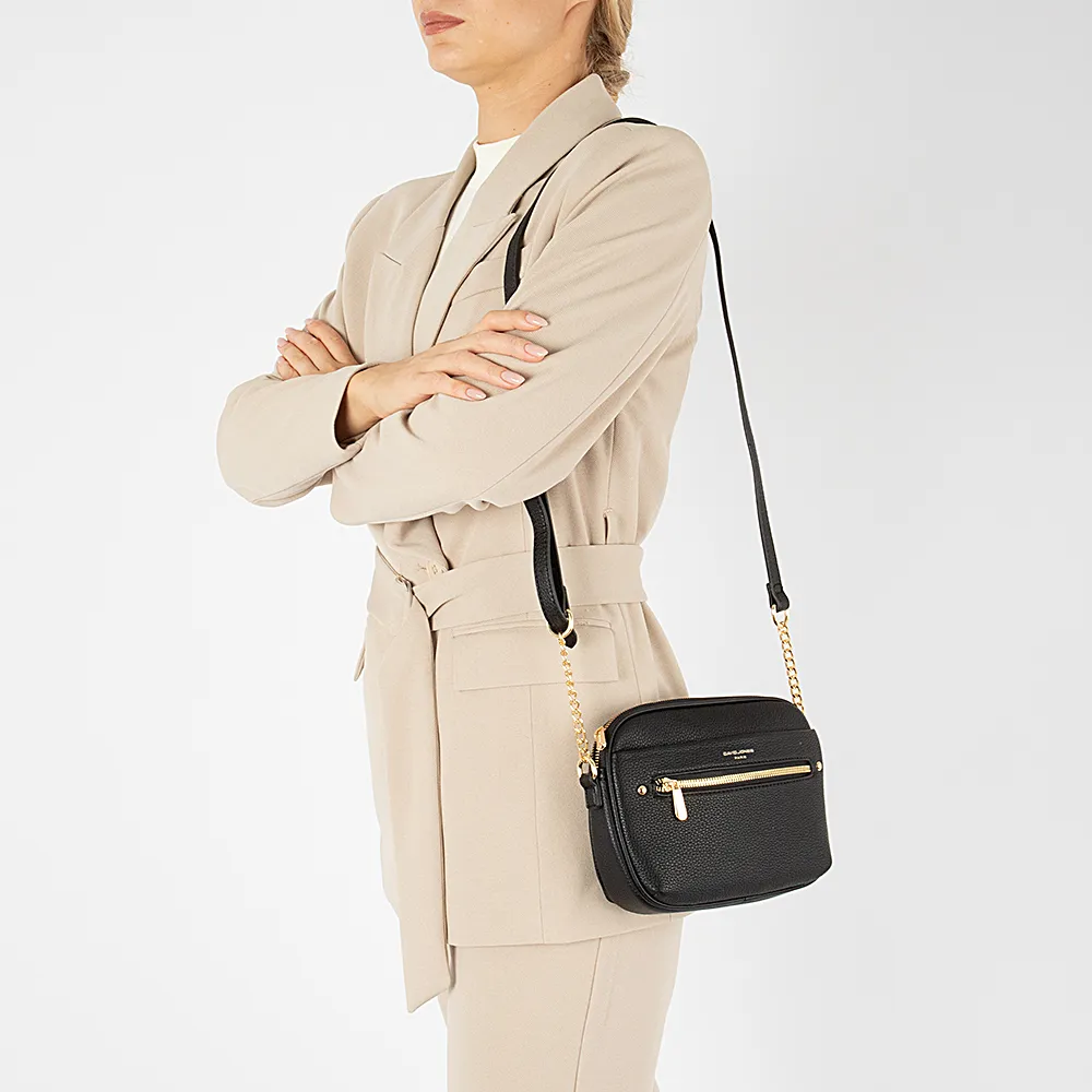 Сумка от торговой марки David Jones из искусственной кожи черного цвета. Модель с несъемным регулируемым плечевым ремнем-цепочкой. Отделение на молнии. Внутри: фирменная подкладка, карман на молнии, накладной карман. На лицевой стороне – карман на молнии, накладной карман на магнитной кнопке.