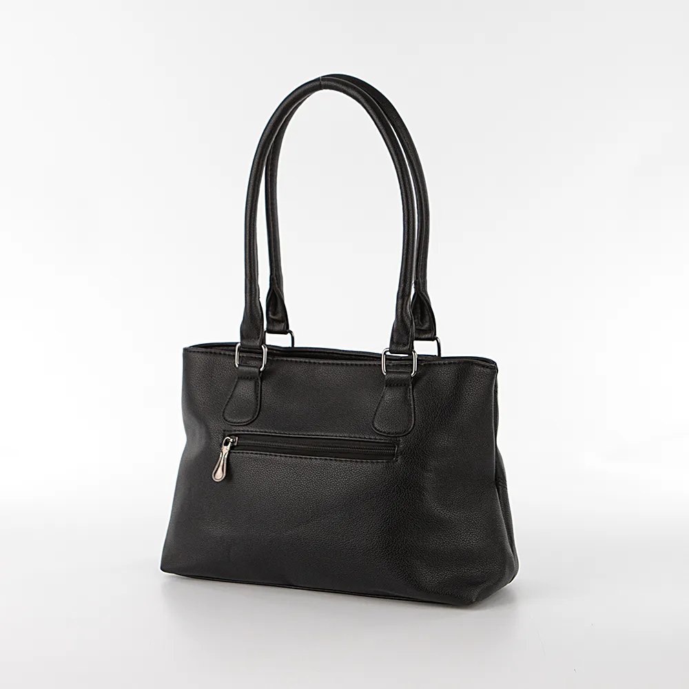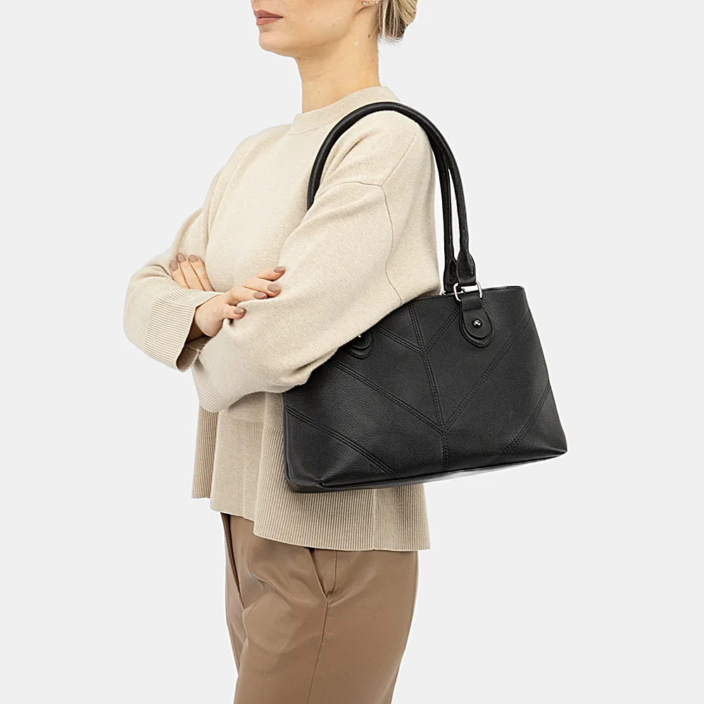 Сумка от торговой марки Passo Avanti из искусственной кожи черного цвета. Лицевая сторона декорирована отстрочкой «елочкой». Компактная модель среднего размера с двумя удлиненными ручками. Два отделения на молнии, с текстильной подкладкой. В одном отделении – карман на молнии, в другом – накладной карман. На задней стороне – карман на молнии.