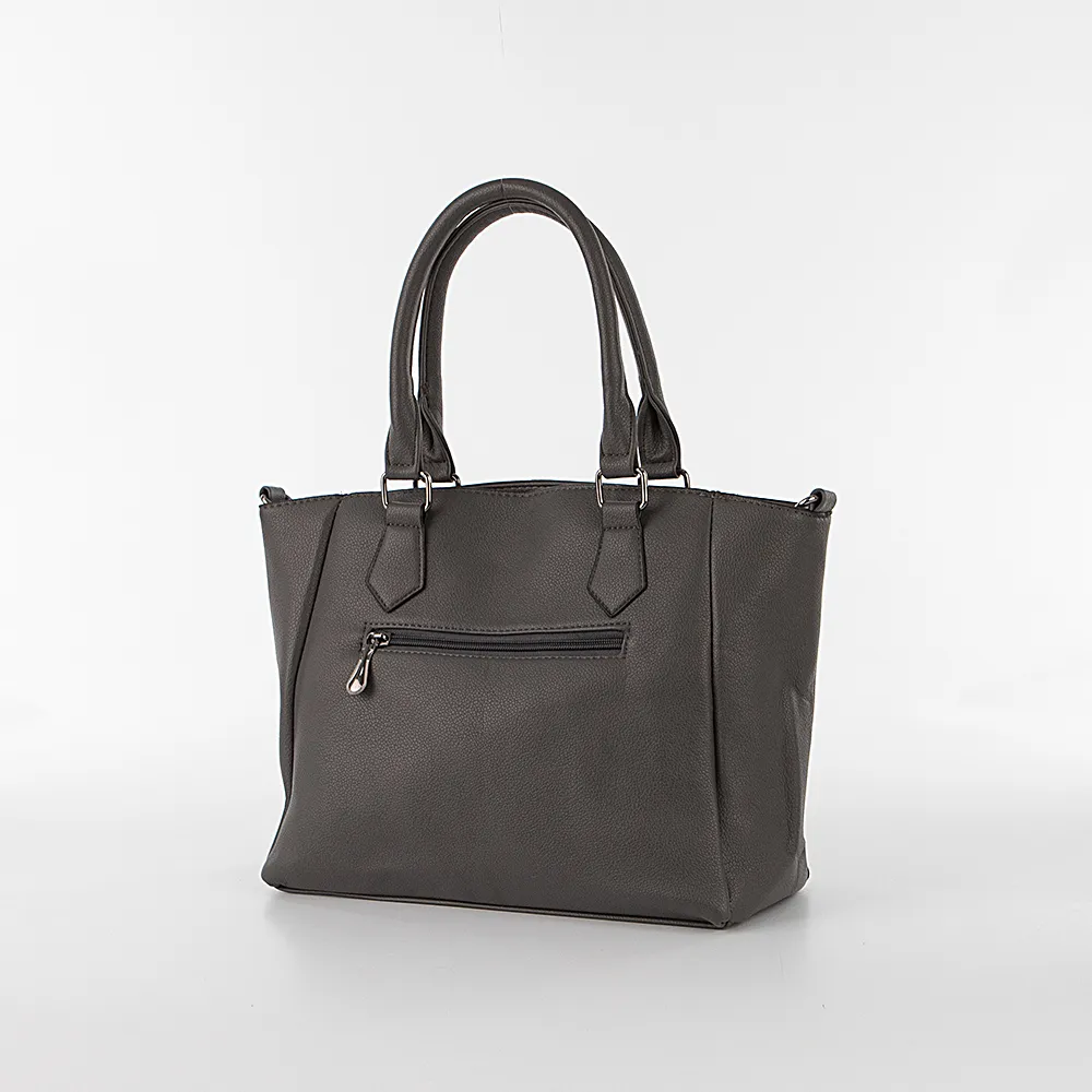 Сумка от торговой марки Passo Avanti из искусственной кожи серого цвета. Лицевая сторона декорирована отстрочкой с геометрическим рисунком. Модель с двумя ручками и съемным регулируемым плечевым ремнем. Отделение на молнии. Внутри: текстильная подкладка, средник и карман на молнии, накладной карман. На задней стороне – карман на молнии.