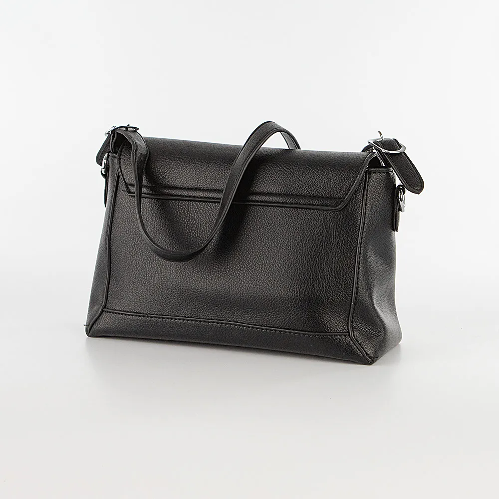 Сумка от торговой марки Passo Avanti из искусственной кожи черного цвета. Модель со съемной ручкой и съемным регулируемым плечевым ремнем. Закрывается клапаном на двух магнитных кнопках. Отделение на молнии. Внутри: текстильная подкладка, средник и карман на молнии.