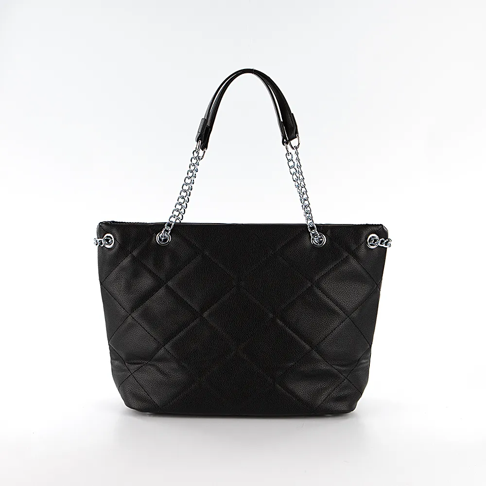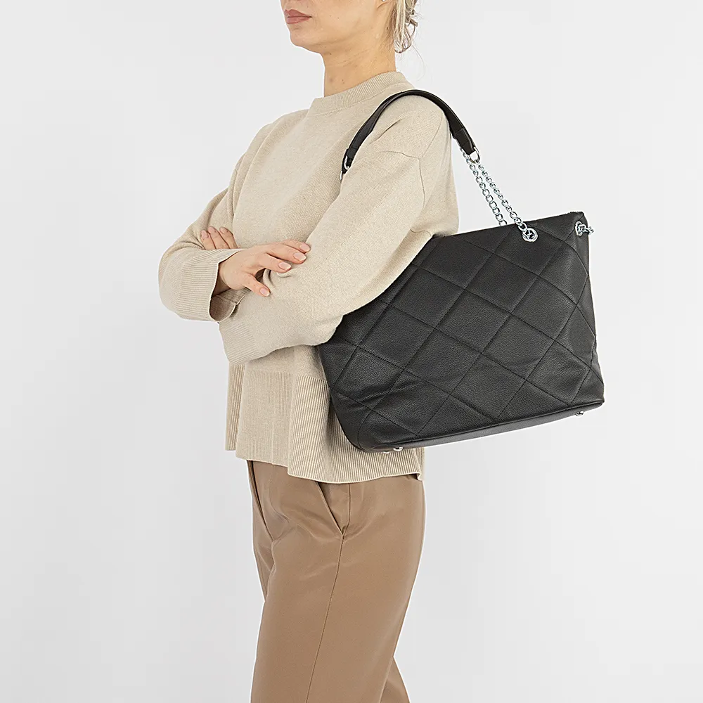 Сумка от торговой марки Passo Avanti из искусственной кожи черного цвета с ромбовидной стежкой. Модель с двумя удлиненными ручками-цепочками. Отделение на молнии. Внутри: текстильная подкладка, карман на молнии, накладной карман. Дно оснащено металлическими ножками для защиты от износа.