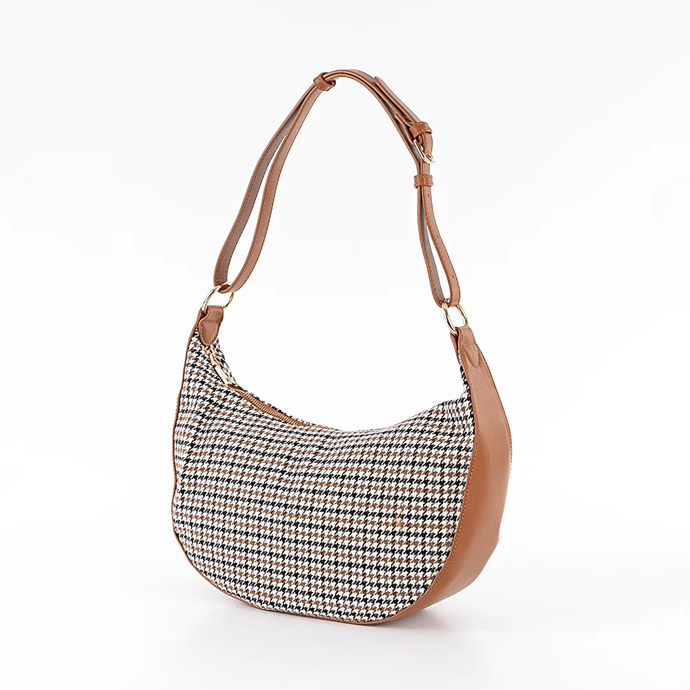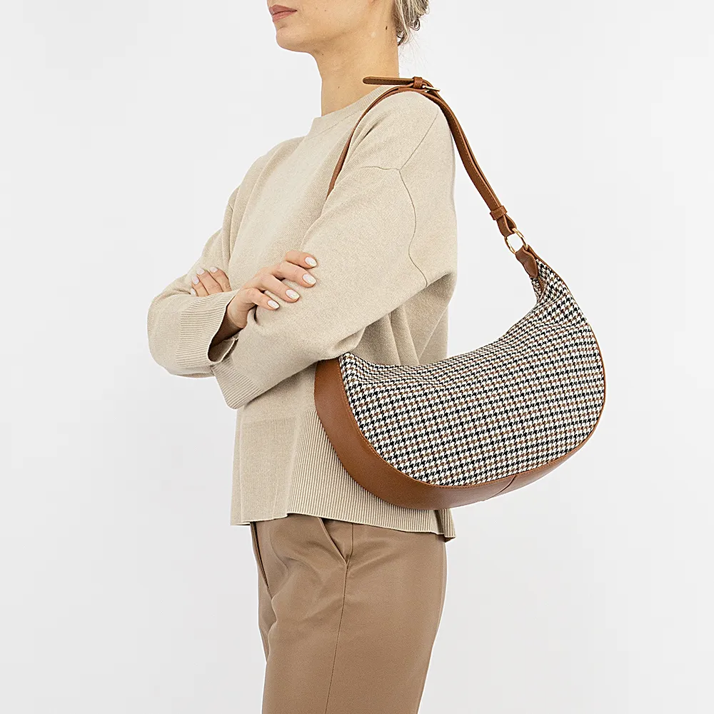 Сумка от торговой марки Marzia из текстильного материала с принтом «в клетку» и искусственной кожи коричневого цвета. Модель с регулируемой ручкой-ремнем. Отделение на молнии. Внутри: текстильная подкладка, карман на молнии, накладной карман.